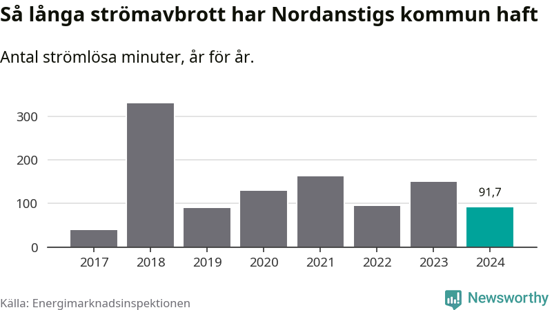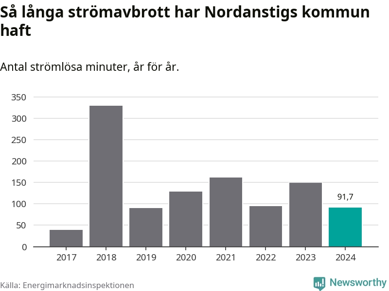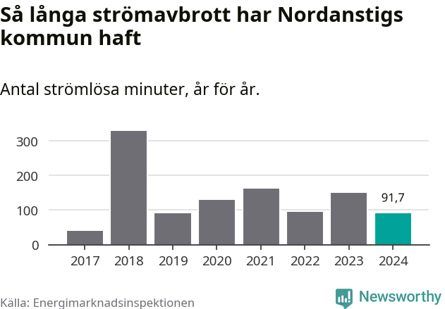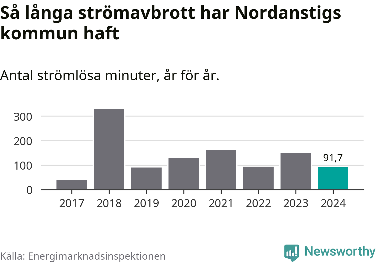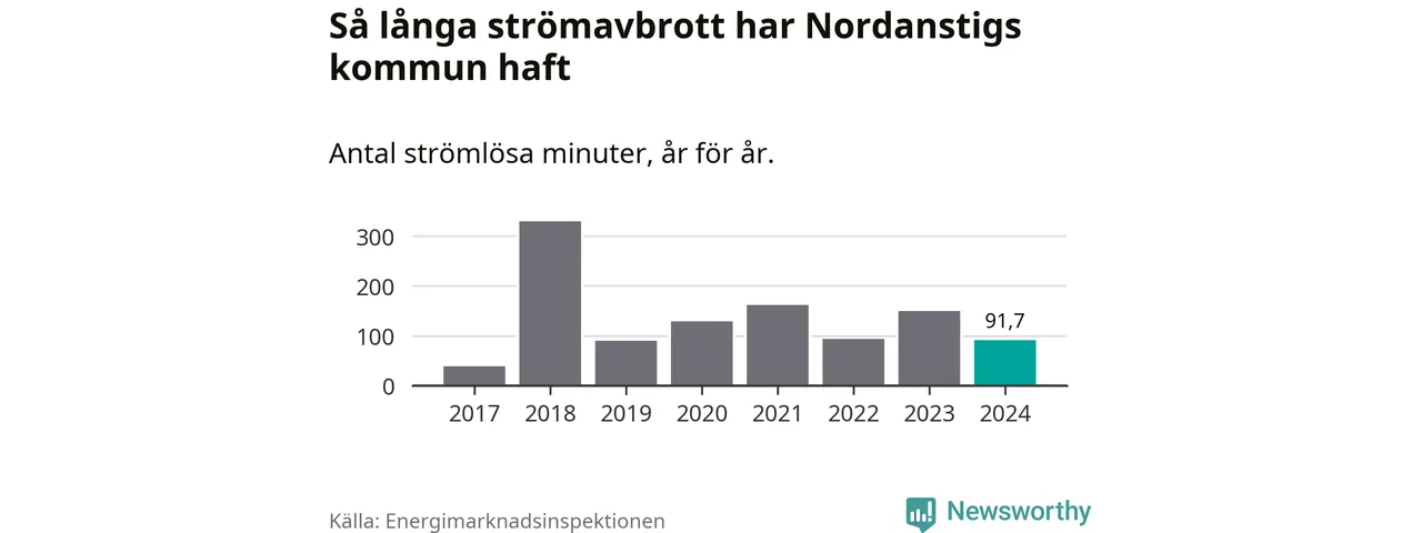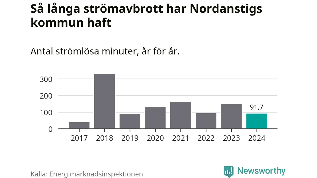 Antalet strömavbrott och total strömlös tid varierar från år till år i Nordanstigs kommun. Mest tid utan ström (i alla fall under perioden 2017–2024) fick Nordanstigsborna genomleva under 2018 – fem timmar och 30 minuter. Det är ungefär lika lång tid som det tar att se hela ”Tillbaka till framtiden”-trilogin.