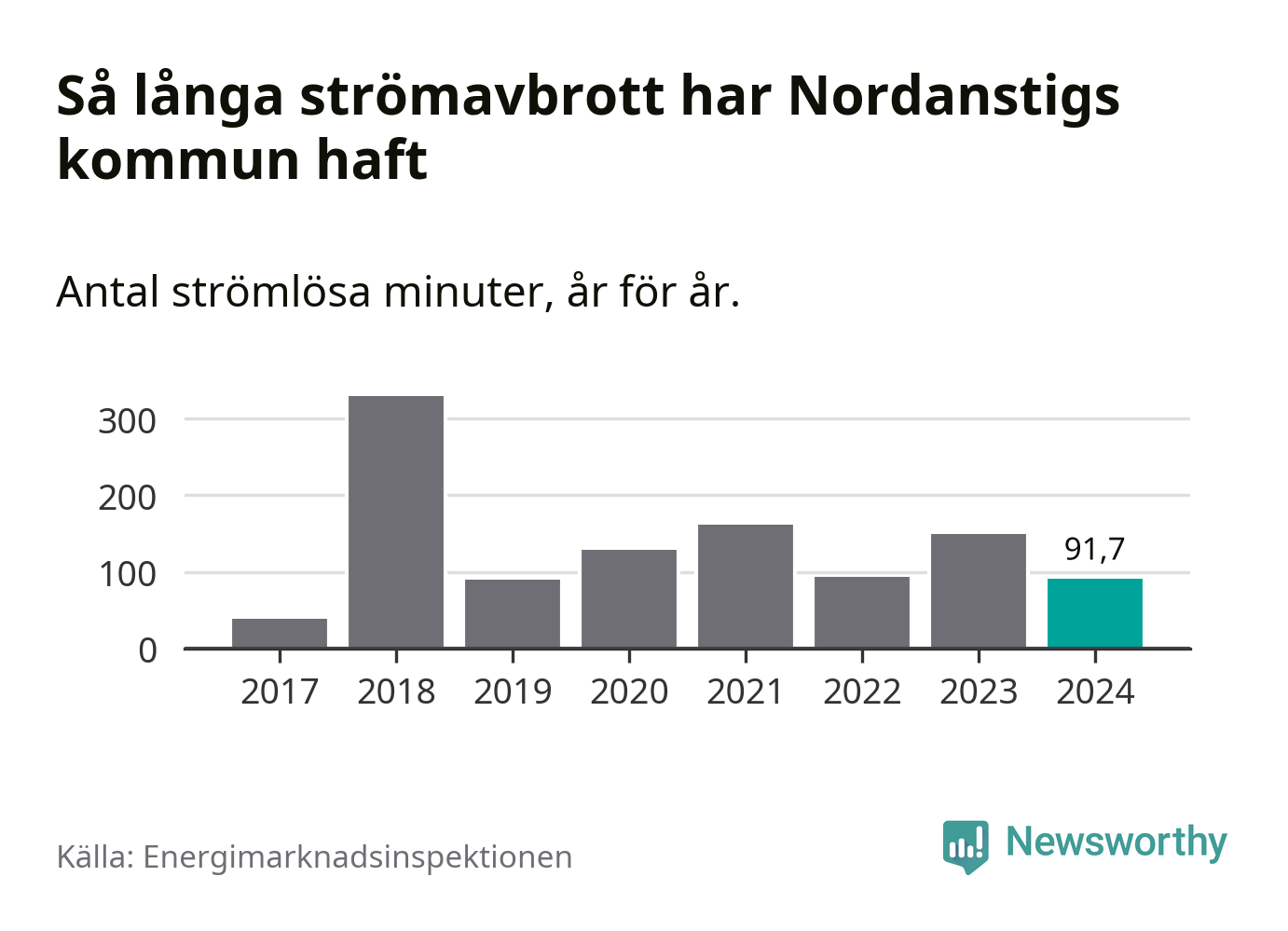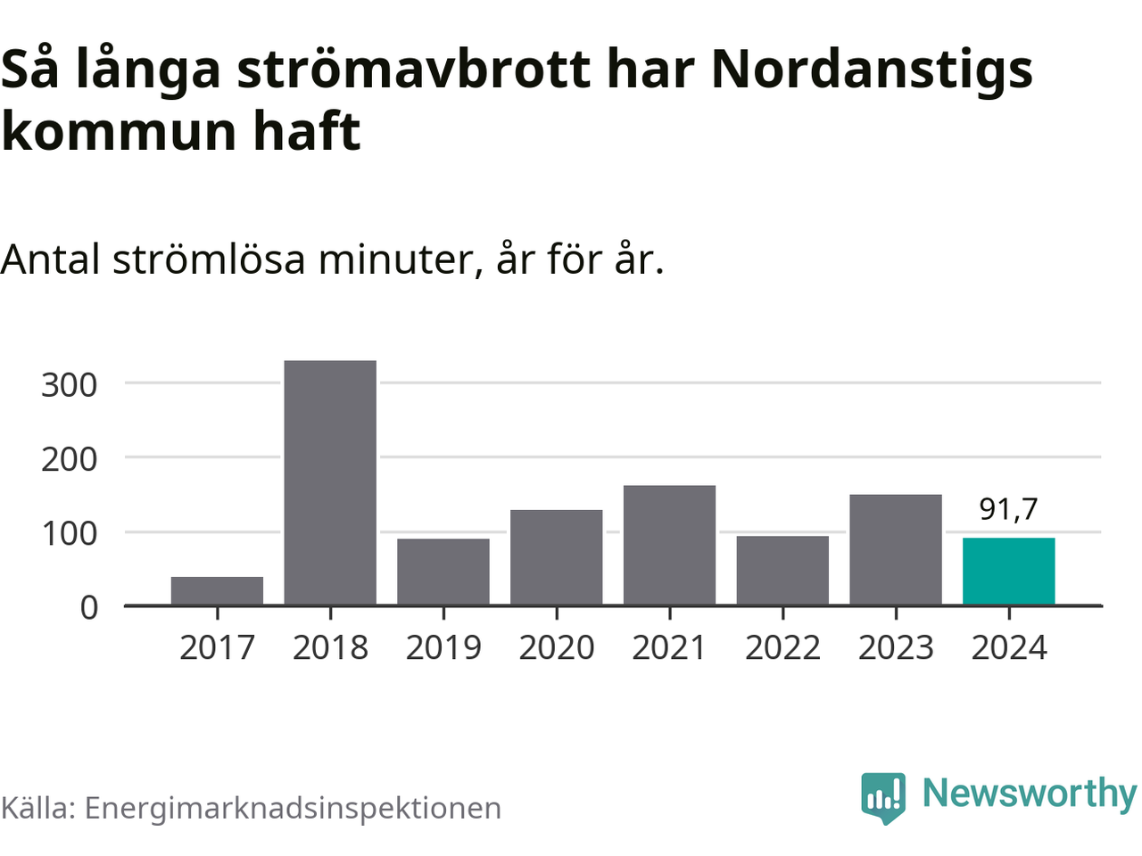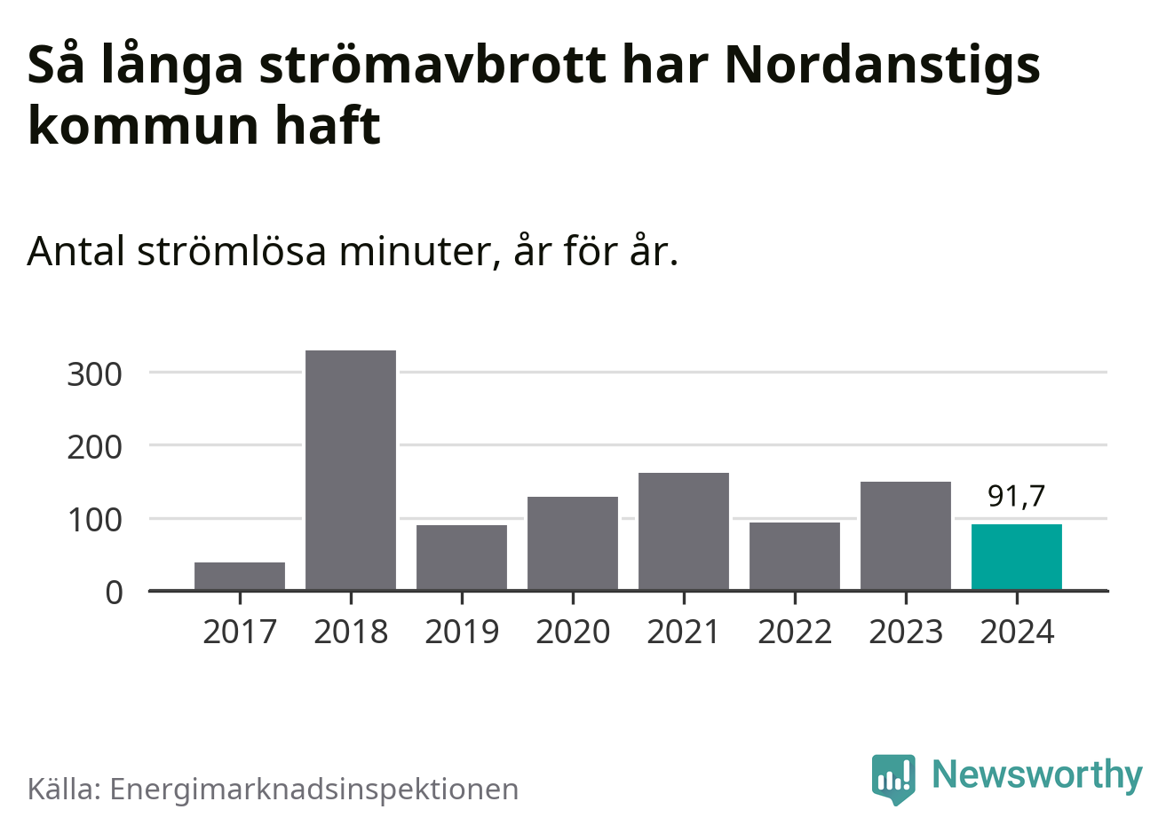 Antalet strömavbrott och total strömlös tid varierar från år till år i Nordanstigs kommun. Mest tid utan ström (i alla fall under perioden 2017–2024) fick Nordanstigsborna genomleva under 2018 – fem timmar och 30 minuter. Det är ungefär lika lång tid som det tar att se hela ”Tillbaka till framtiden”-trilogin.