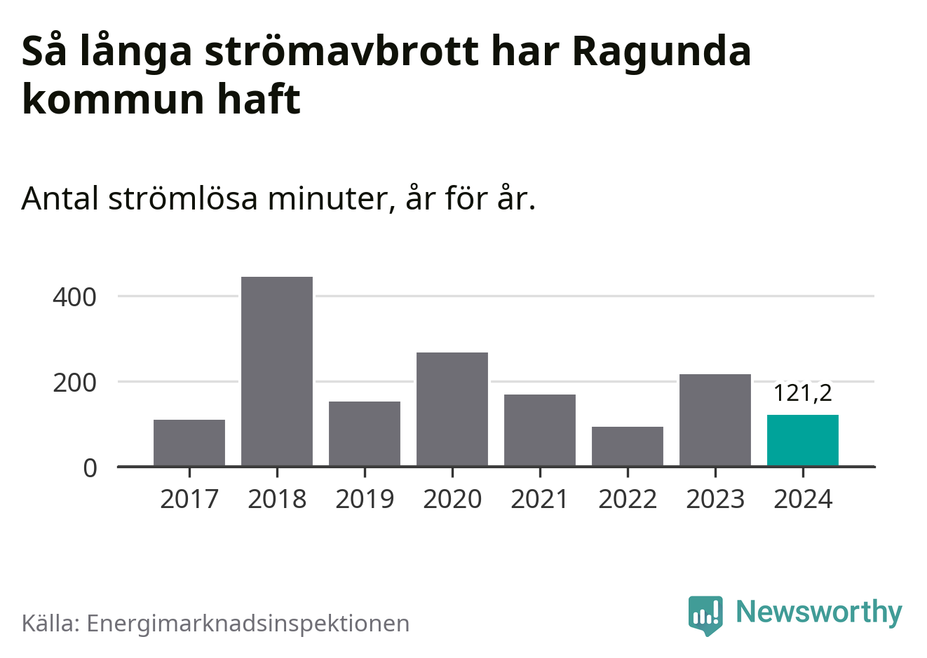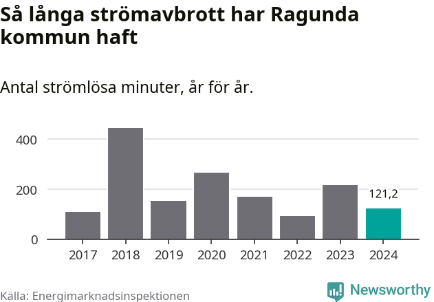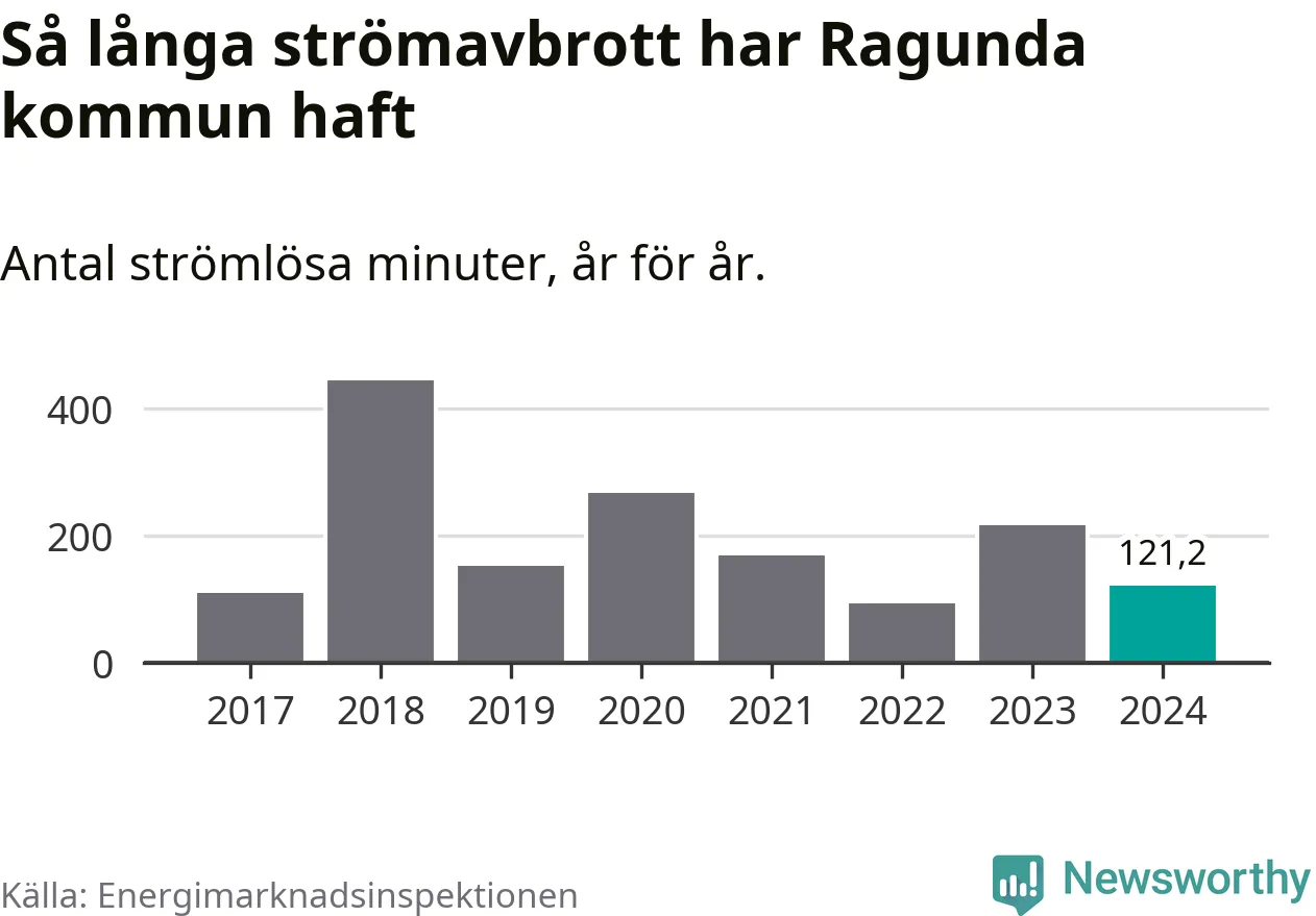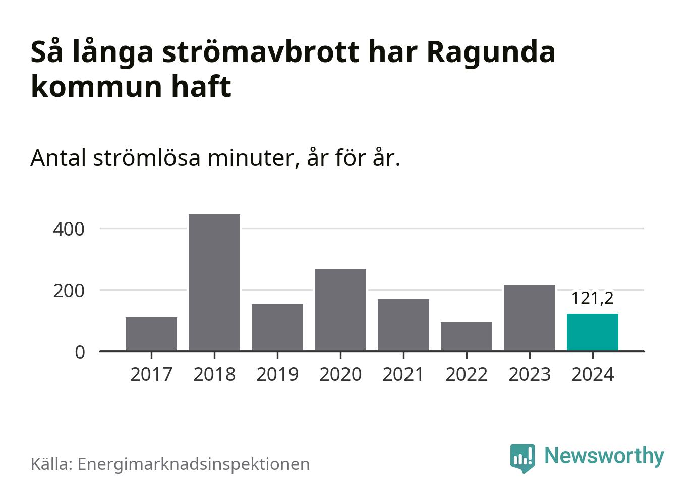 Antalet strömavbrott och total strömlös tid varierar från år till år i Ragunda kommun. Mest tid utan ström (i alla fall under perioden 2017–2024) fick Ragundaborna genomleva under 2018 – sju timmar och 24 minuter. Det är fyra timmar och 44 minuter längre än under ett normalår.