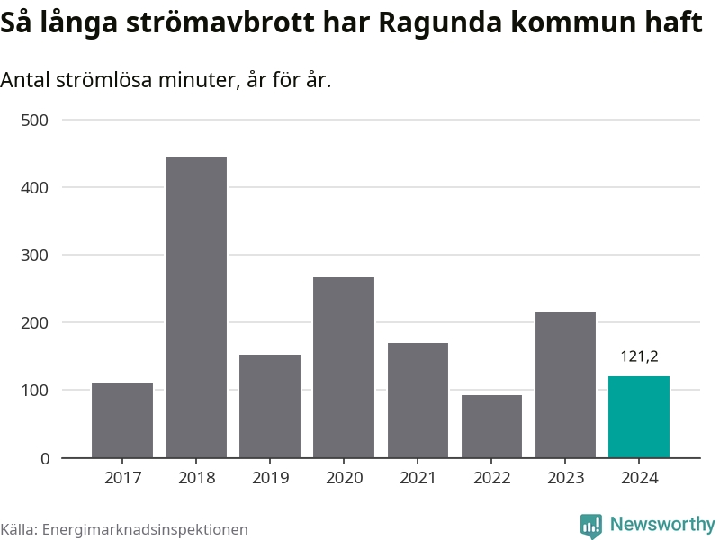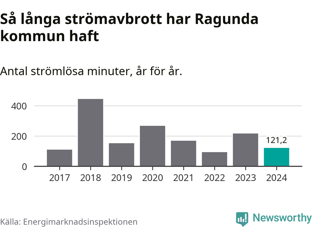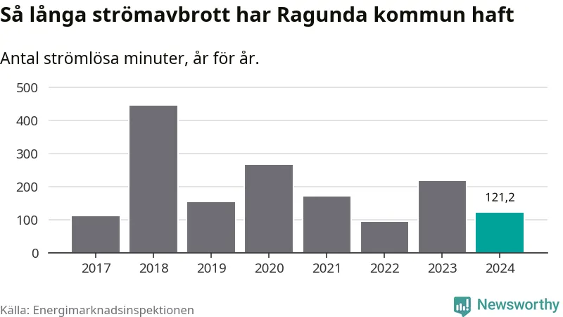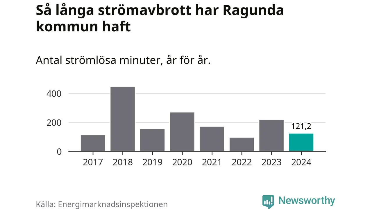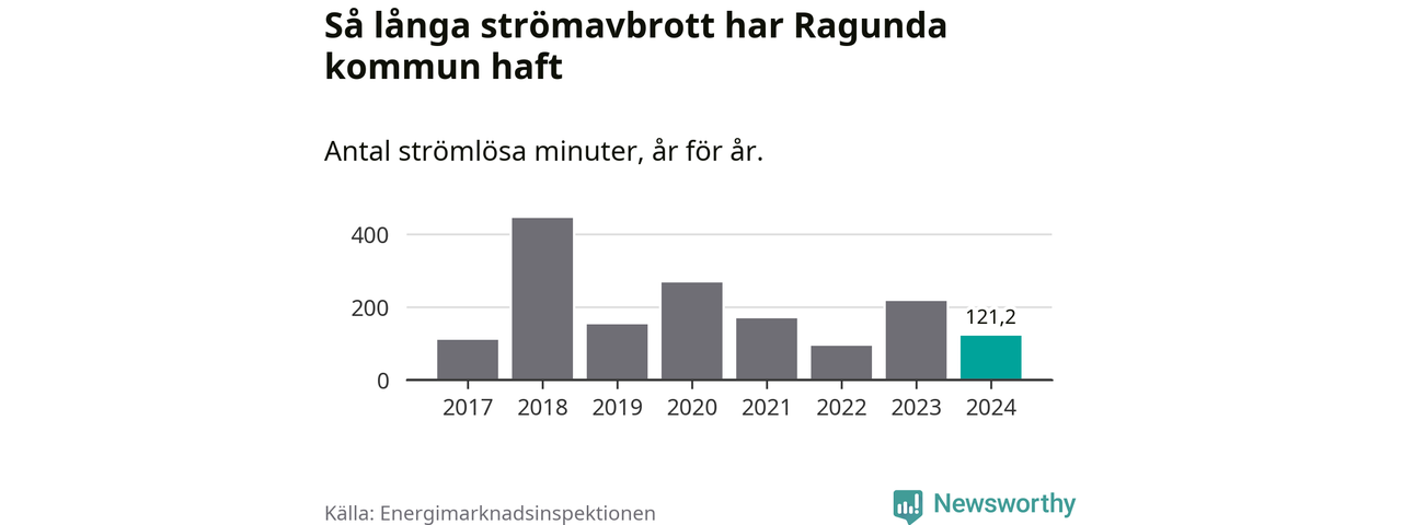 Antalet strömavbrott och total strömlös tid varierar från år till år i Ragunda kommun. Mest tid utan ström (i alla fall under perioden 2017–2024) fick Ragundaborna genomleva under 2018 – sju timmar och 24 minuter. Det är fyra timmar och 44 minuter längre än under ett normalår.