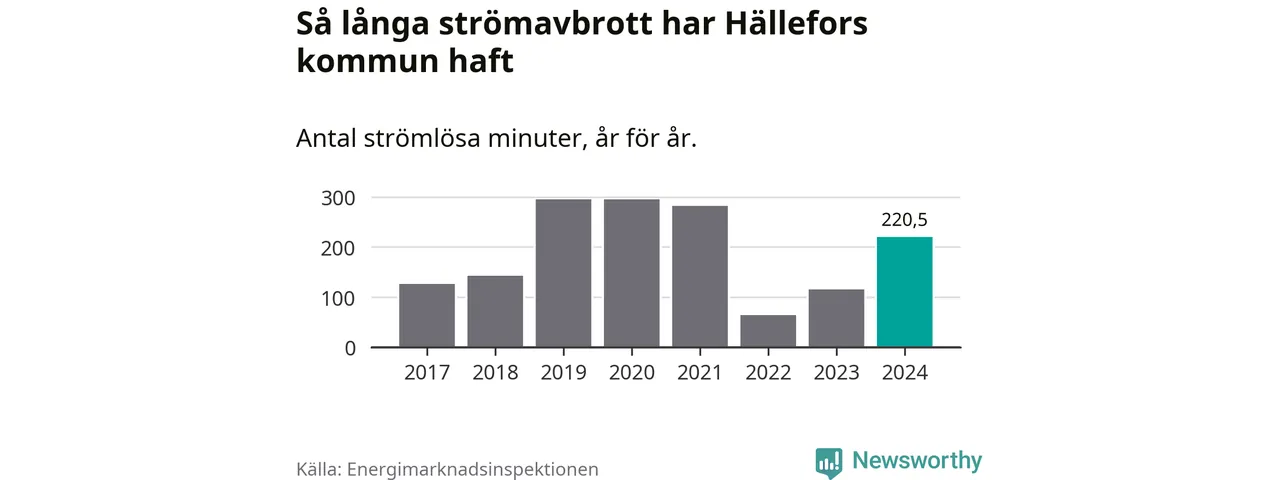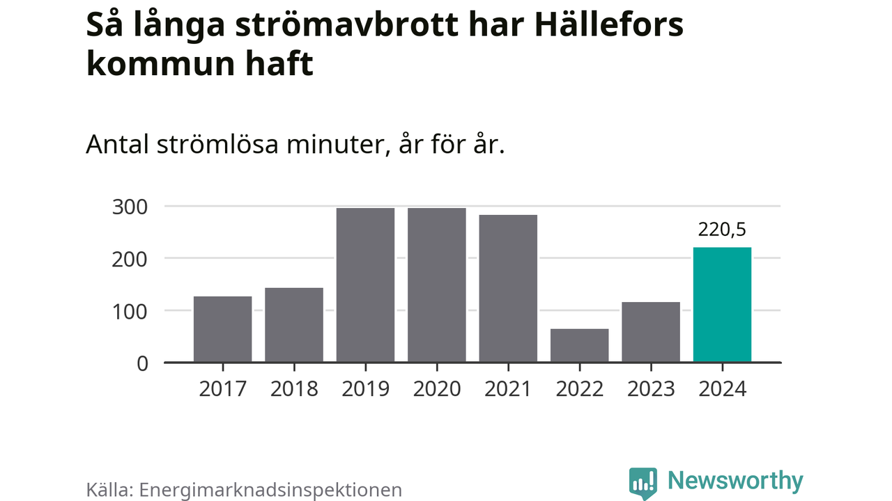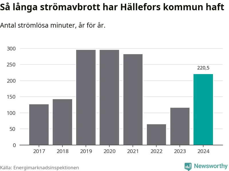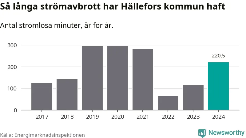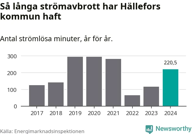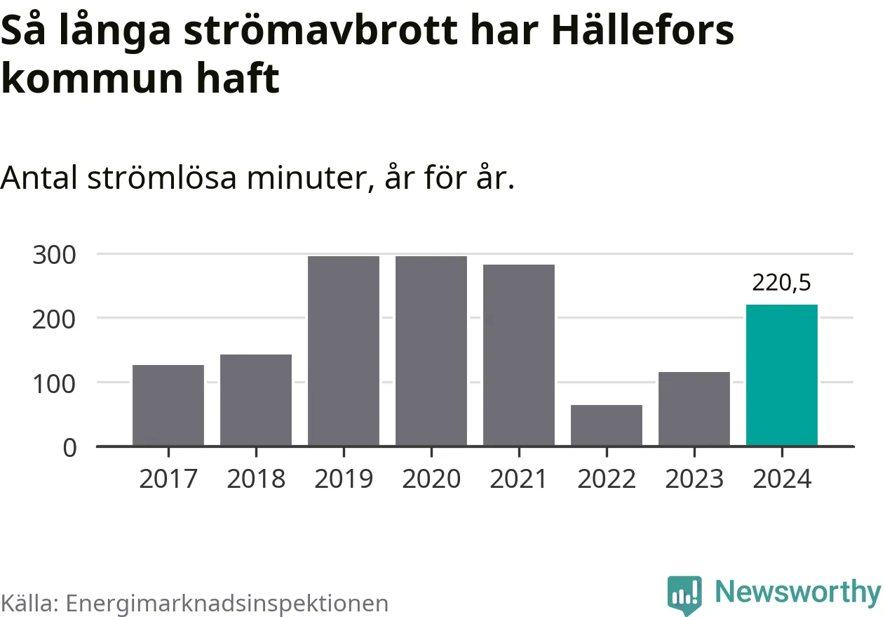 Antalet strömavbrott och total strömlös tid varierar något från år till år i Hällefors kommun. Mest tid utan ström (i alla fall under perioden 2017–2024) fick Hälleforsborna genomleva under 2019 – fyra timmar och 55 minuter. Det är en timme och 54 minuter längre än under ett normalår.