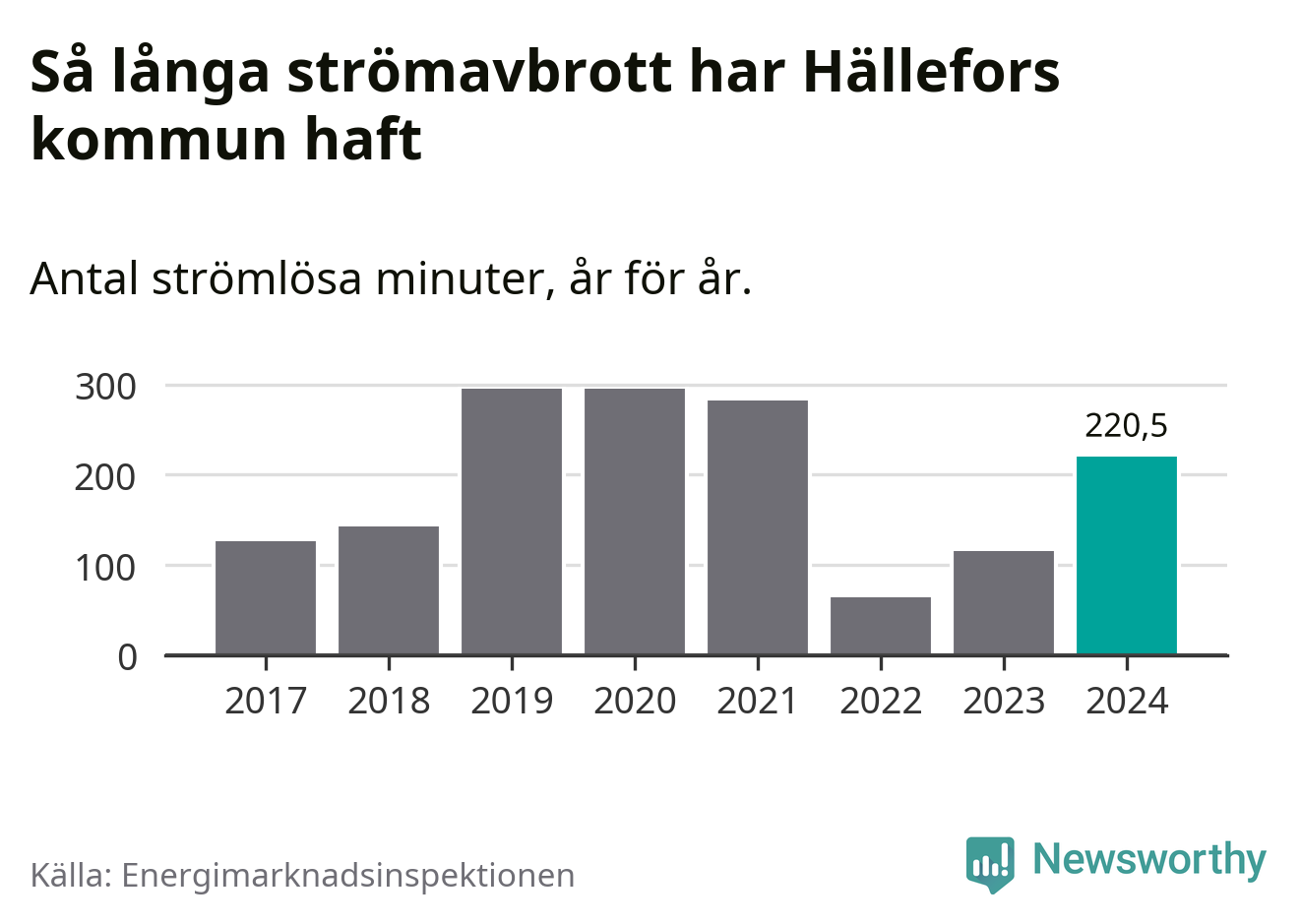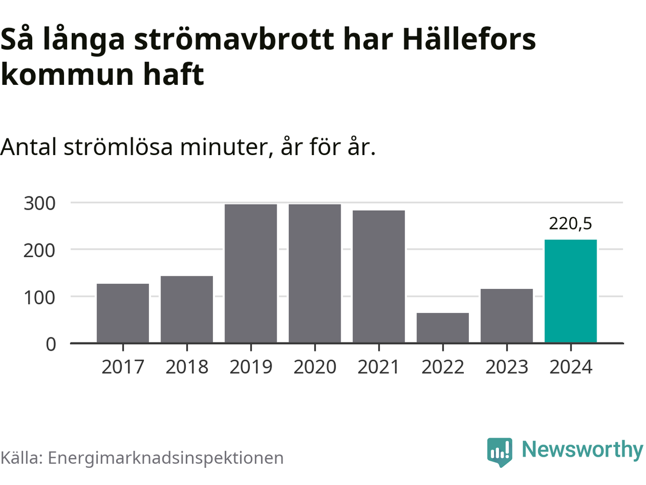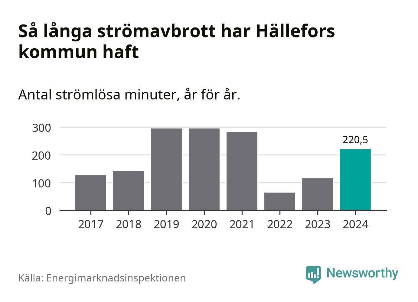 Antalet strömavbrott och total strömlös tid varierar något från år till år i Hällefors kommun. Mest tid utan ström (i alla fall under perioden 2017–2024) fick Hälleforsborna genomleva under 2019 – fyra timmar och 55 minuter. Det är en timme och 54 minuter längre än under ett normalår.