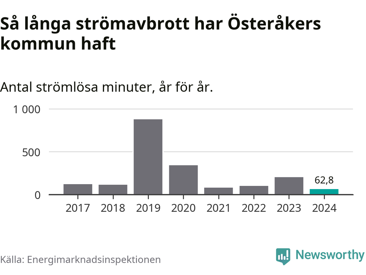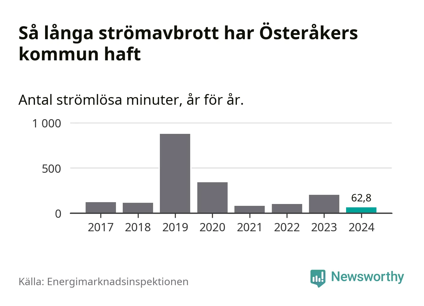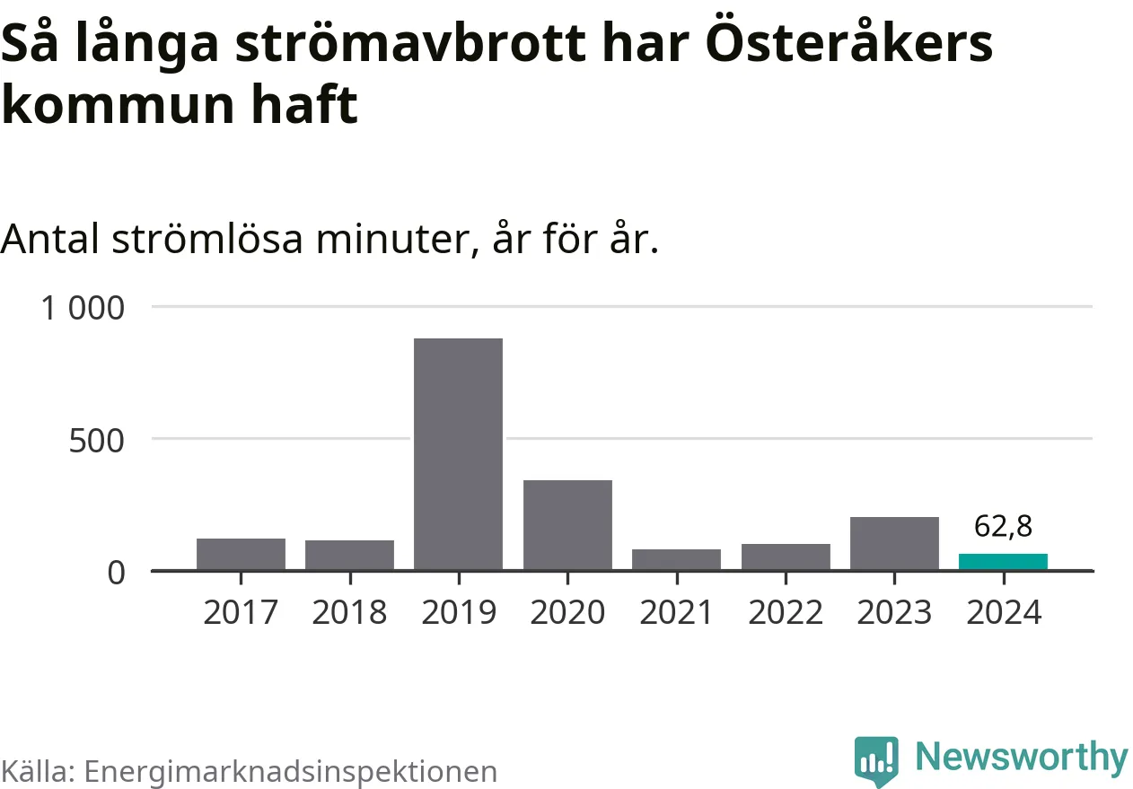 Antalet strömavbrott och total strömlös tid varierar från år till år i Österåkers kommun. Mest tid utan ström (i alla fall under perioden 2017–2024) fick Österåkersborna genomleva under 2019 – 14 timmar och 38 minuter. Det är tolv timmar och 39 minuter längre än under ett normalår.