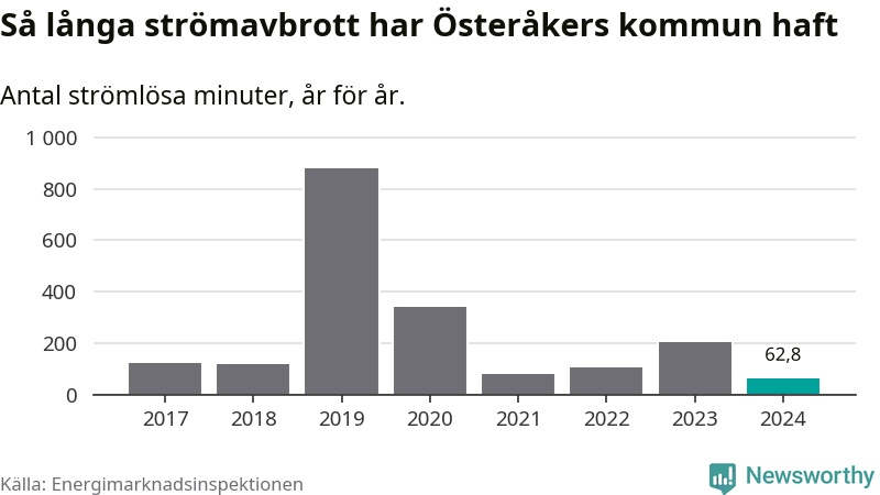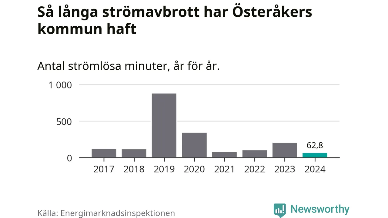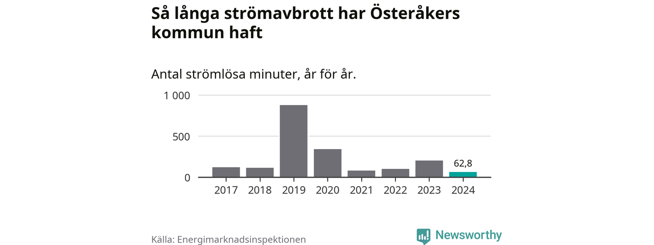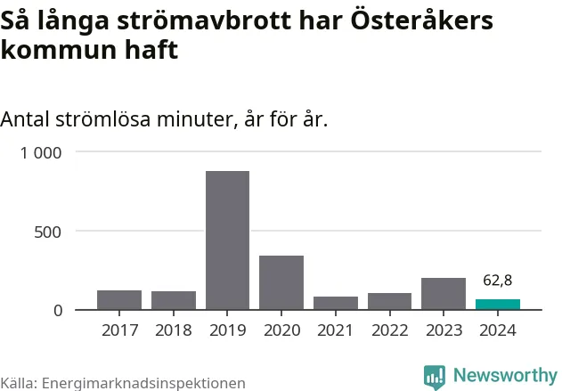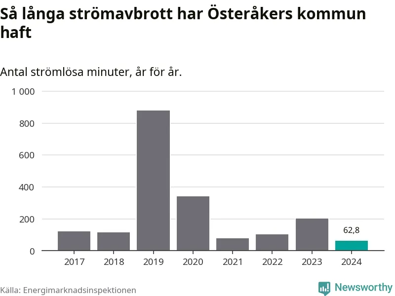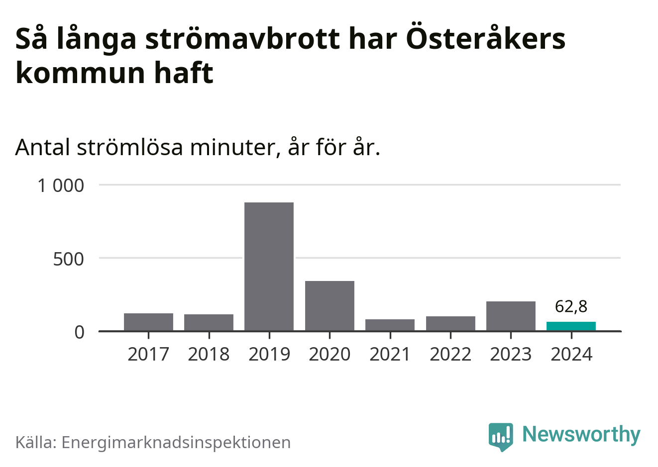 Antalet strömavbrott och total strömlös tid varierar från år till år i Österåkers kommun. Mest tid utan ström (i alla fall under perioden 2017–2024) fick Österåkersborna genomleva under 2019 – 14 timmar och 38 minuter. Det är tolv timmar och 39 minuter längre än under ett normalår.