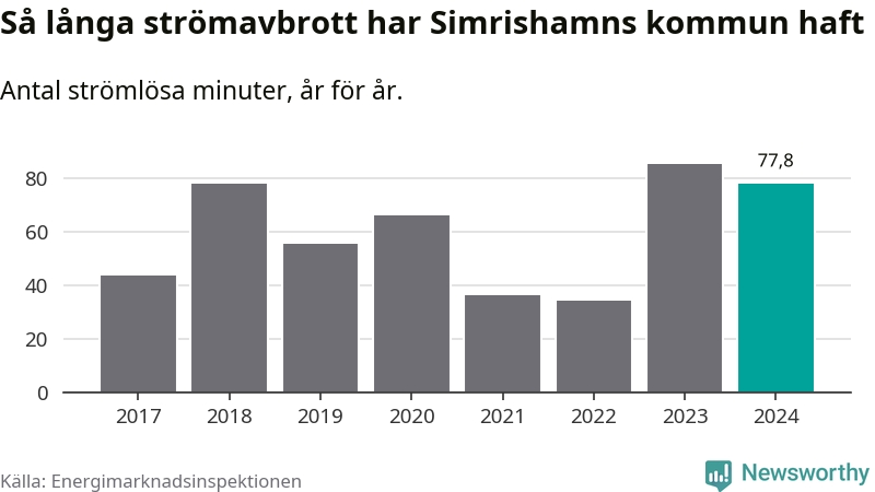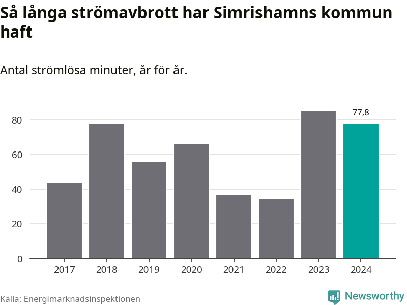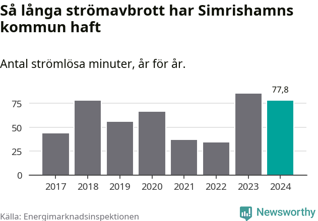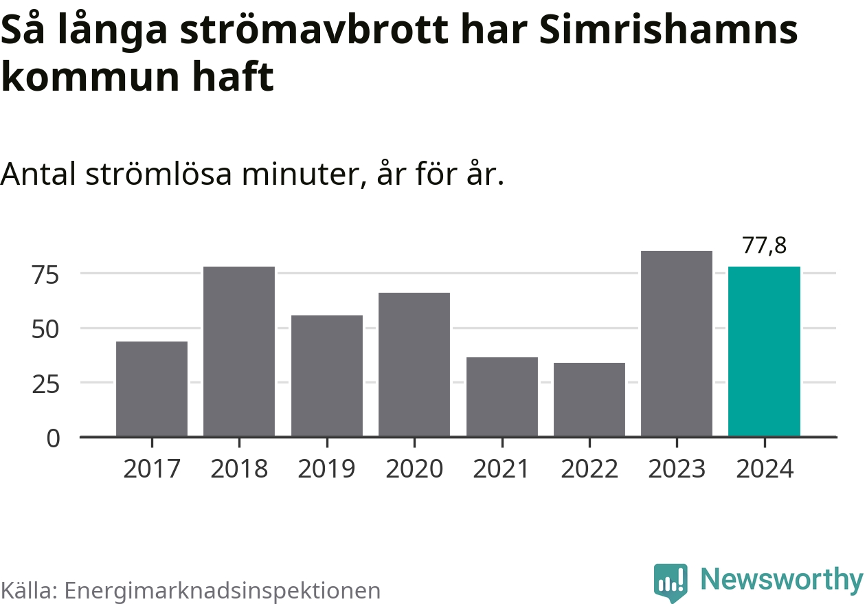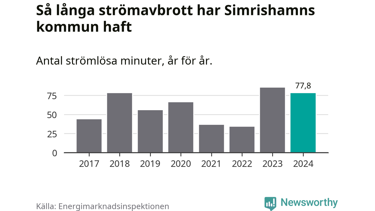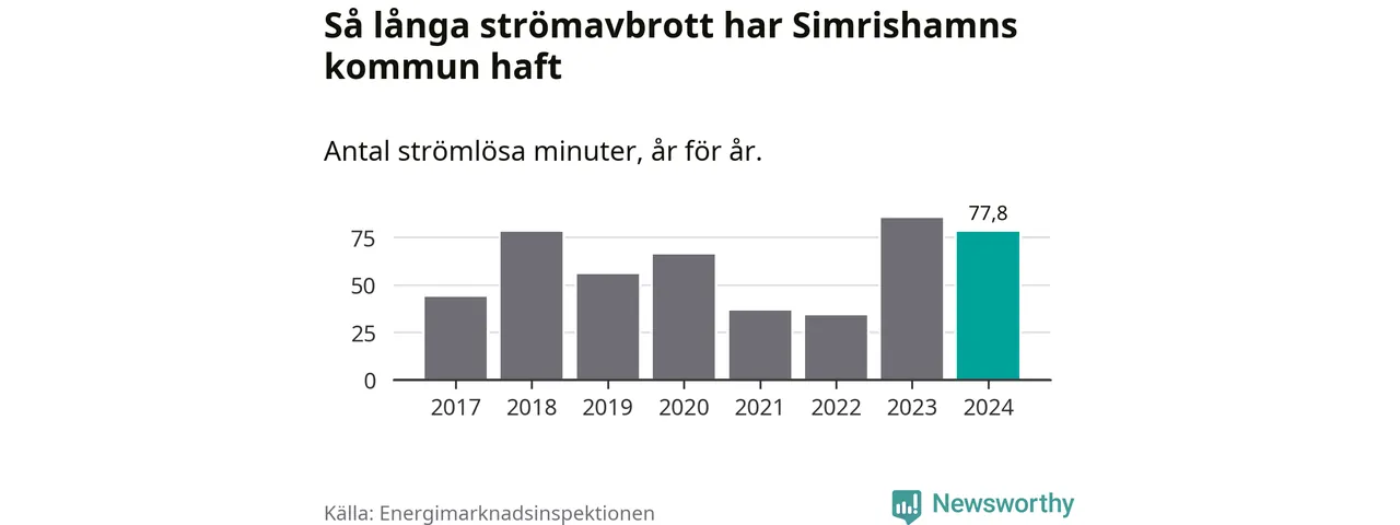 Antalet strömavbrott och total strömlös tid varierar något från år till år i Simrishamns kommun. Mest tid utan ström (i alla fall under perioden 2017–2024) fick Simrishamnsborna genomleva under 2023 – en timme och 25 minuter. Det är 24 minuter längre än under ett normalår.