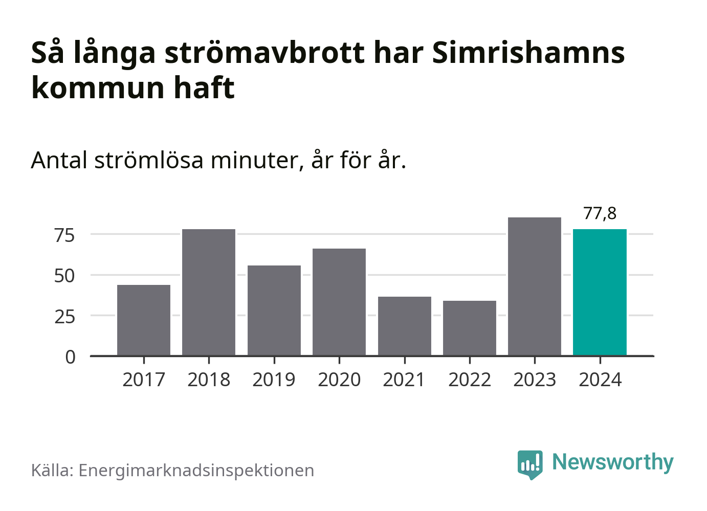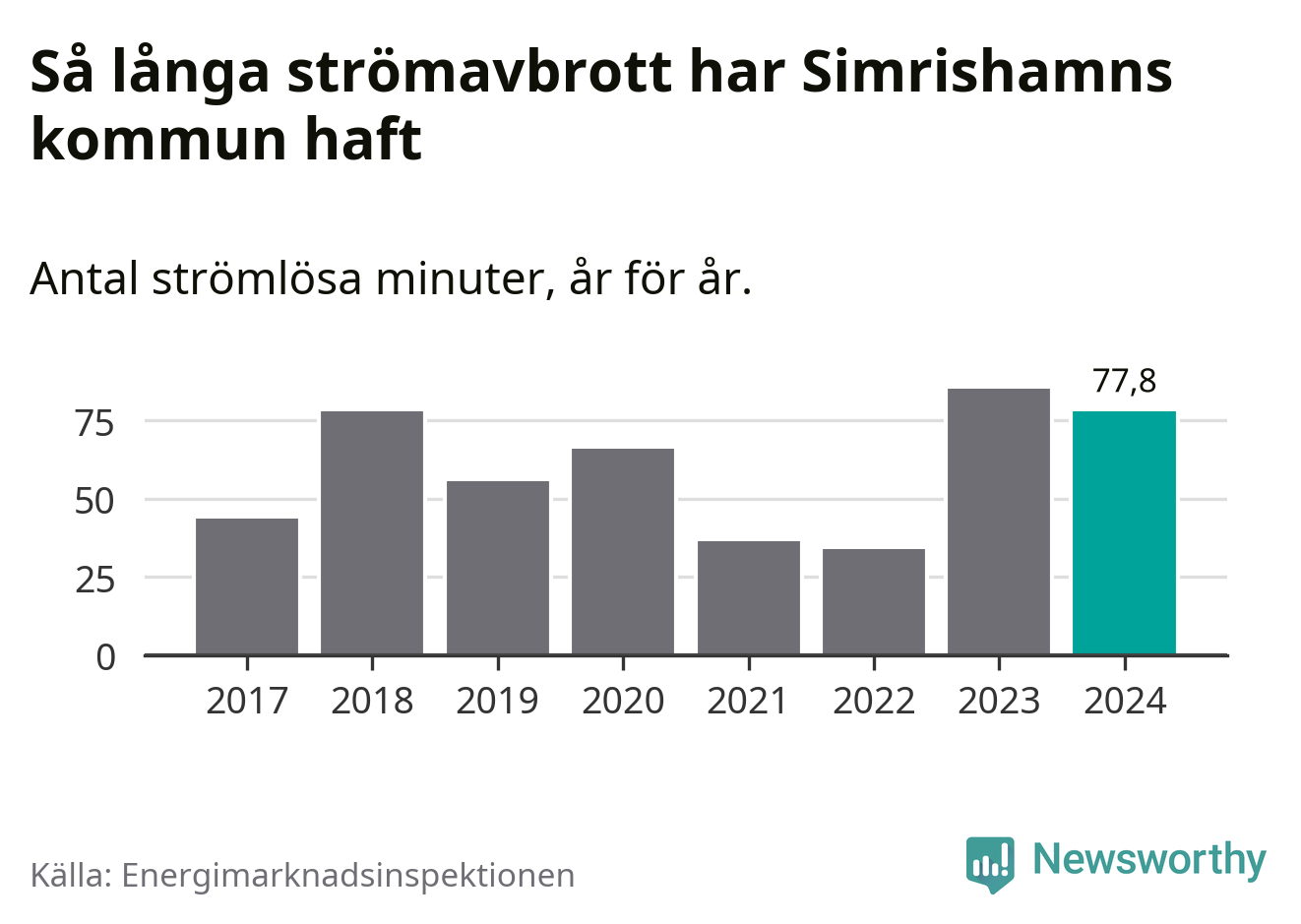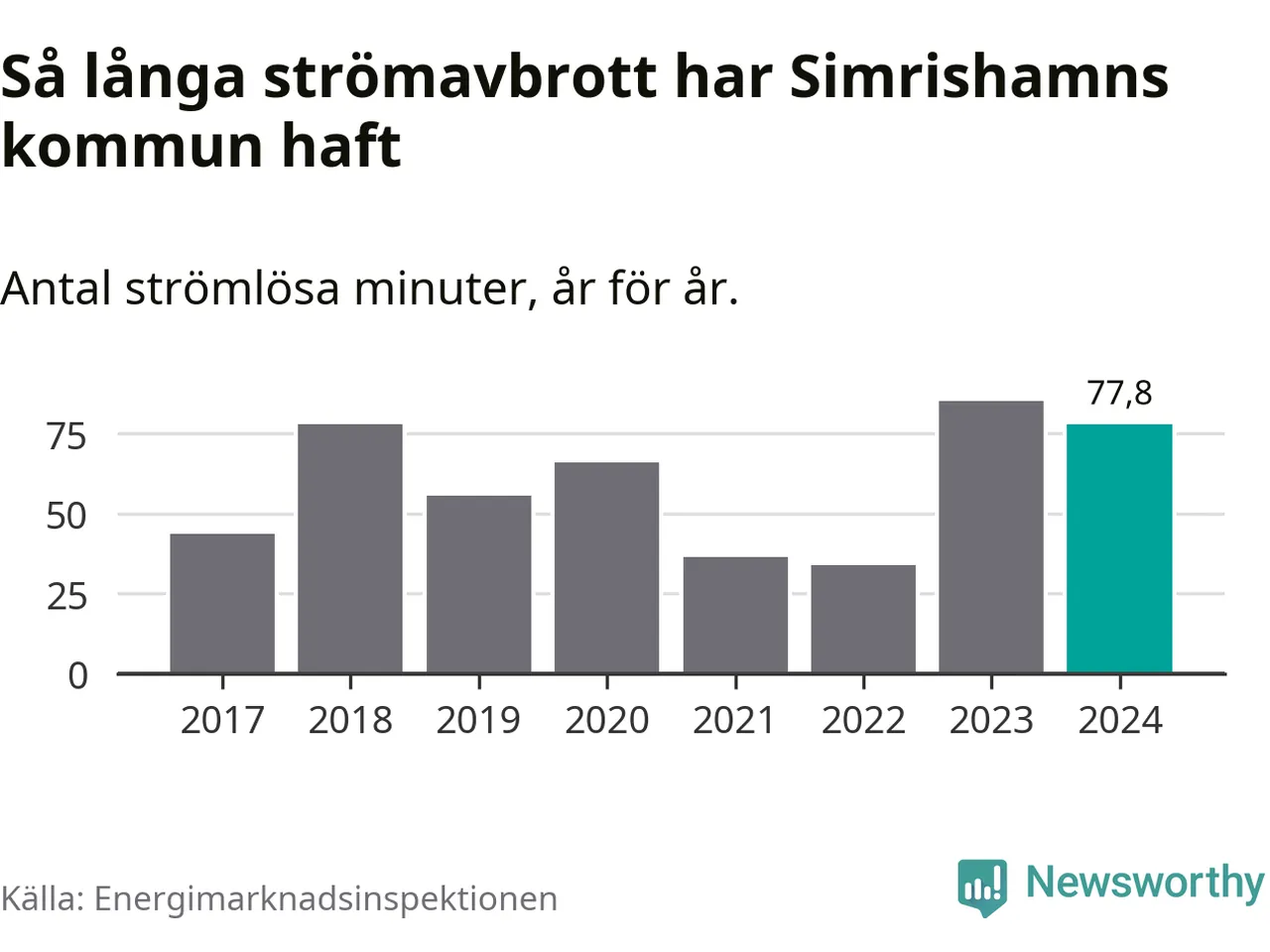 Antalet strömavbrott och total strömlös tid varierar något från år till år i Simrishamns kommun. Mest tid utan ström (i alla fall under perioden 2017–2024) fick Simrishamnsborna genomleva under 2023 – en timme och 25 minuter. Det är 24 minuter längre än under ett normalår.