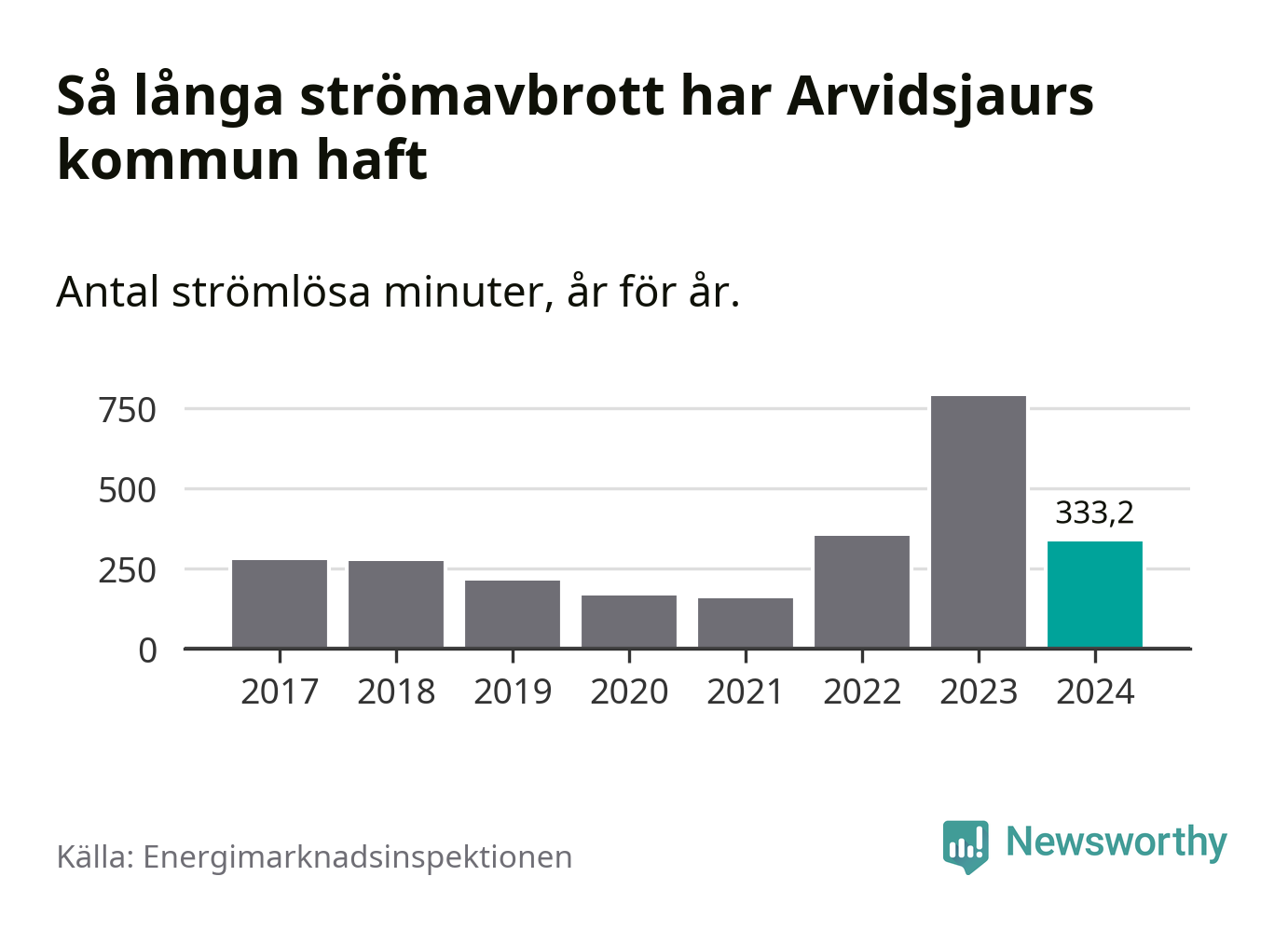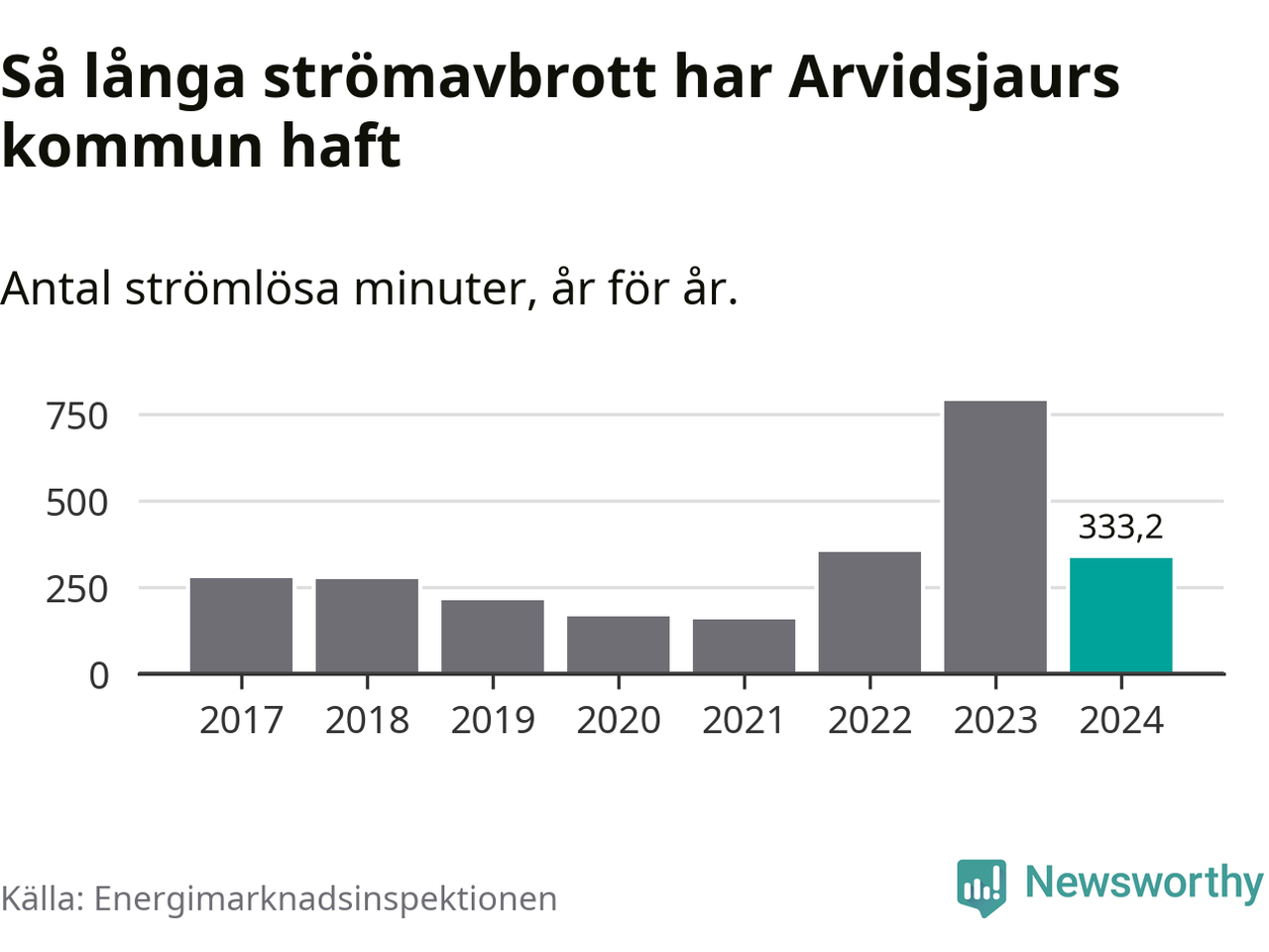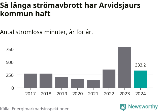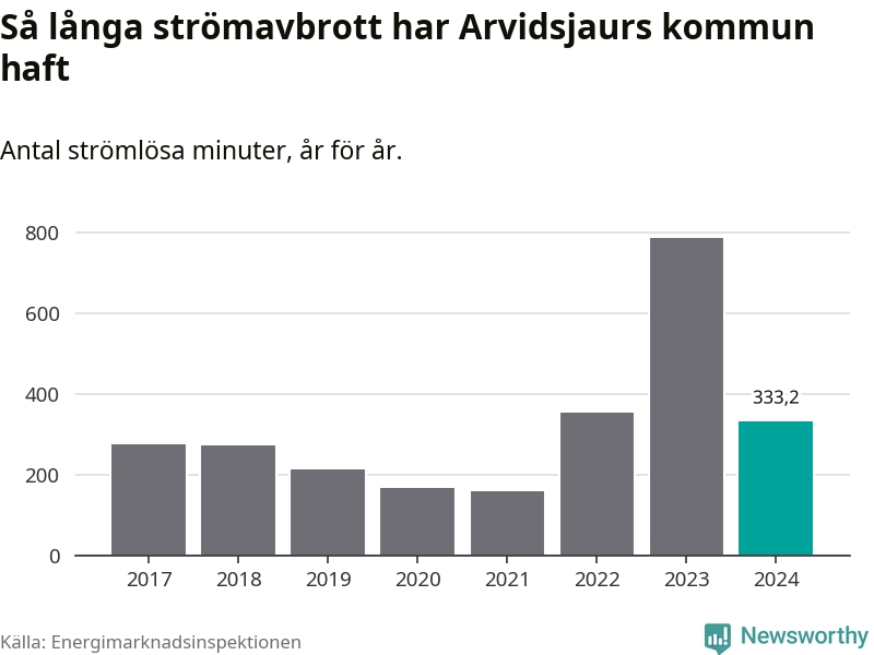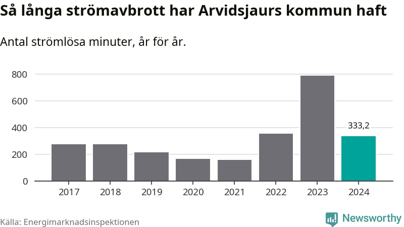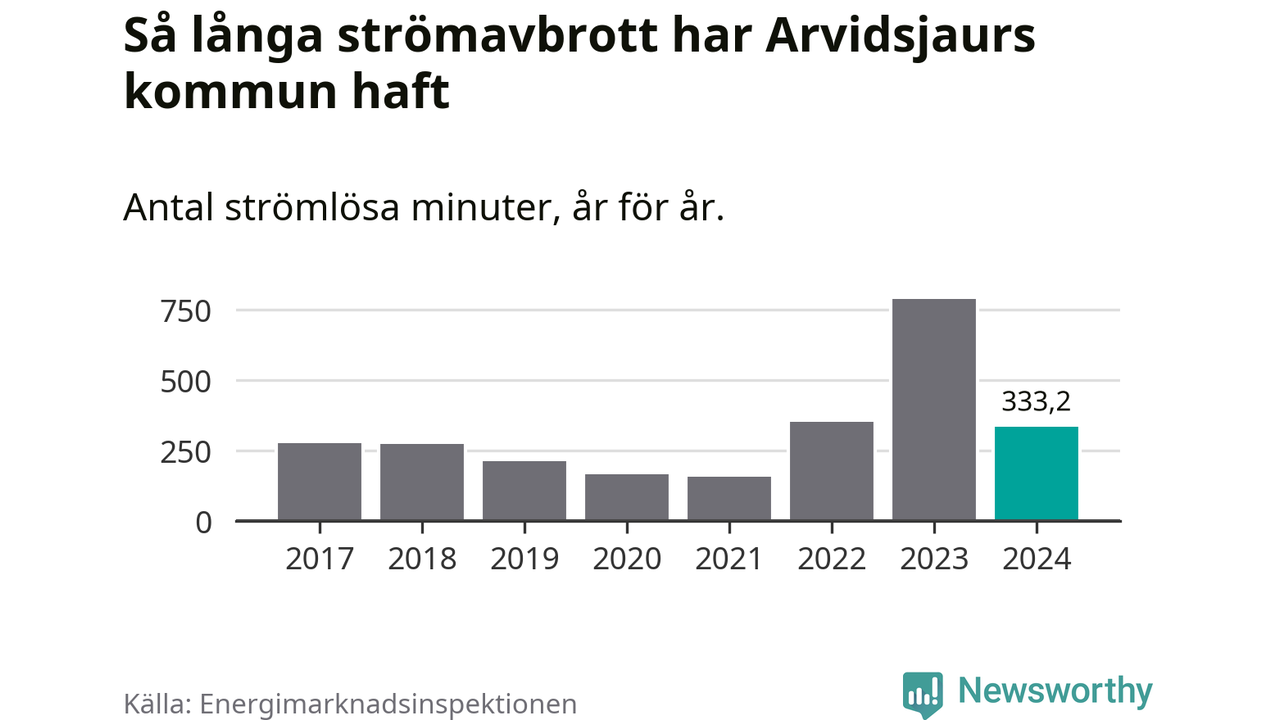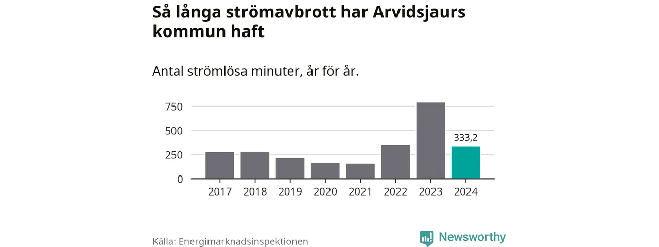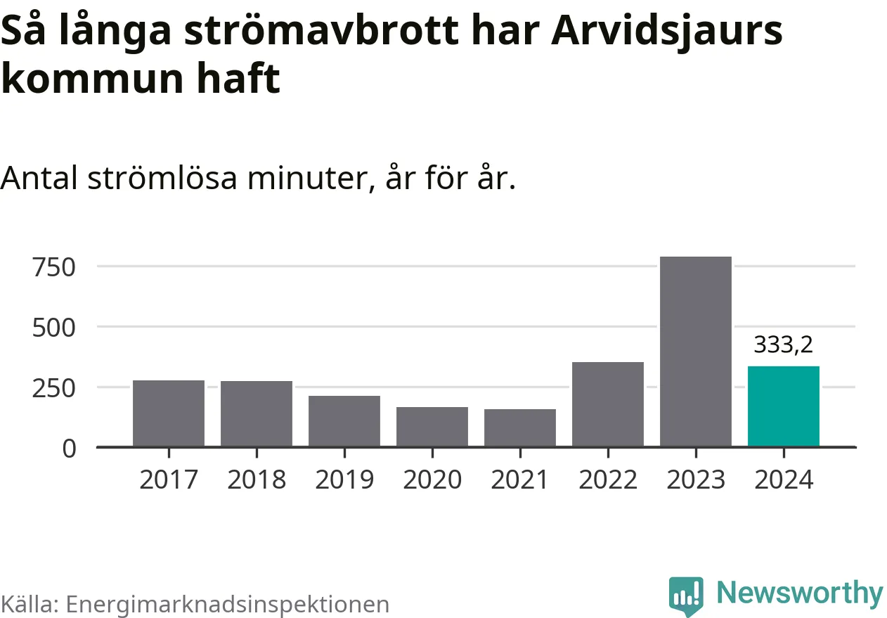 Antalet strömavbrott och total strömlös tid varierar från år till år i Arvidsjaurs kommun. Mest tid utan ström (i alla fall under perioden 2017–2024) fick Arvidsjaurs­borna genomleva under 2023 – 13 timmar och åtta minuter. Det är ungefär lika lång tid som det tar att se hela säsong 4 av serien ”Stranger things”.