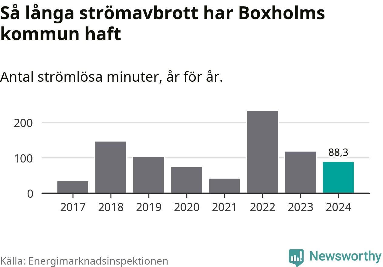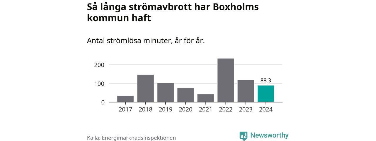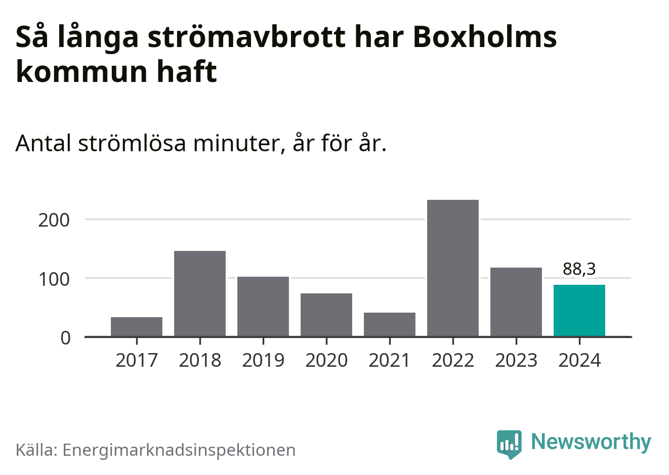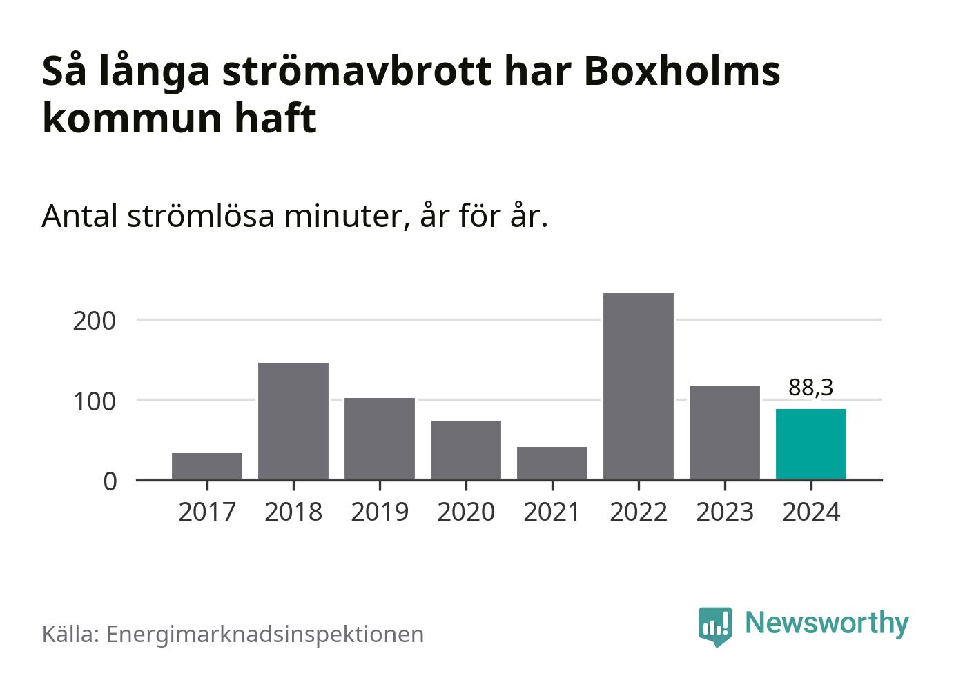 Antalet strömavbrott och total strömlös tid varierar från år till år i Boxholms kommun. Mest tid utan ström (i alla fall under perioden 2017–2024) fick Boxholmsborna genomleva under 2022 – tre timmar och 52 minuter. Det är två timmar och 17 minuter längre än under ett normalår.