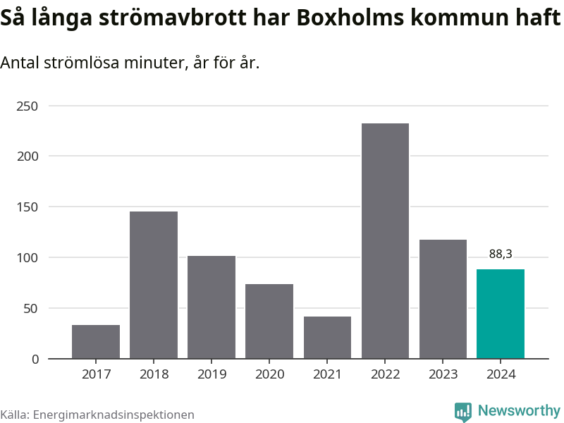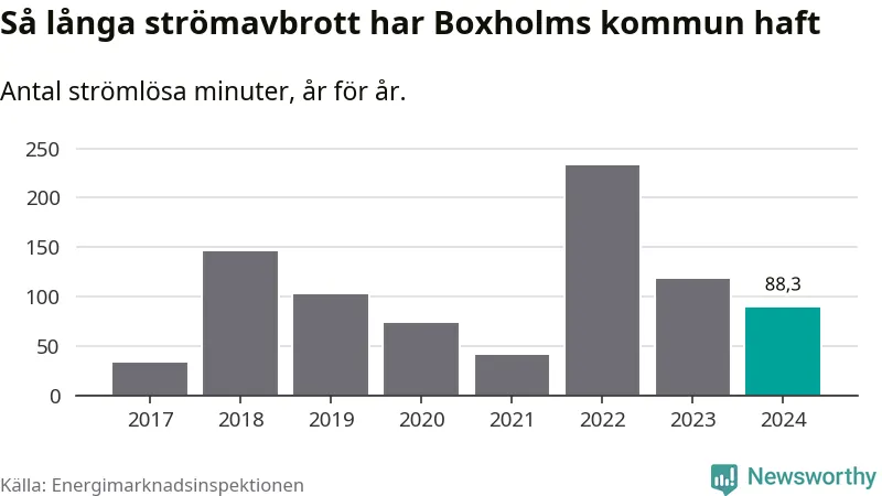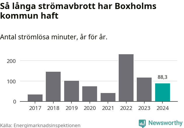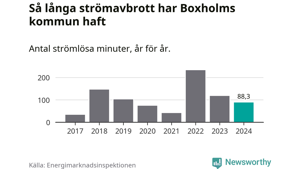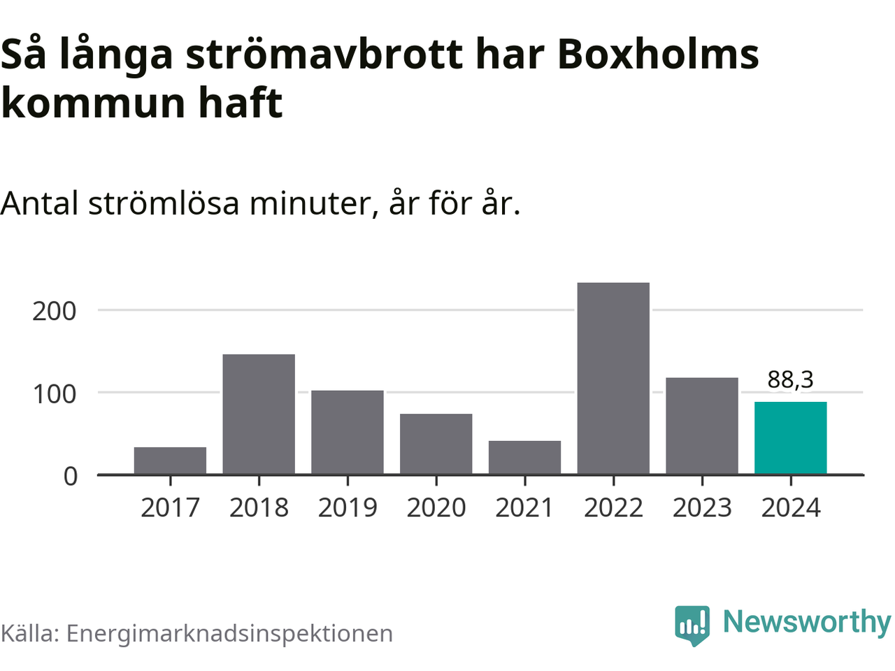 Antalet strömavbrott och total strömlös tid varierar från år till år i Boxholms kommun. Mest tid utan ström (i alla fall under perioden 2017–2024) fick Boxholmsborna genomleva under 2022 – tre timmar och 52 minuter. Det är två timmar och 17 minuter längre än under ett normalår.