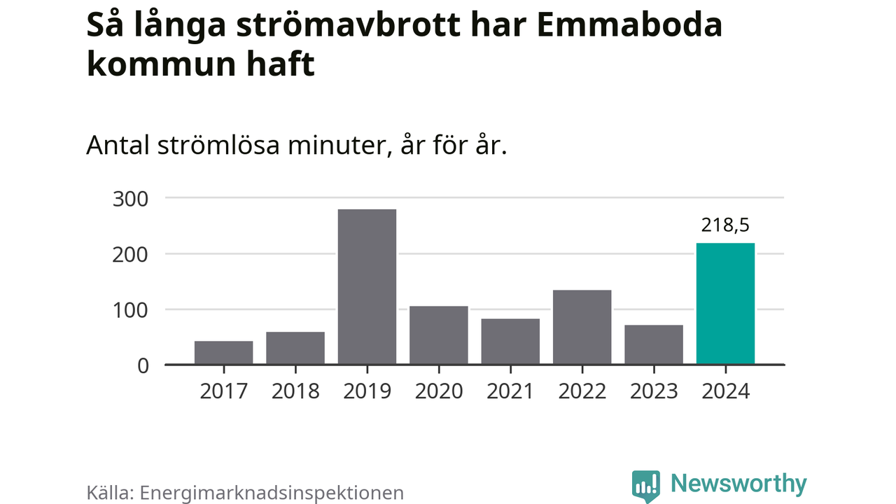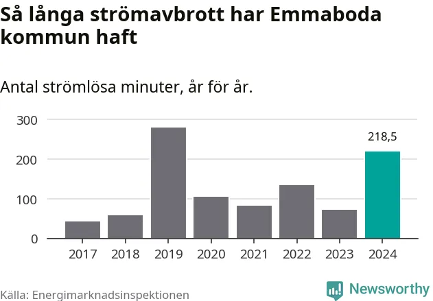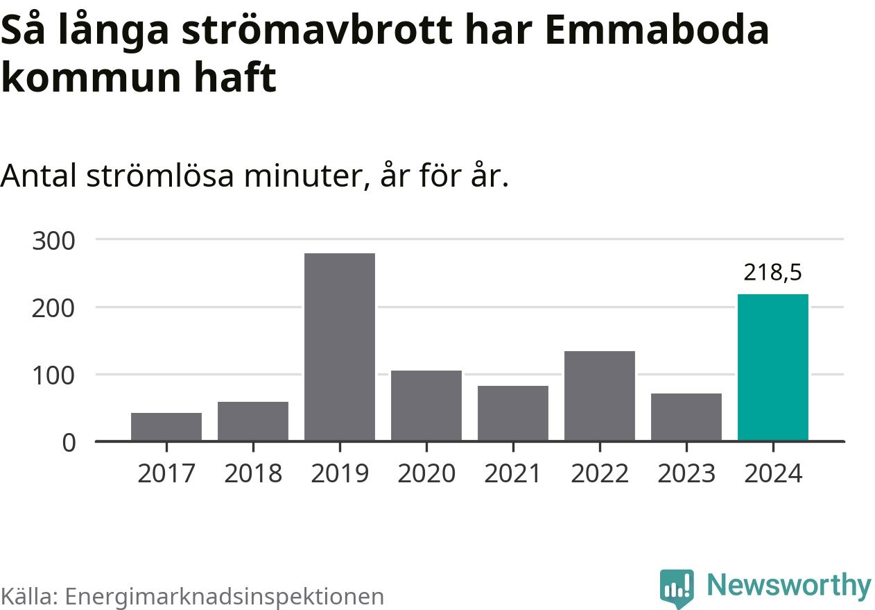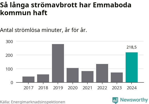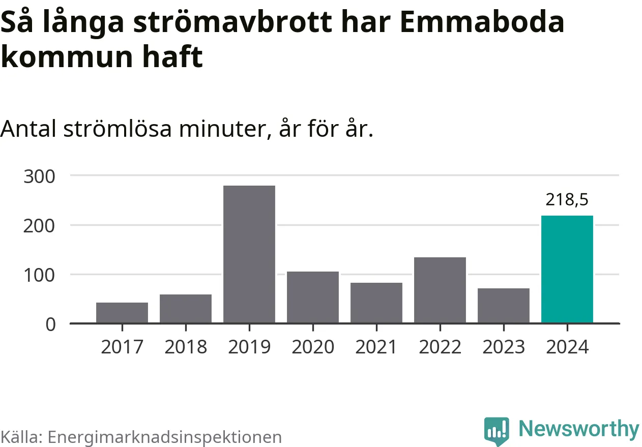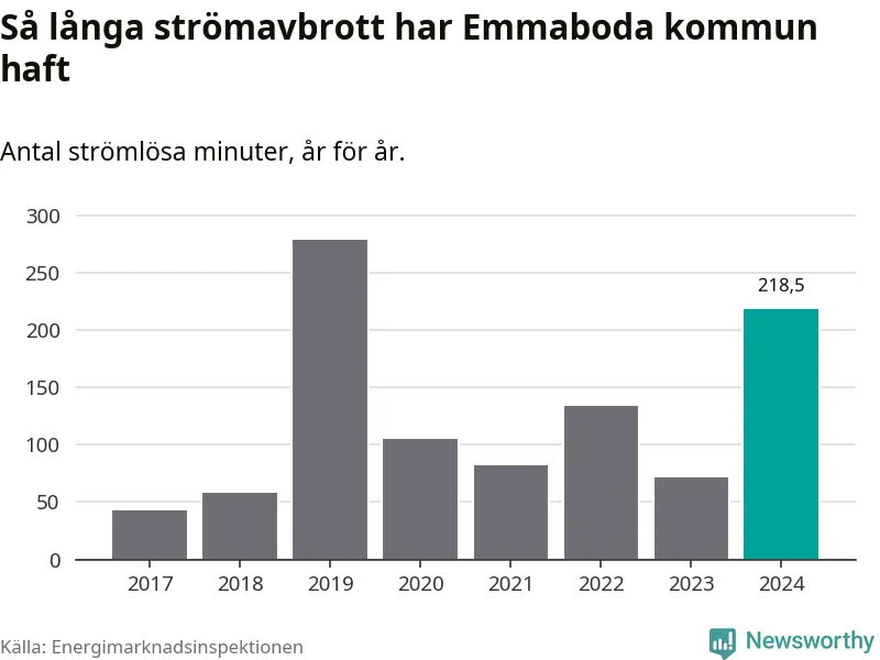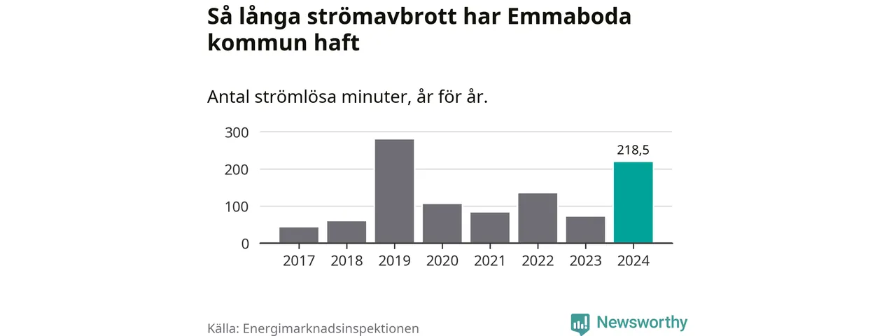 Antalet strömavbrott och total strömlös tid varierar från år till år i Emmaboda kommun. Mest tid utan ström (i alla fall under perioden 2017–2024) fick Emmabodaborna genomleva under 2019 – fyra timmar och 39 minuter. Det är tre timmar och sex minuter längre än under ett normalår.