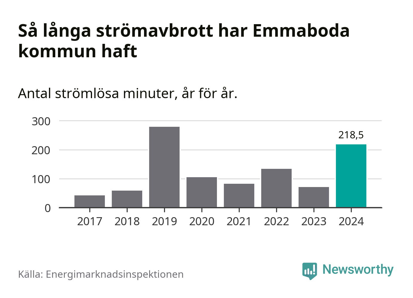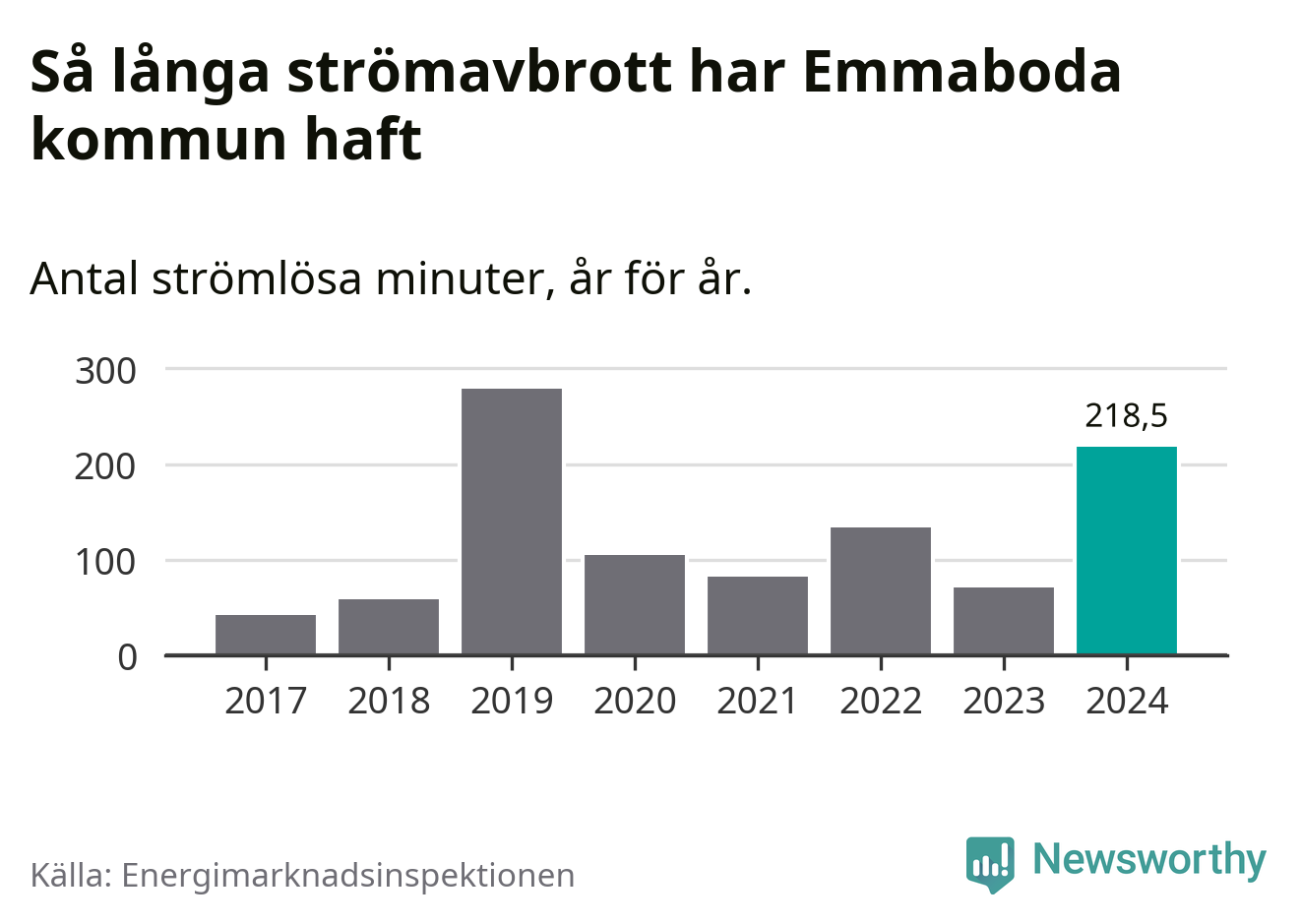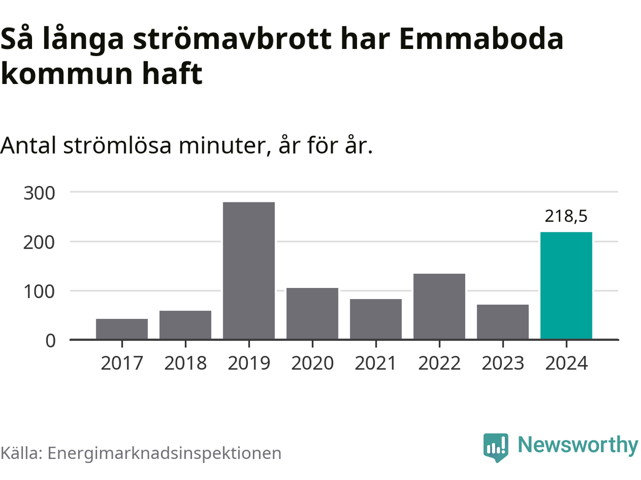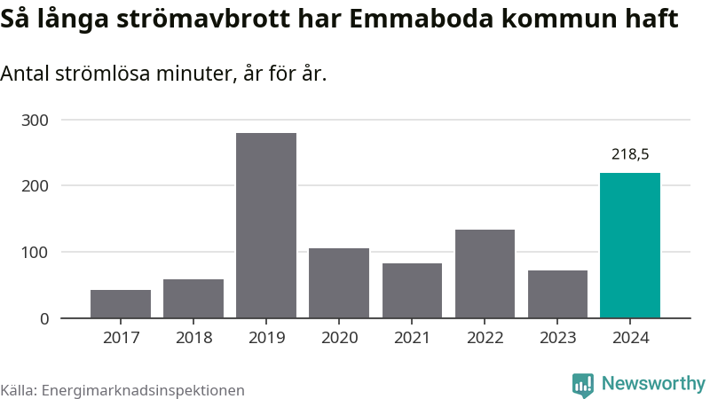 Antalet strömavbrott och total strömlös tid varierar från år till år i Emmaboda kommun. Mest tid utan ström (i alla fall under perioden 2017–2024) fick Emmabodaborna genomleva under 2019 – fyra timmar och 39 minuter. Det är tre timmar och sex minuter längre än under ett normalår.