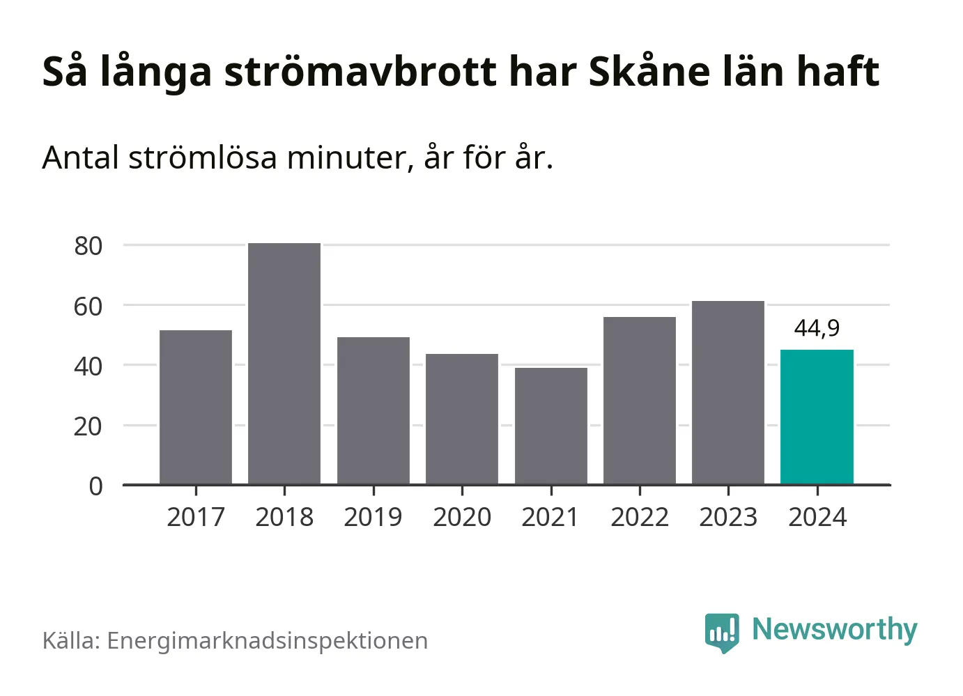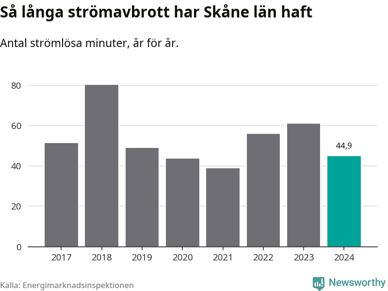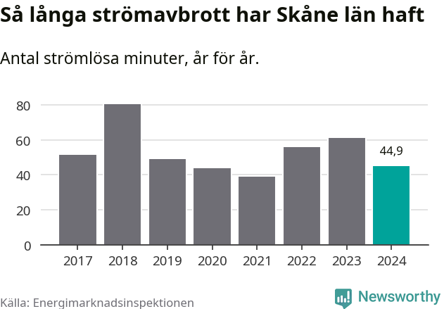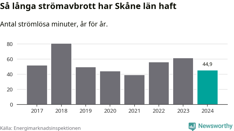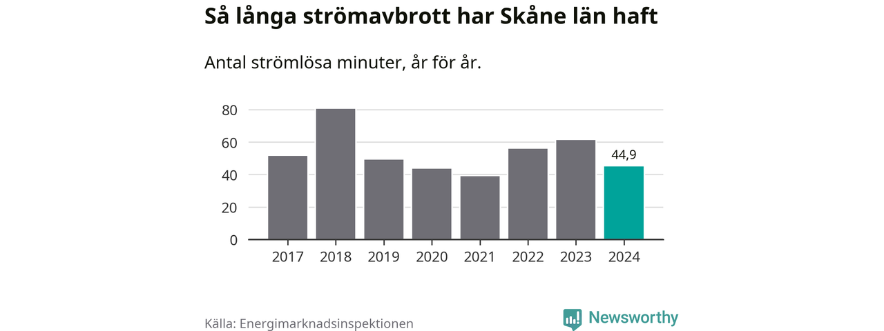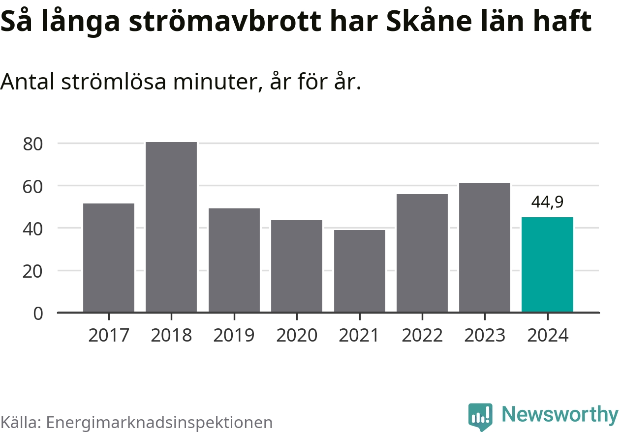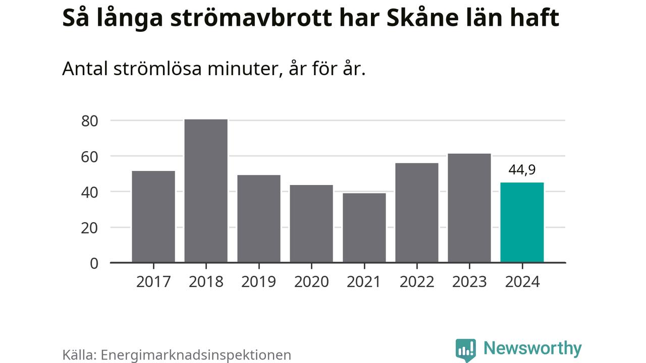 Skillnaden är stor mellan kommunerna. Mellan Lomma kommun, som har kortast strömavbrott, och Hörby kommun, som har längst, skiljer det två timmar och 32 minuter under ett normalår.