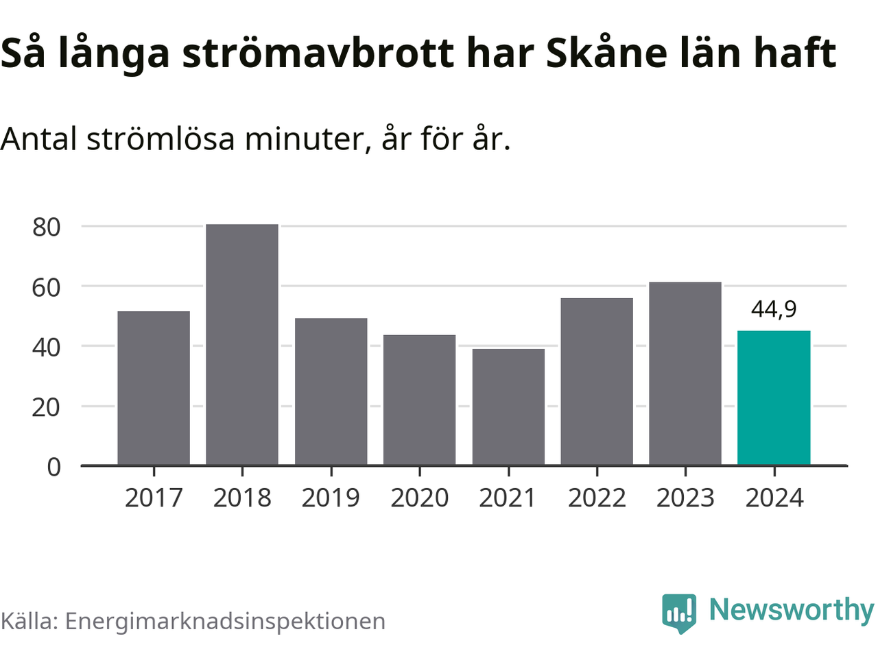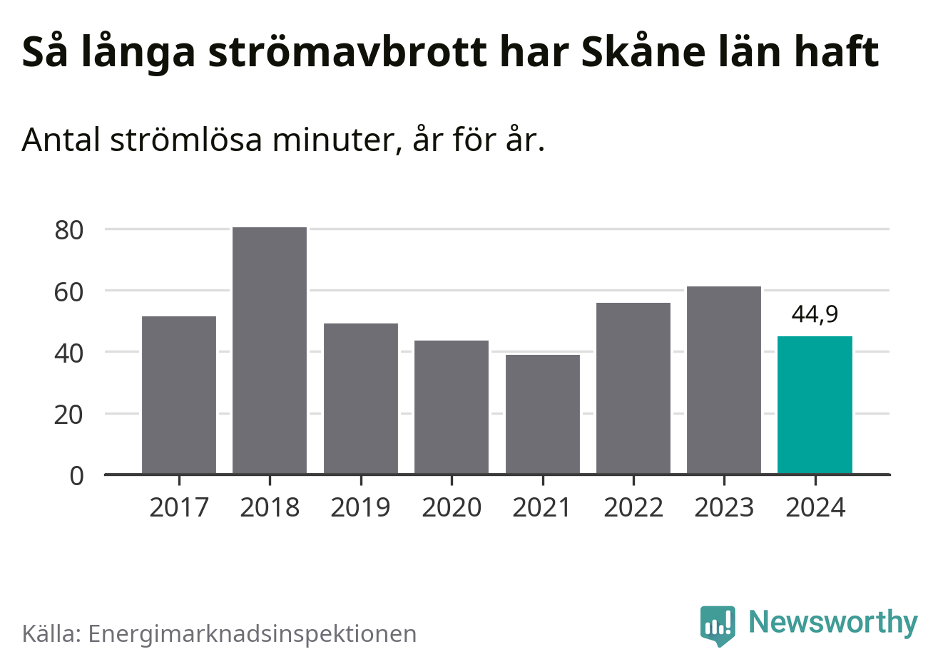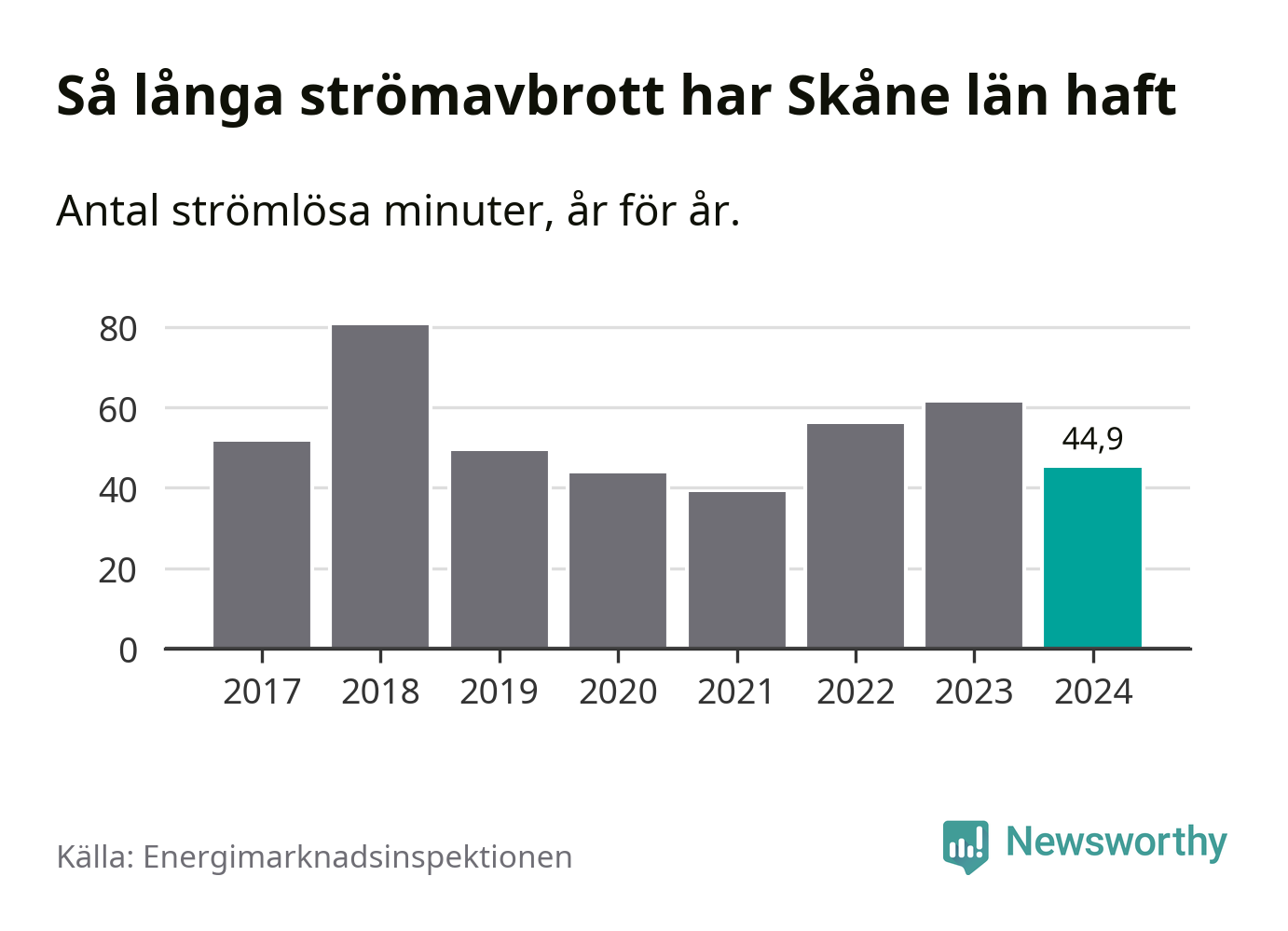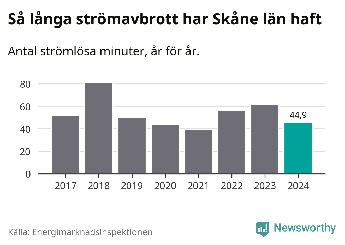 Skillnaden är stor mellan kommunerna. Mellan Lomma kommun, som har kortast strömavbrott, och Hörby kommun, som har längst, skiljer det två timmar och 32 minuter under ett normalår.