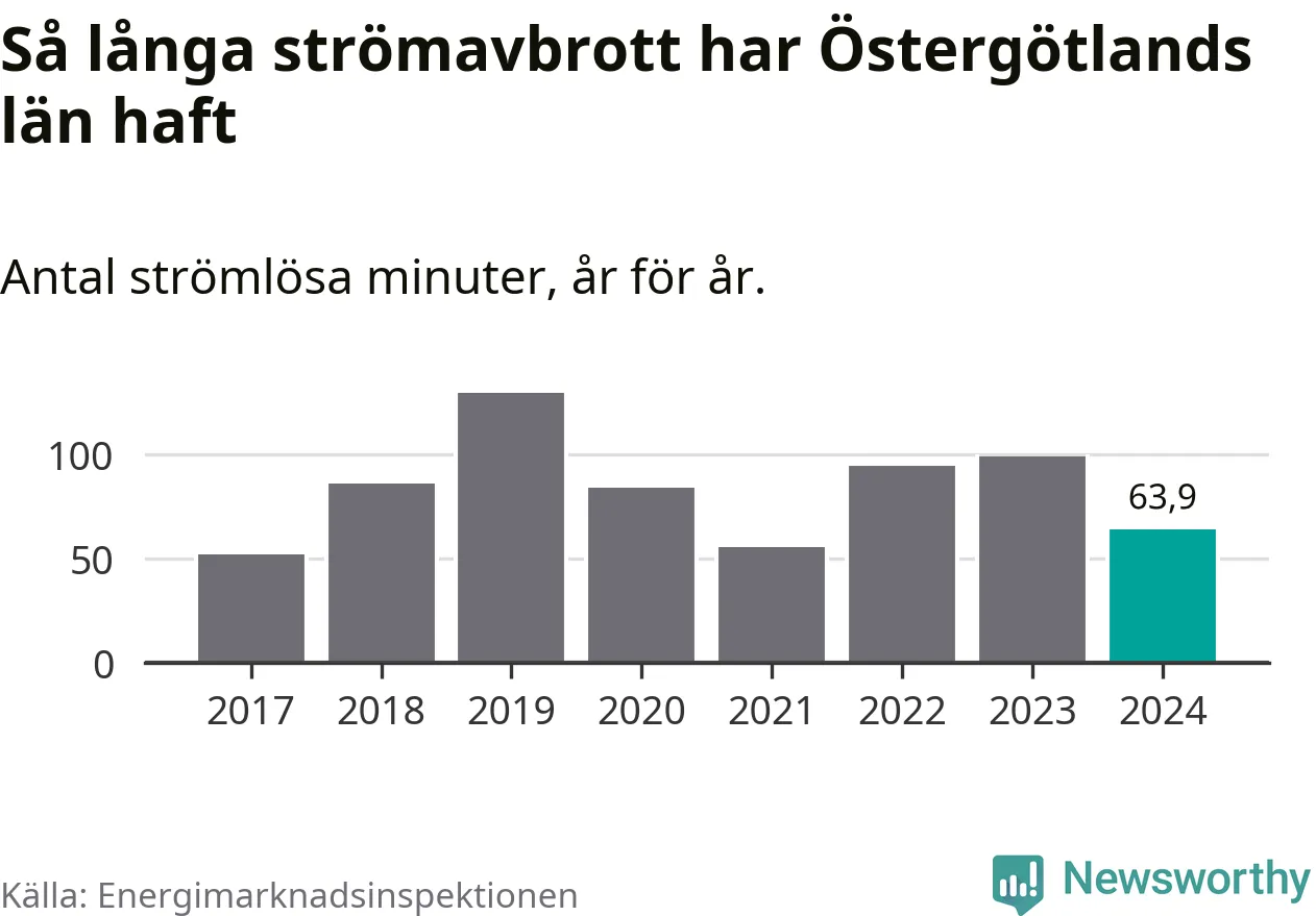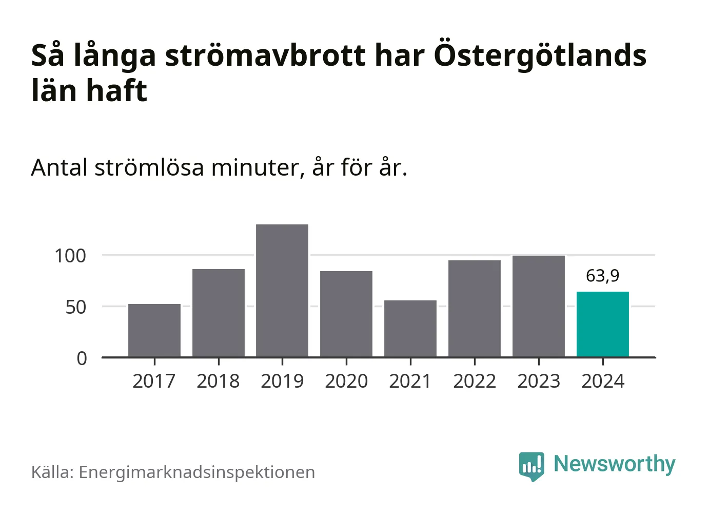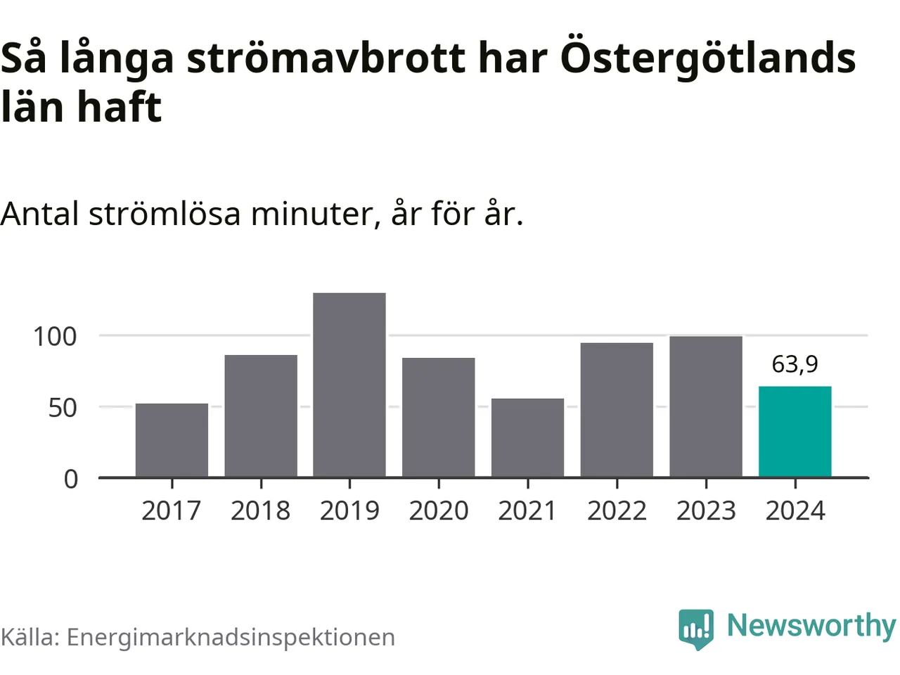Skillnaden är stor mellan kommunerna. Mellan Vadstena kommun, som har kortast strömavbrott, och Valdemarsviks kommun, som har längst, skiljer det fyra timmar och 24 minuter under ett normalår.