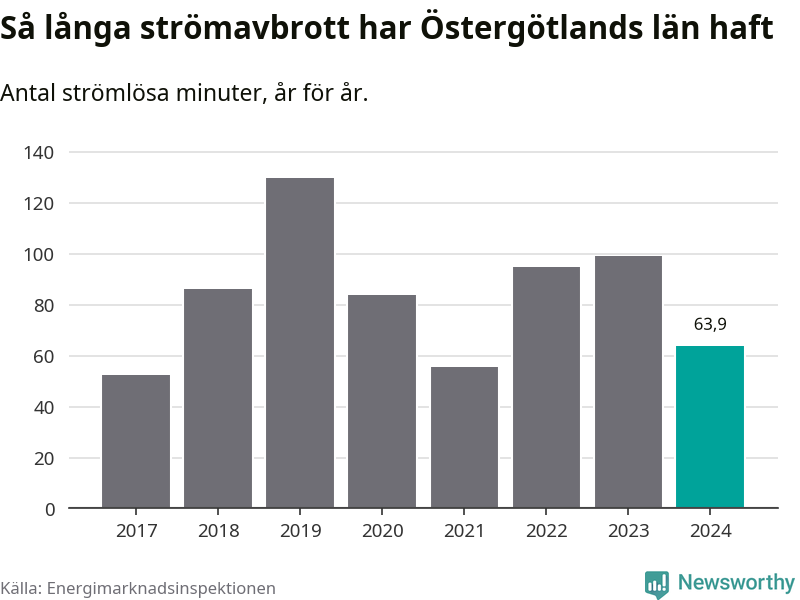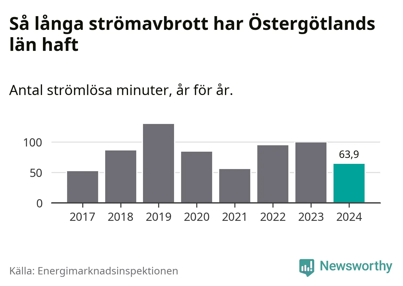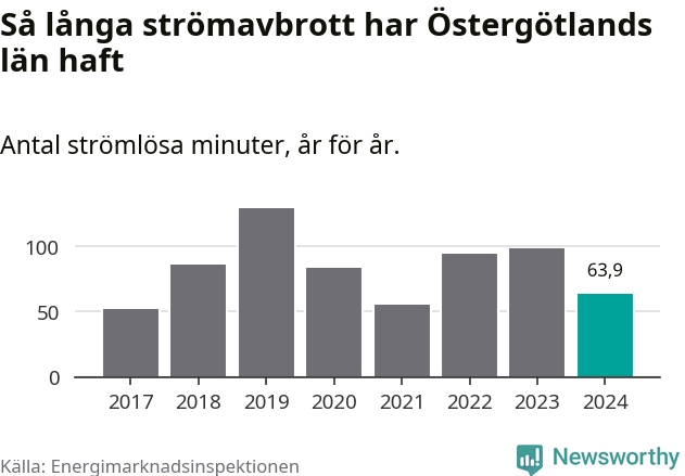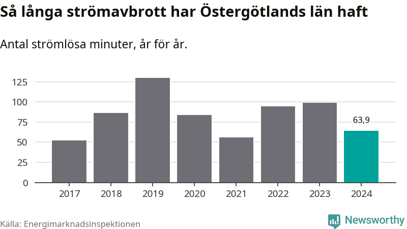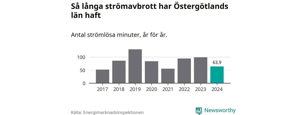 Skillnaden är stor mellan kommunerna. Mellan Vadstena kommun, som har kortast strömavbrott, och Valdemarsviks kommun, som har längst, skiljer det fyra timmar och 24 minuter under ett normalår.