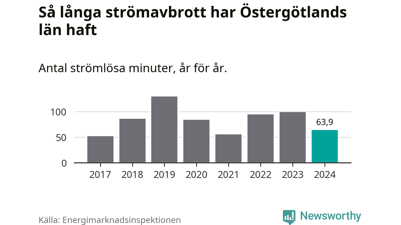 Östergötlands läns hushåll drabbas ett typiskt år av drygt ett strömavbrott och en timme och 25 minuter strömlöst.