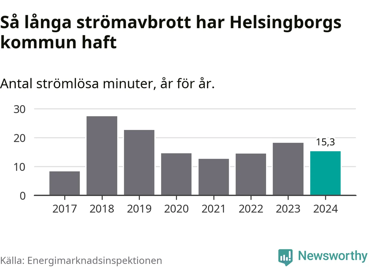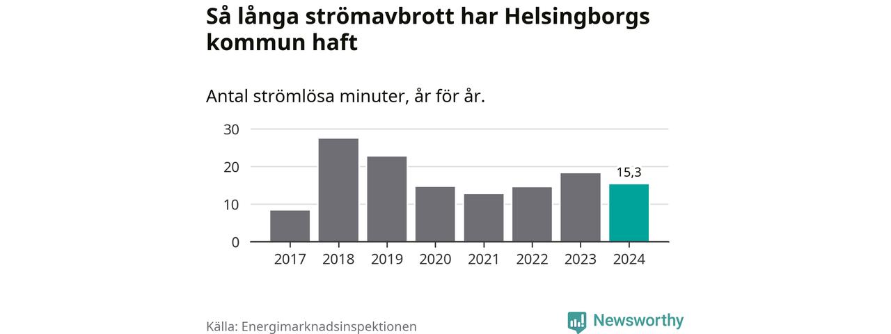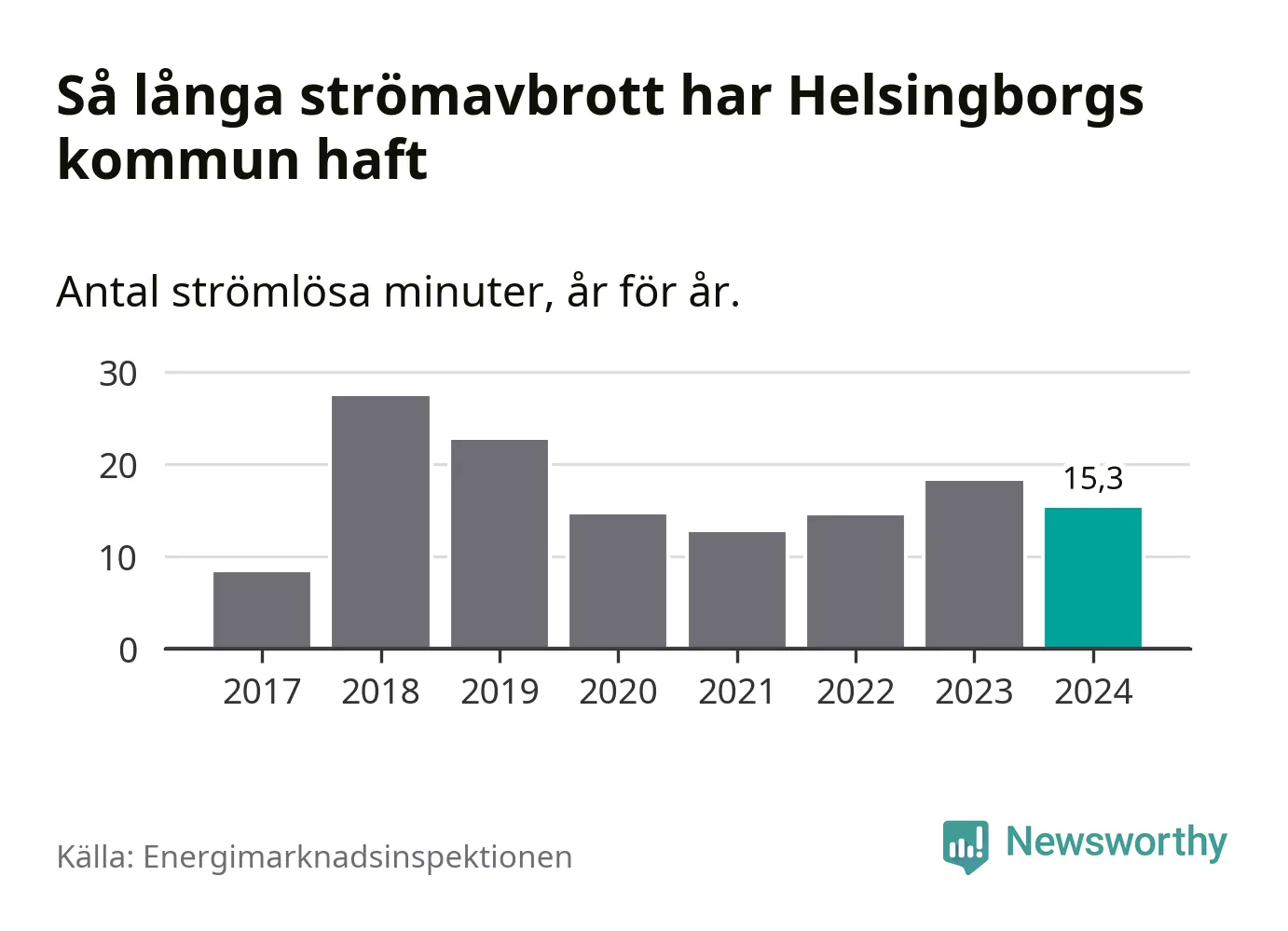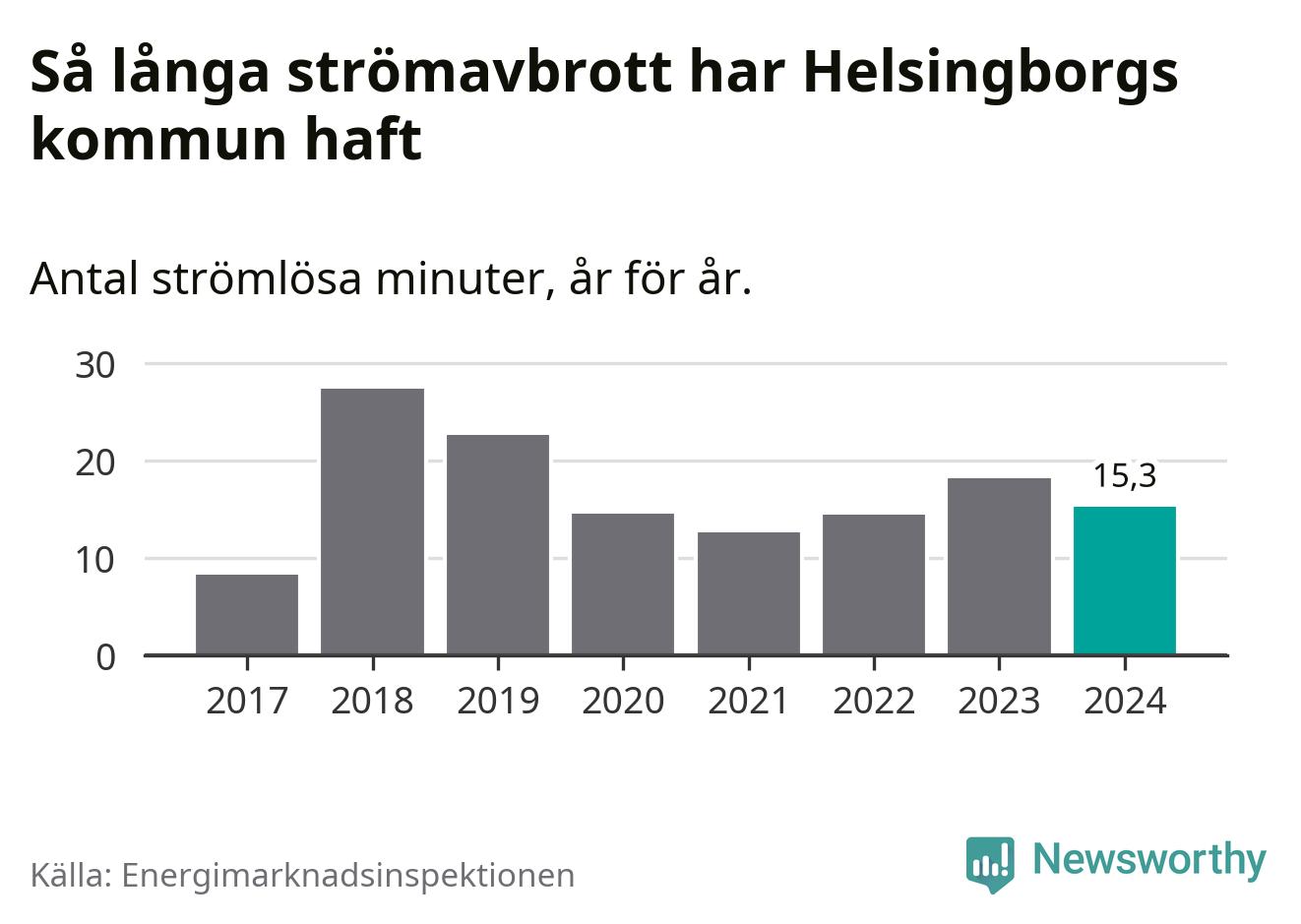 Antalet strömavbrott och total strömlös tid varierar något från år till år i Helsingborgs kommun. Mest tid utan ström (i alla fall under perioden 2017–2024) fick helsingborgarna genomleva under 2018 – 27 minuter. Det är tolv minuter längre än under ett normalår.