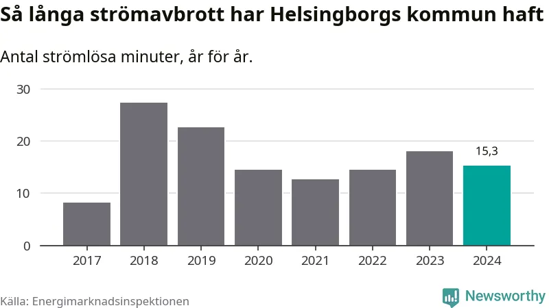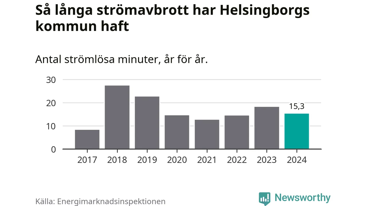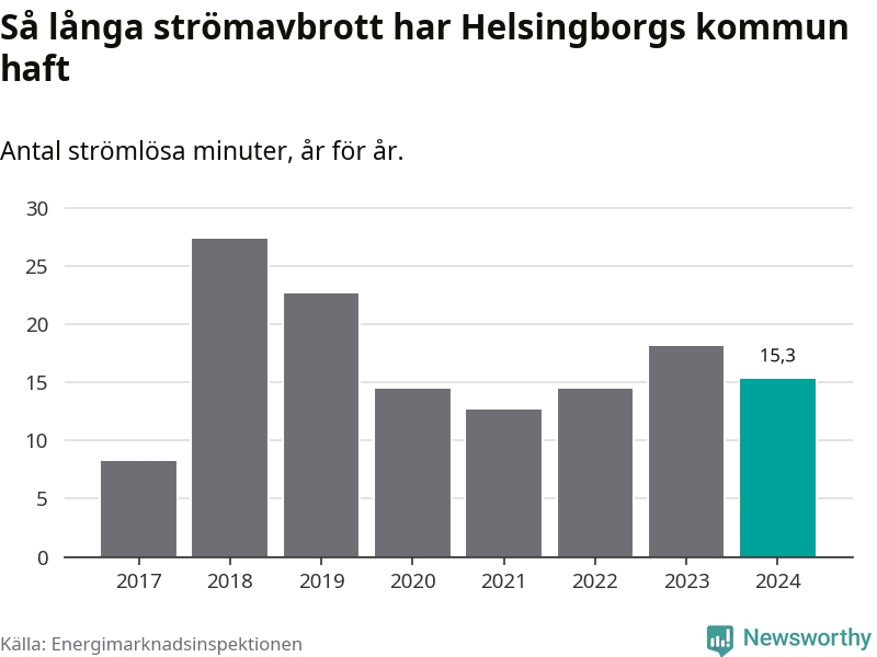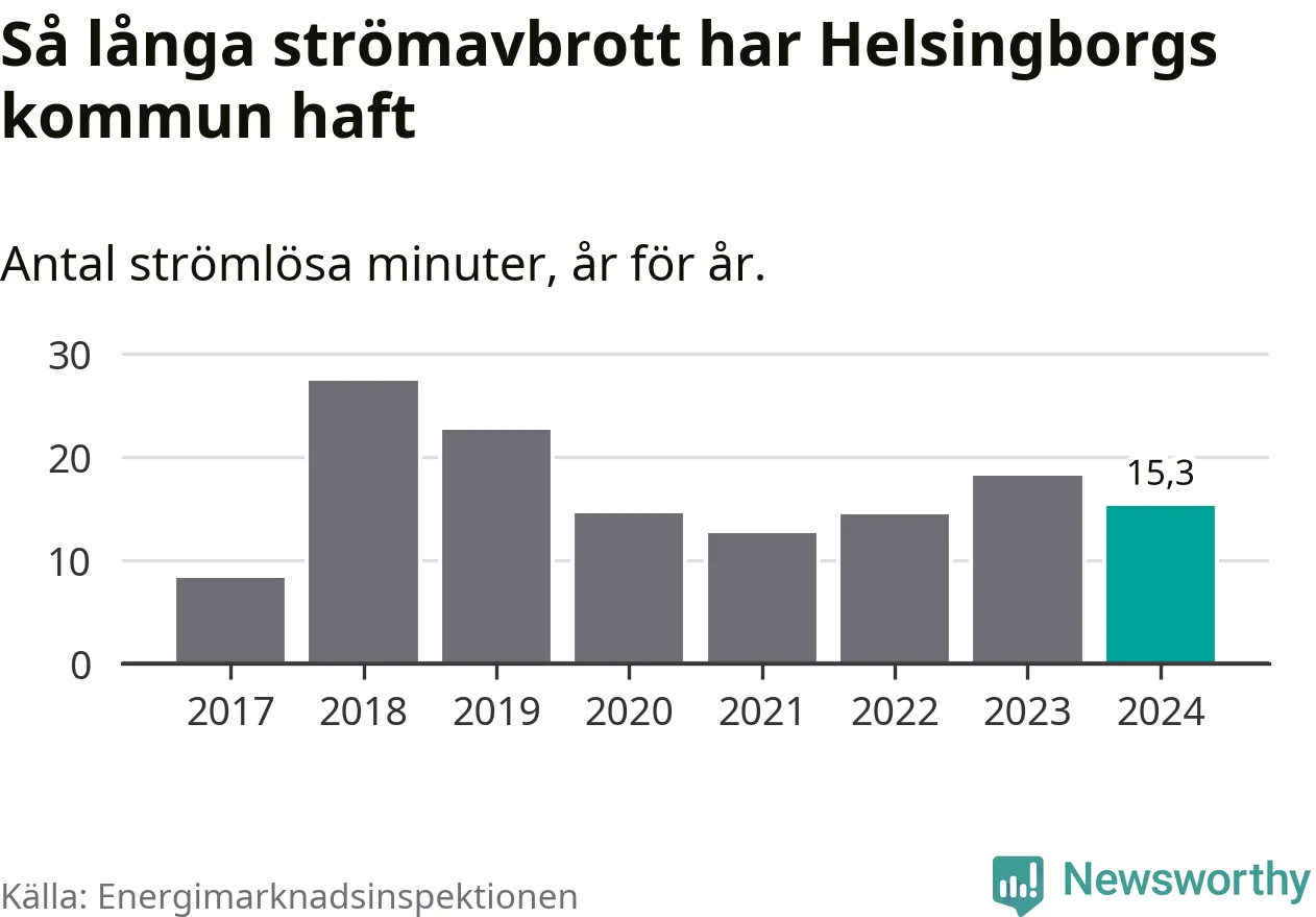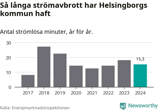 Antalet strömavbrott och total strömlös tid varierar något från år till år i Helsingborgs kommun. Mest tid utan ström (i alla fall under perioden 2017–2024) fick helsingborgarna genomleva under 2018 – 27 minuter. Det är tolv minuter längre än under ett normalår.