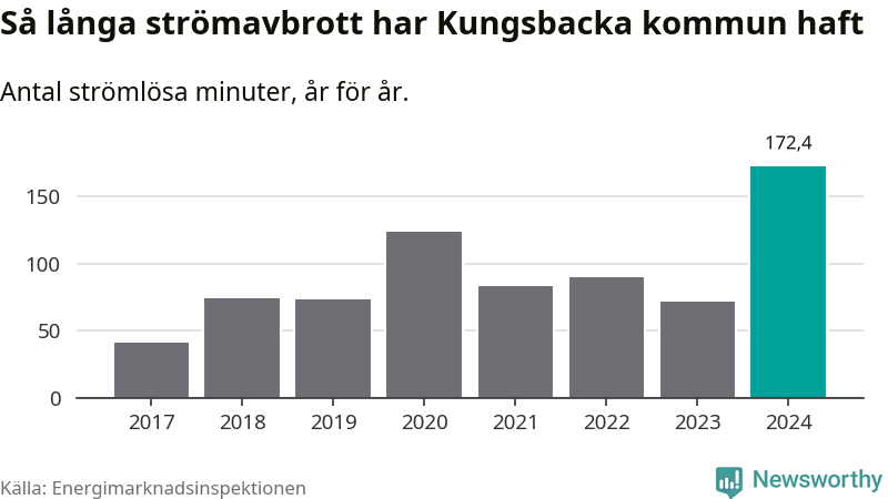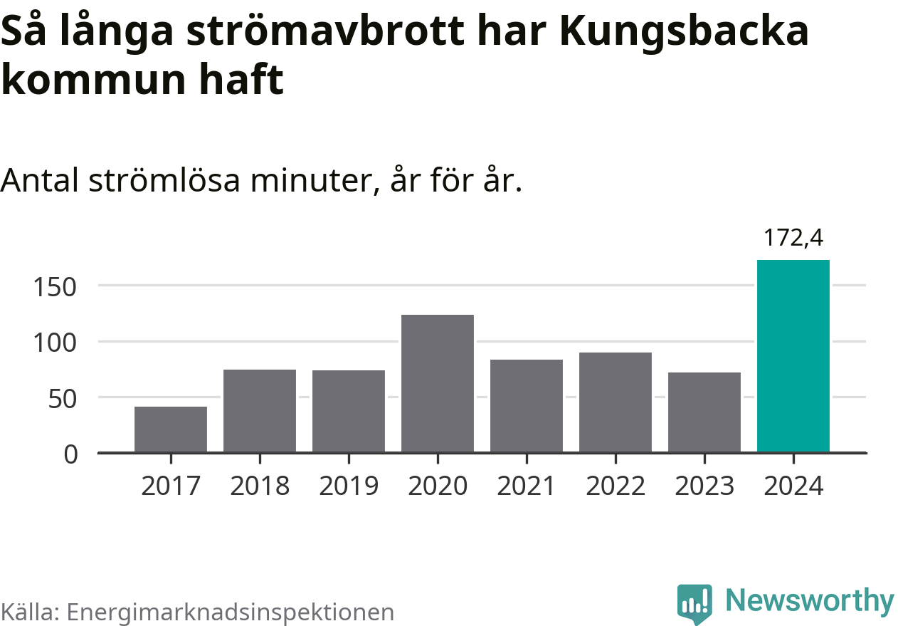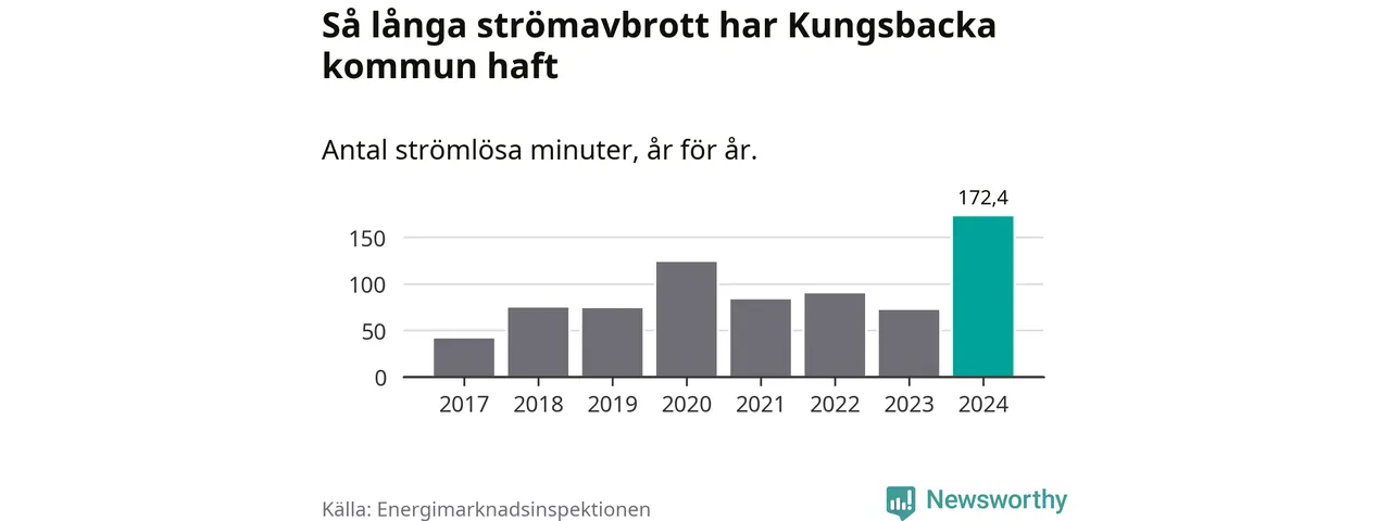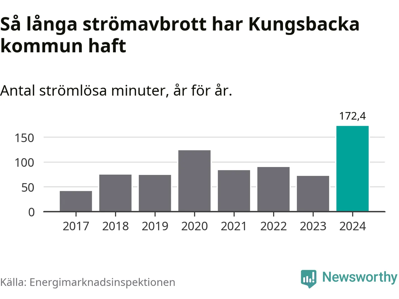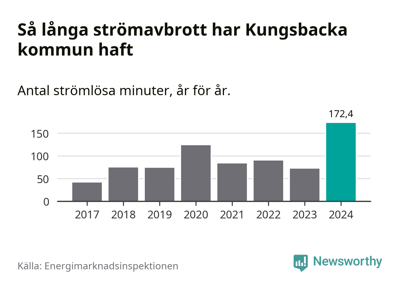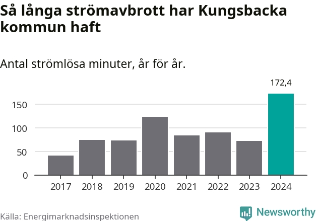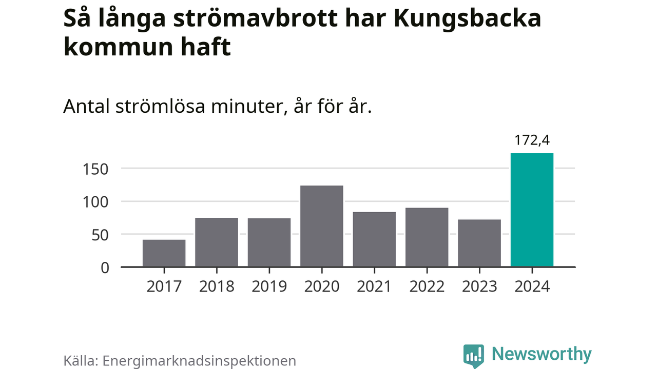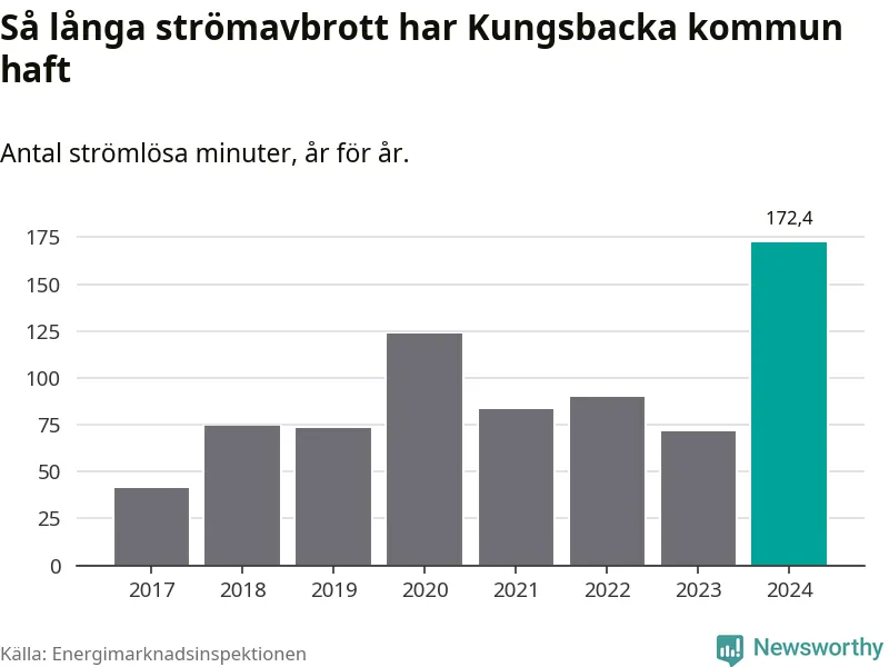 Antalet strömavbrott och total strömlös tid varierar från år till år i Kungsbacka kommun. Mest tid utan ström (i alla fall under perioden 2017–2024) fick Kungsbackaborna genomleva under 2024 – två timmar och 52 minuter. Det är en timme och 34 minuter längre än under ett normalår.