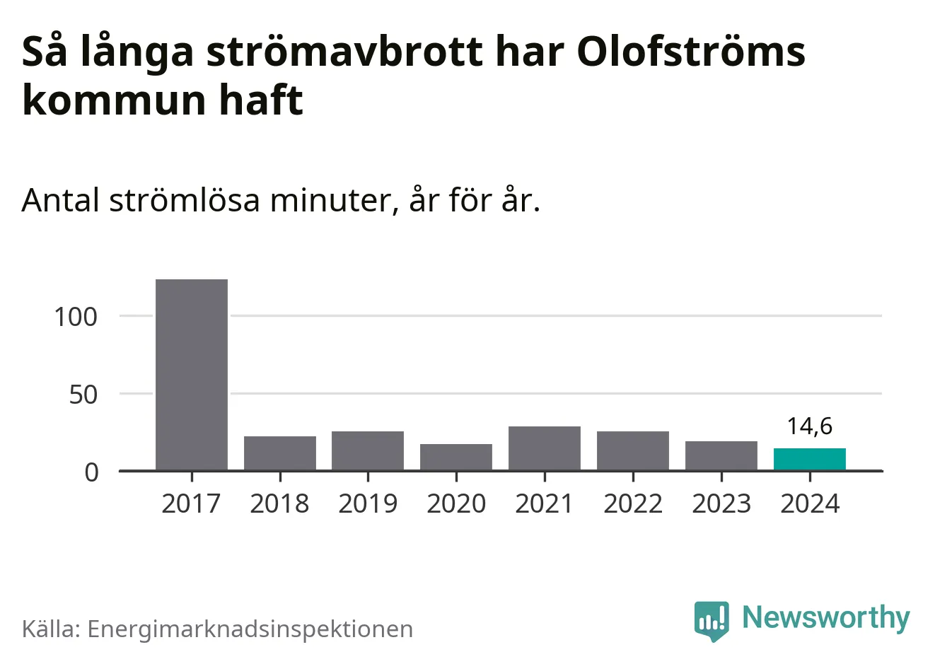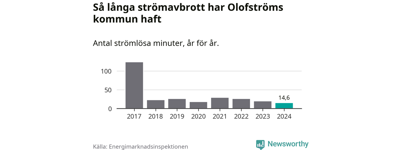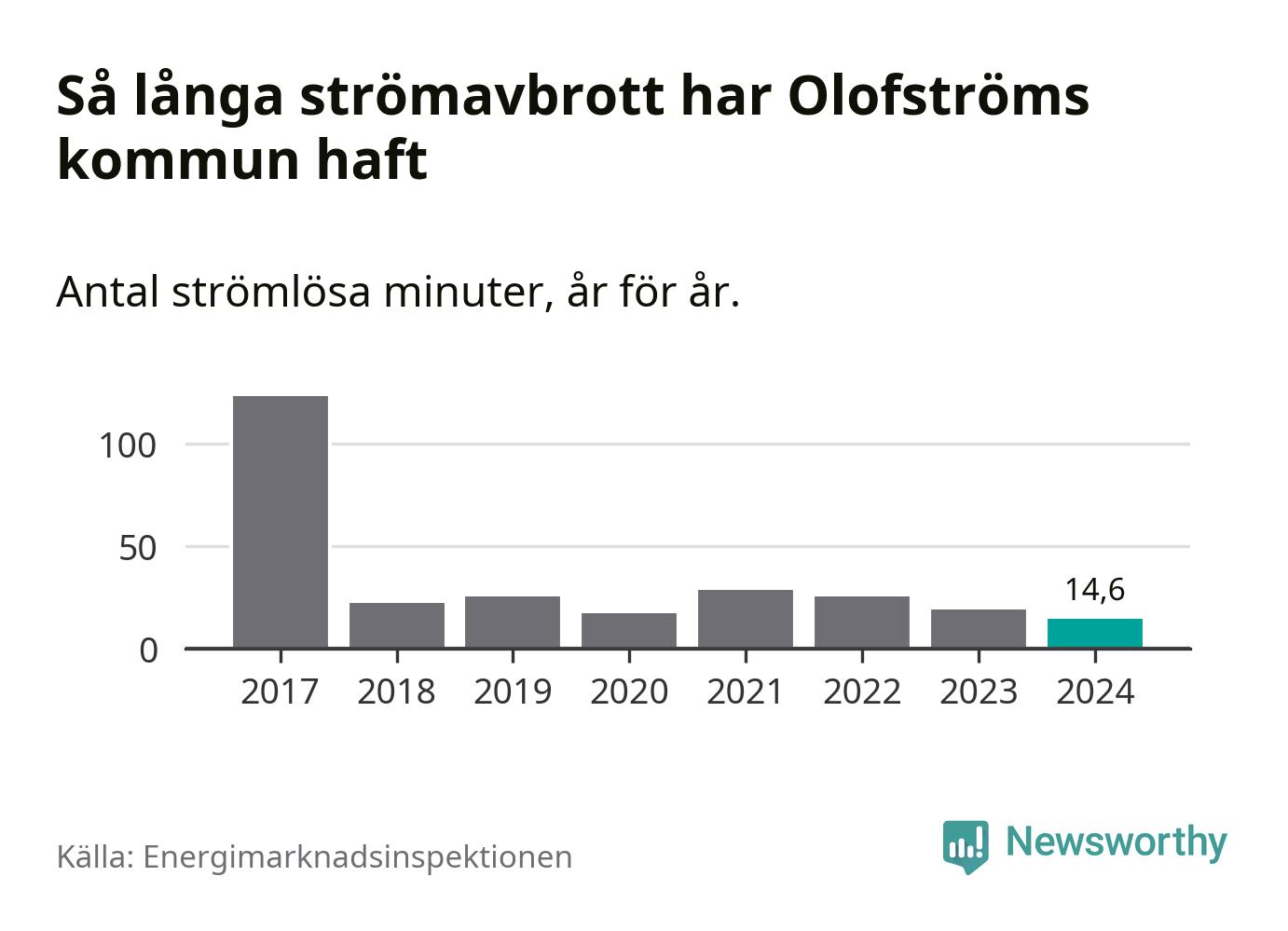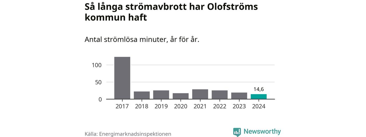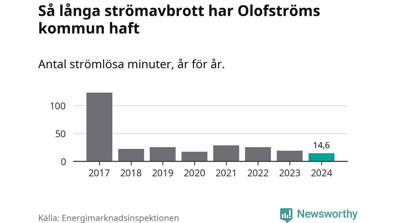 Antalet strömavbrott och total strömlös tid varierar från år till år i Olofströms kommun. Mest tid utan ström (i alla fall under perioden 2017–2024) fick Olofströmsborna genomleva under 2017 – två timmar och tre minuter. Det är en timme och 39 minuter längre än under ett normalår.