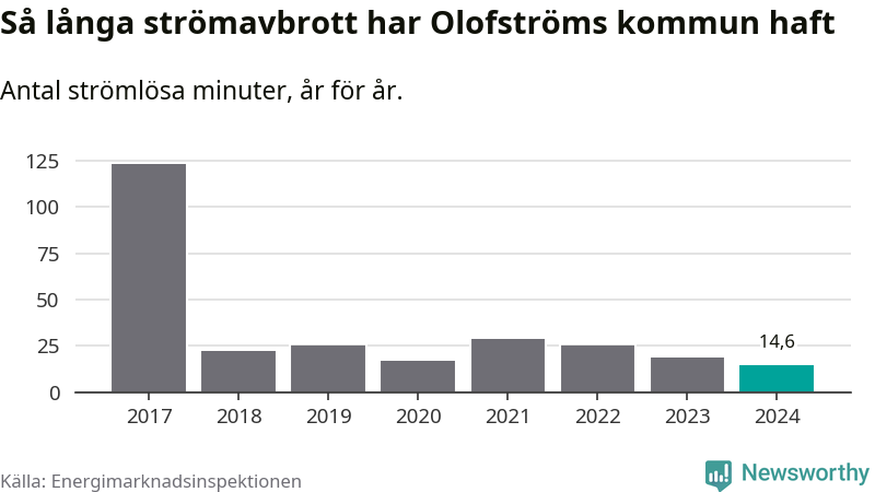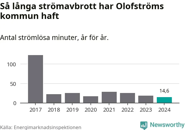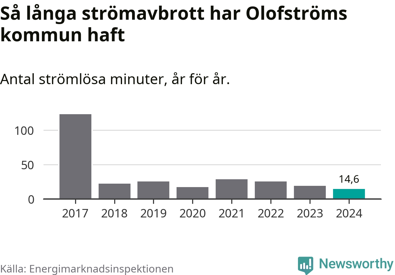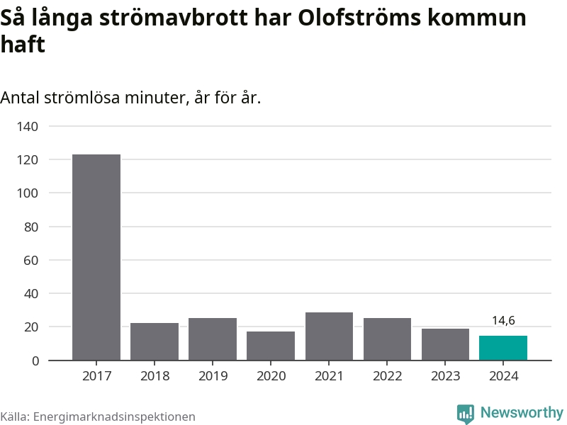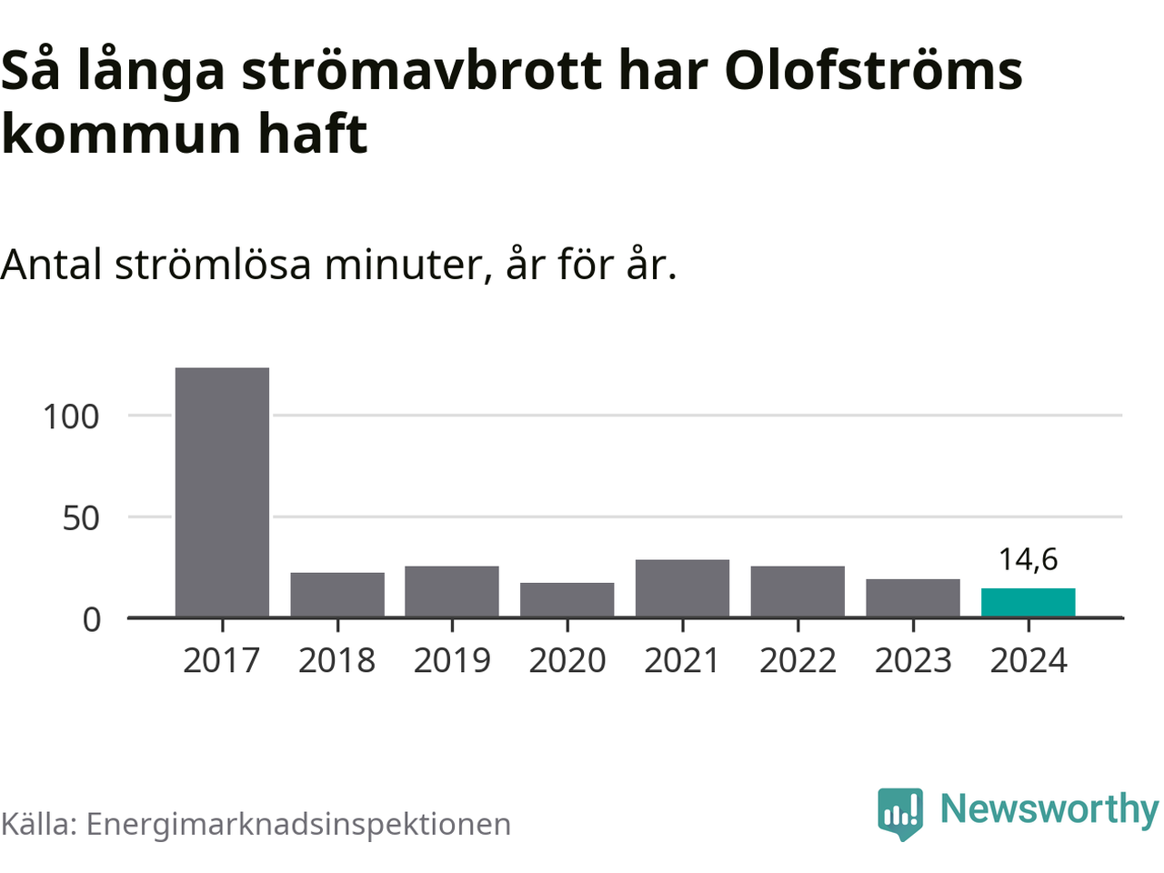 Antalet strömavbrott och total strömlös tid varierar från år till år i Olofströms kommun. Mest tid utan ström (i alla fall under perioden 2017–2024) fick Olofströmsborna genomleva under 2017 – två timmar och tre minuter. Det är en timme och 39 minuter längre än under ett normalår.