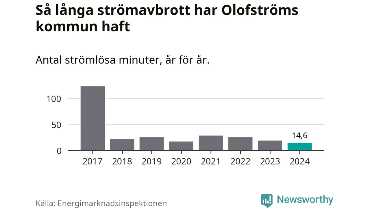 Olofströms kommuns hushåll drabbas normalt inte ens av ett enda strömavbrott per år. Om avbrott ändå sker är de relativt korta – i snitt 24 strömlösa minuter per hushåll och år.