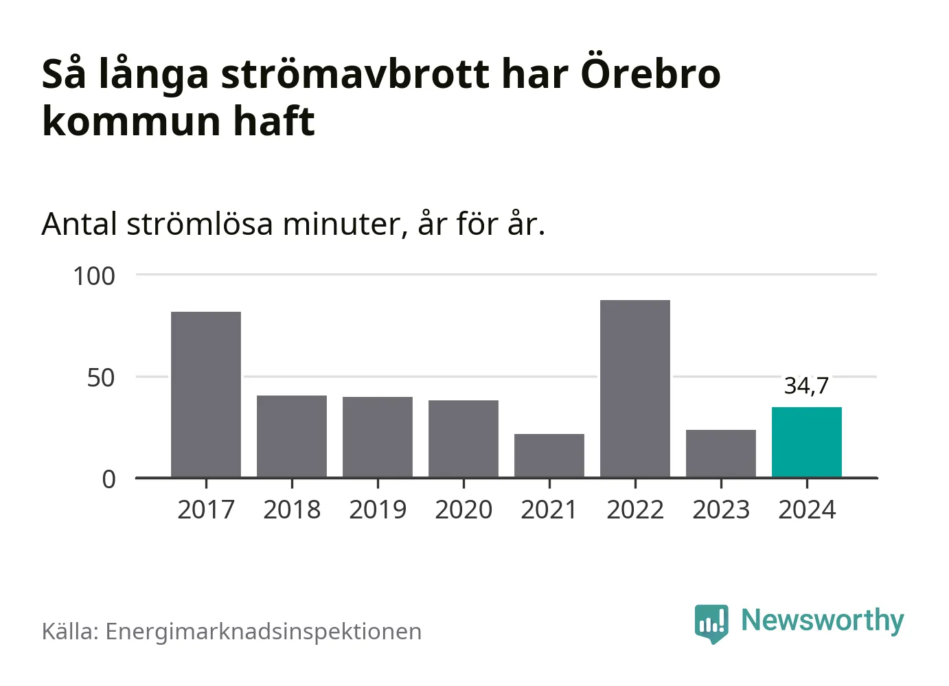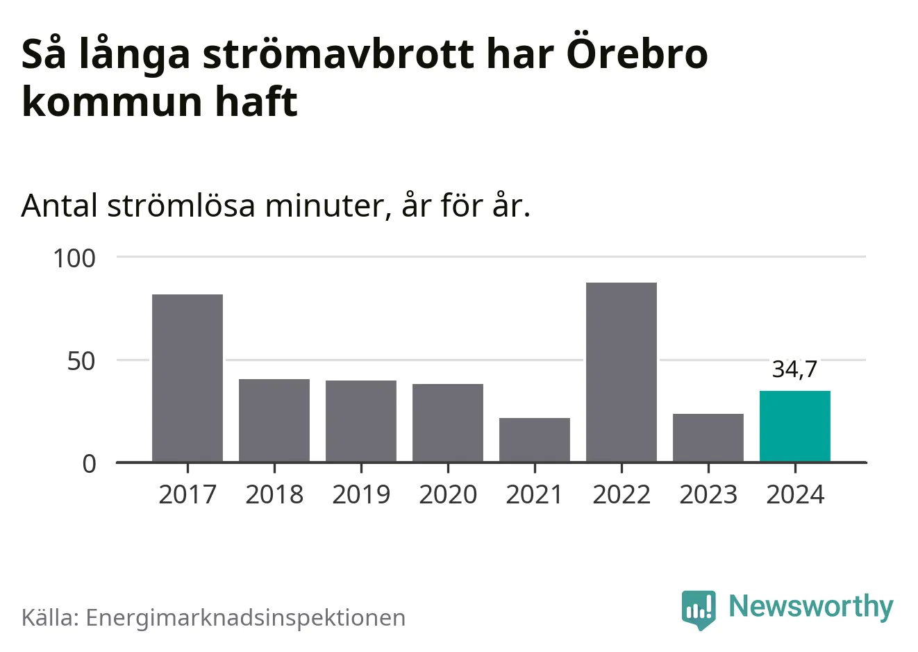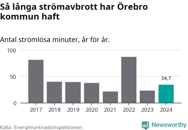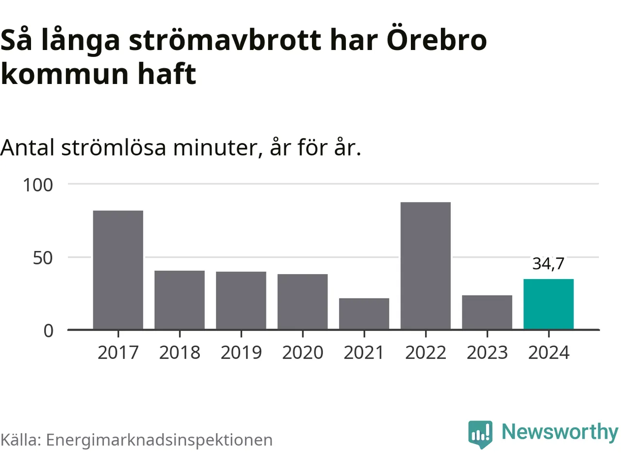 Antalet strömavbrott och total strömlös tid varierar något från år till år i Örebro kommun. Mest tid utan ström (i alla fall under perioden 2017–2024) fick örebroarna genomleva under 2022 – en timme och 27 minuter. Det är 48 minuter längre än under ett normalår.