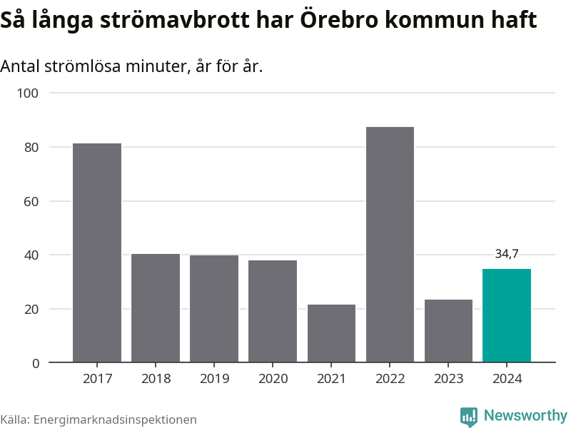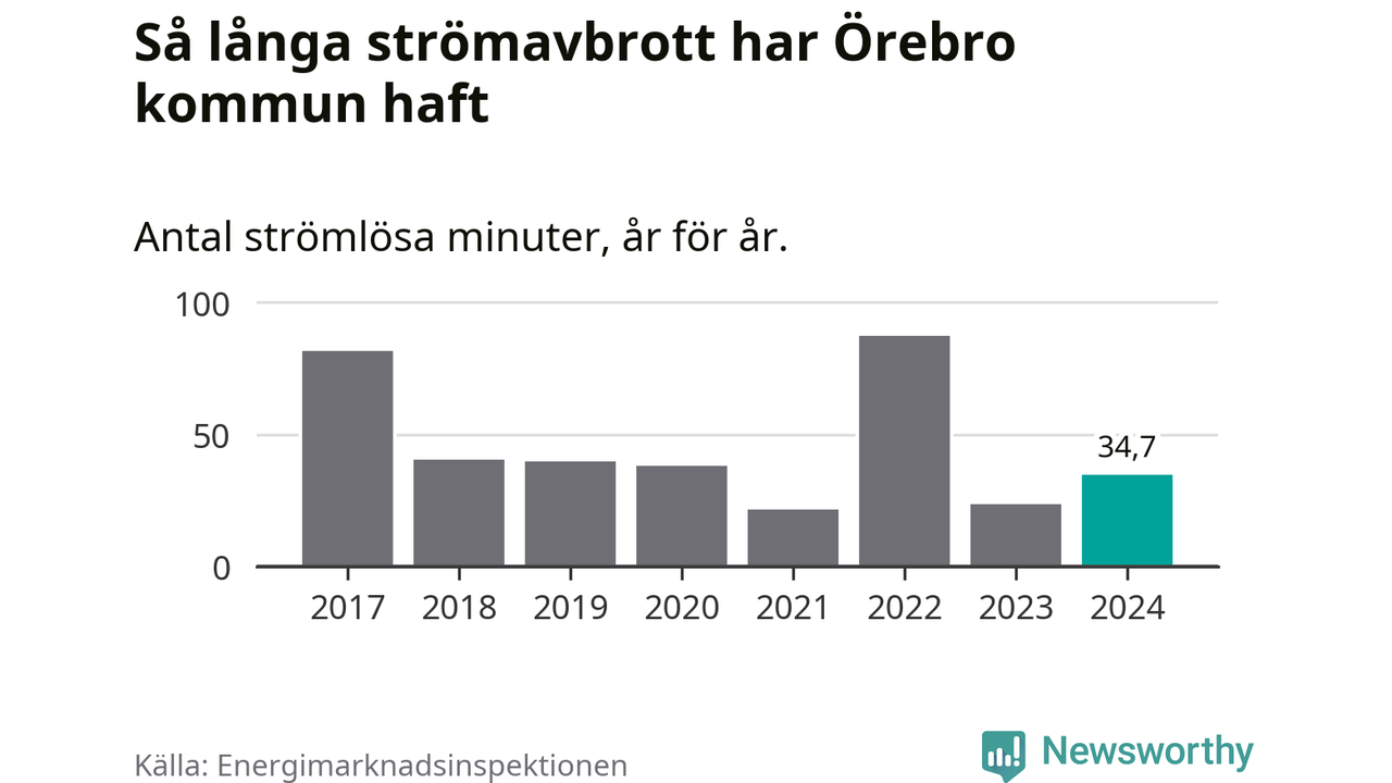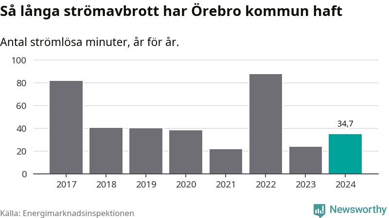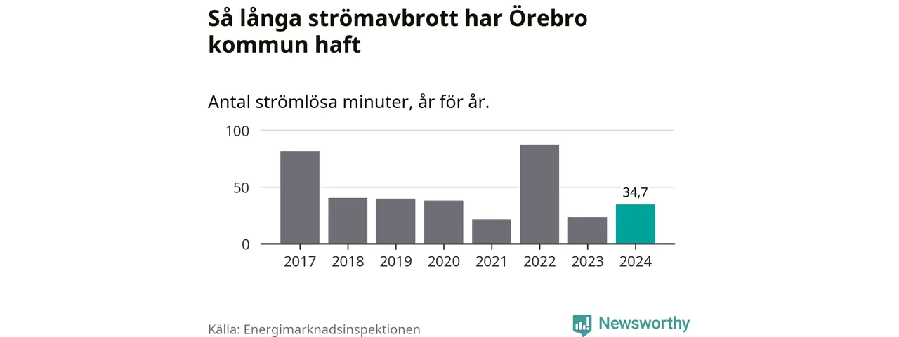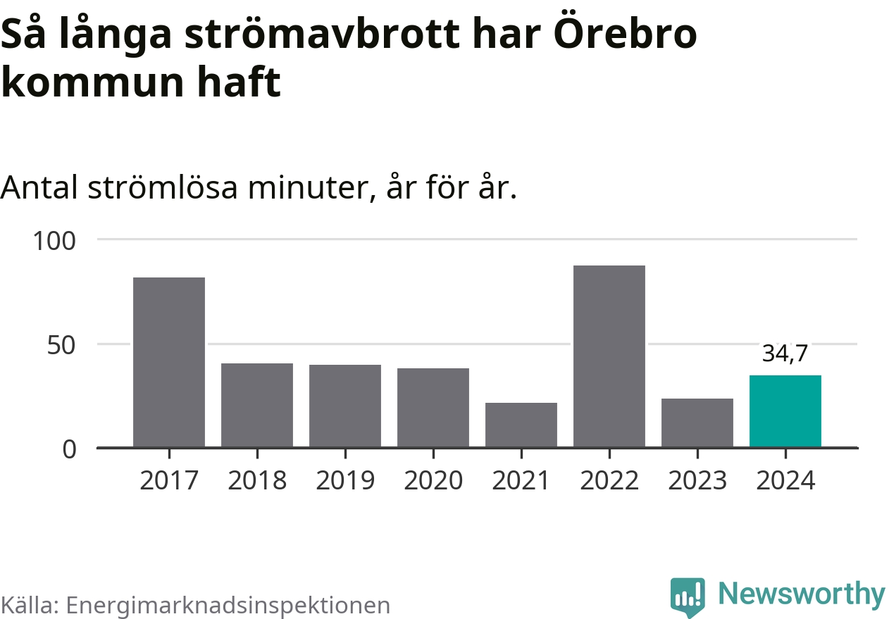Antalet strömavbrott och total strömlös tid varierar något från år till år i Örebro kommun. Mest tid utan ström (i alla fall under perioden 2017–2024) fick örebroarna genomleva under 2022 – en timme och 27 minuter. Det är 48 minuter längre än under ett normalår.