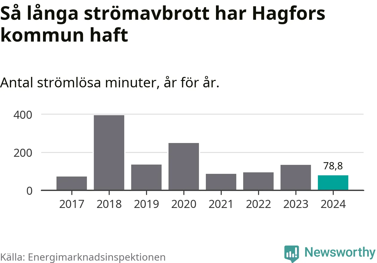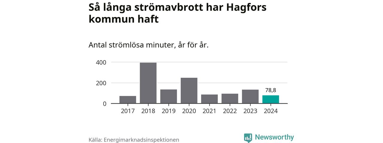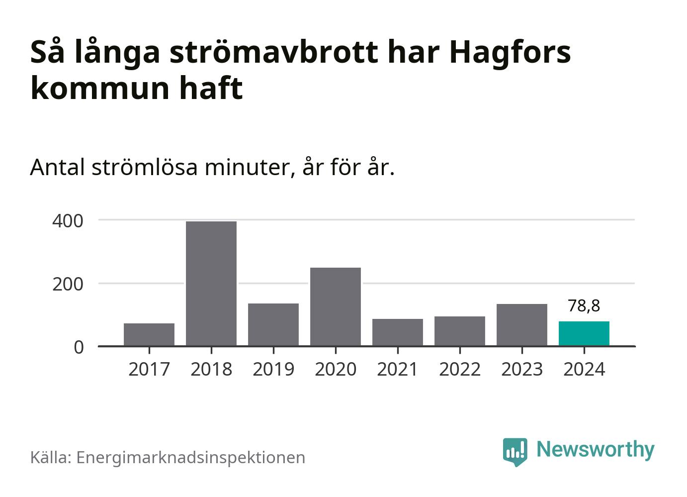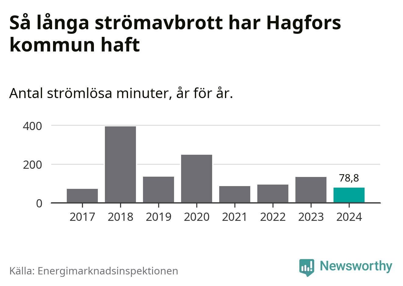 Antalet strömavbrott och total strömlös tid varierar från år till år i Hagfors kommun. Mest tid utan ström (i alla fall under perioden 2017–2024) fick Hagforsborna genomleva under 2018 – sex timmar och 34 minuter. Det är fyra timmar och 41 minuter längre än under ett normalår.