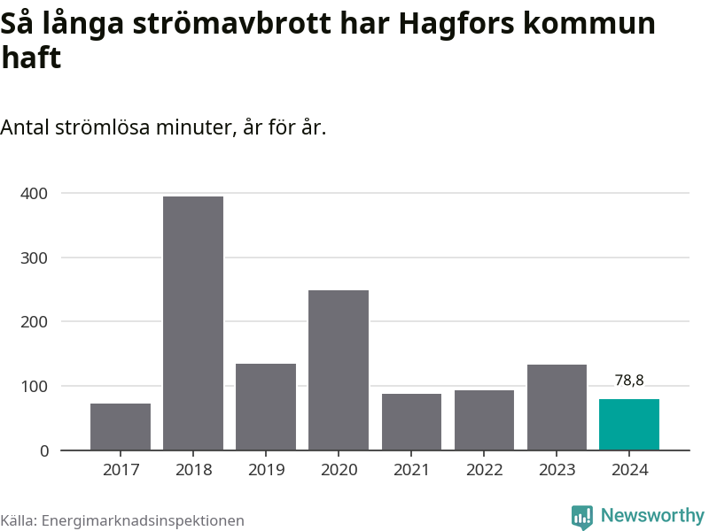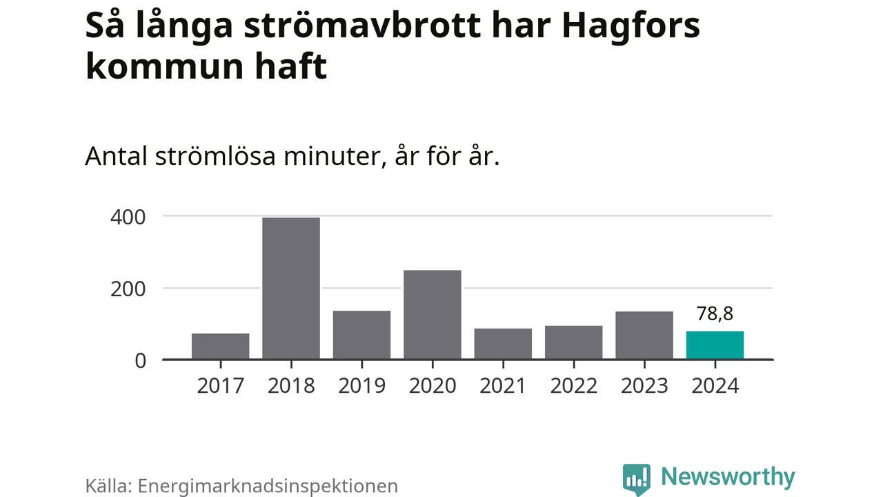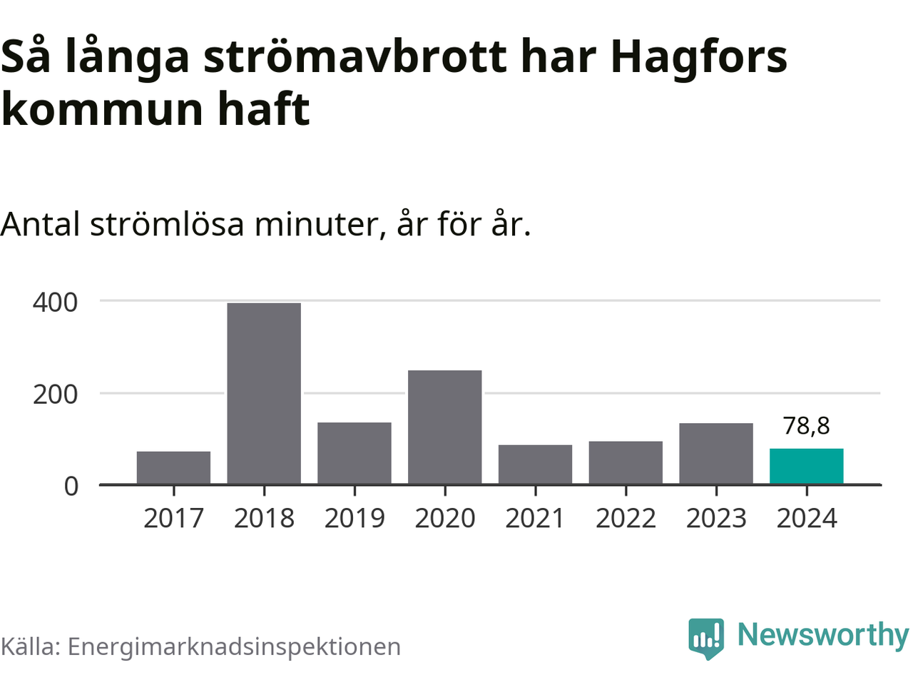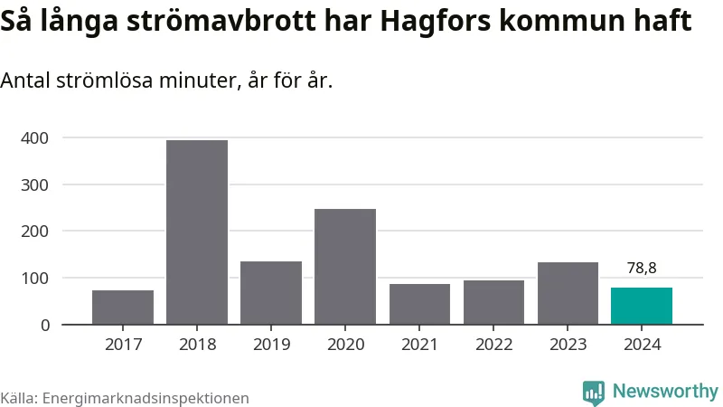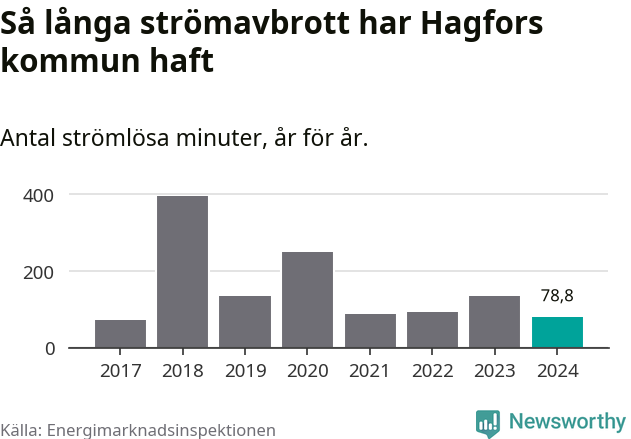 Antalet strömavbrott och total strömlös tid varierar från år till år i Hagfors kommun. Mest tid utan ström (i alla fall under perioden 2017–2024) fick Hagforsborna genomleva under 2018 – sex timmar och 34 minuter. Det är fyra timmar och 41 minuter längre än under ett normalår.