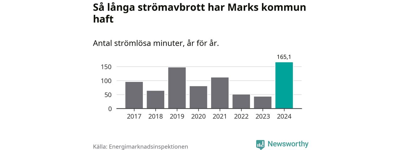 Antalet strömavbrott och total strömlös tid varierar något från år till år i Marks kommun. Mest tid utan ström (i alla fall under perioden 2017–2024) fick Markborna genomleva under 2024 – två timmar och 45 minuter. Det är en timme och 18 minuter längre än under ett normalår.