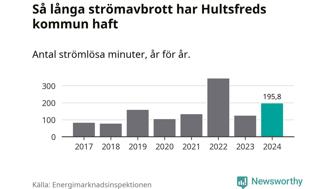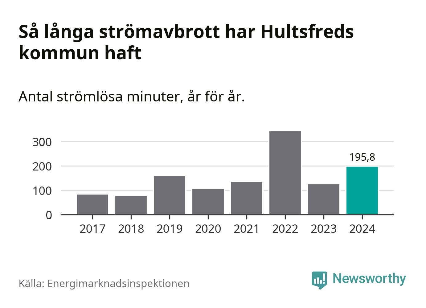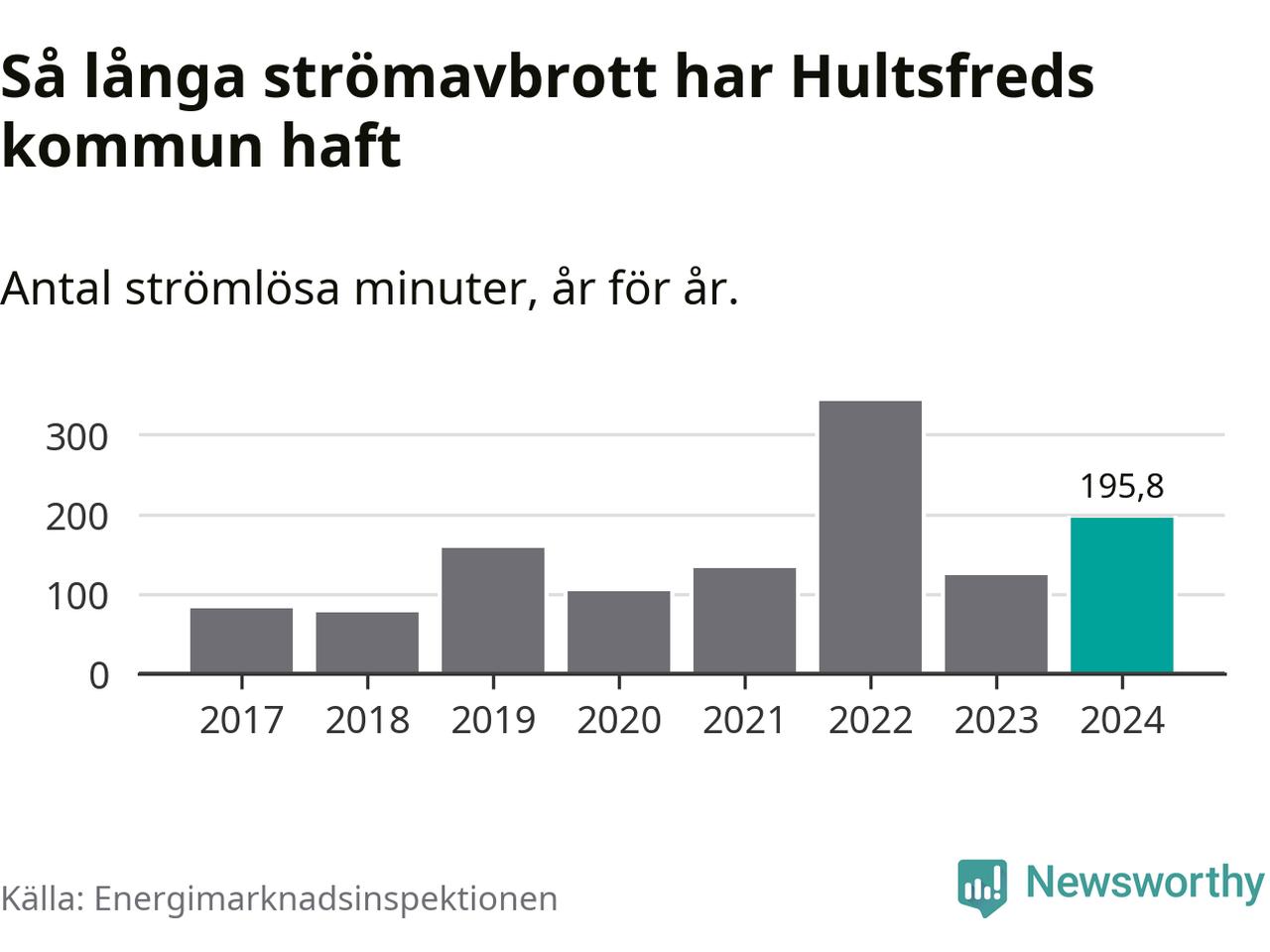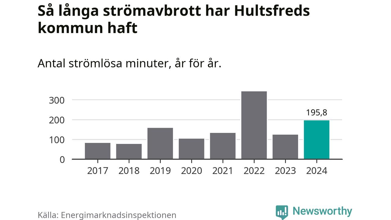 Antalet strömavbrott och total strömlös tid varierar från år till år i Hultsfreds kommun. Mest tid utan ström (i alla fall under perioden 2017–2024) fick Hultsfredsborna genomleva under 2022 – fem timmar och 42 minuter. Det är ungefär lika lång tid som det tar att se hela ”Tillbaka till framtiden”-trilogin.