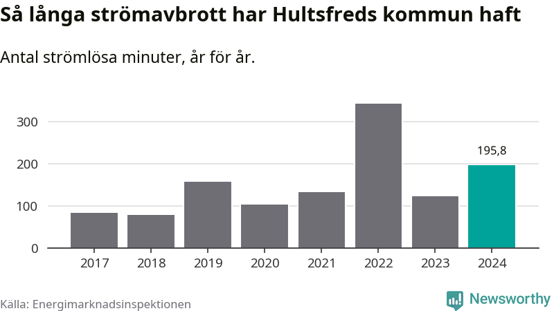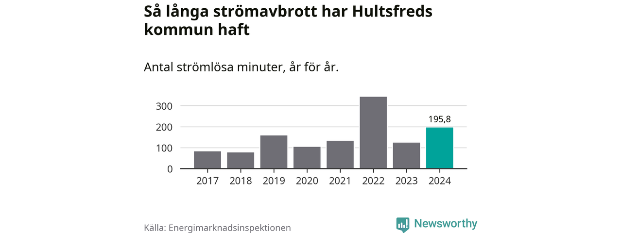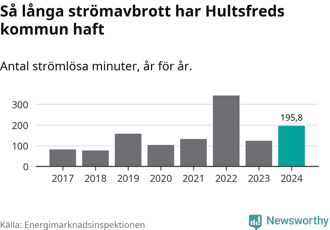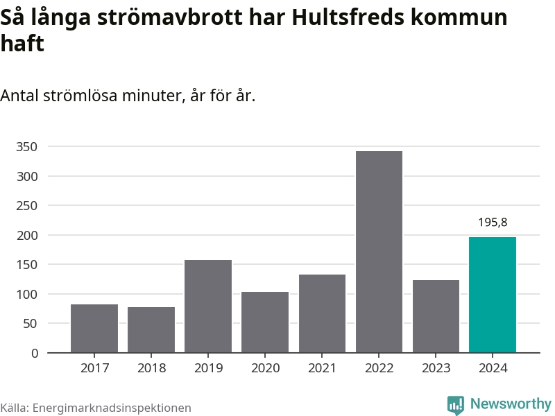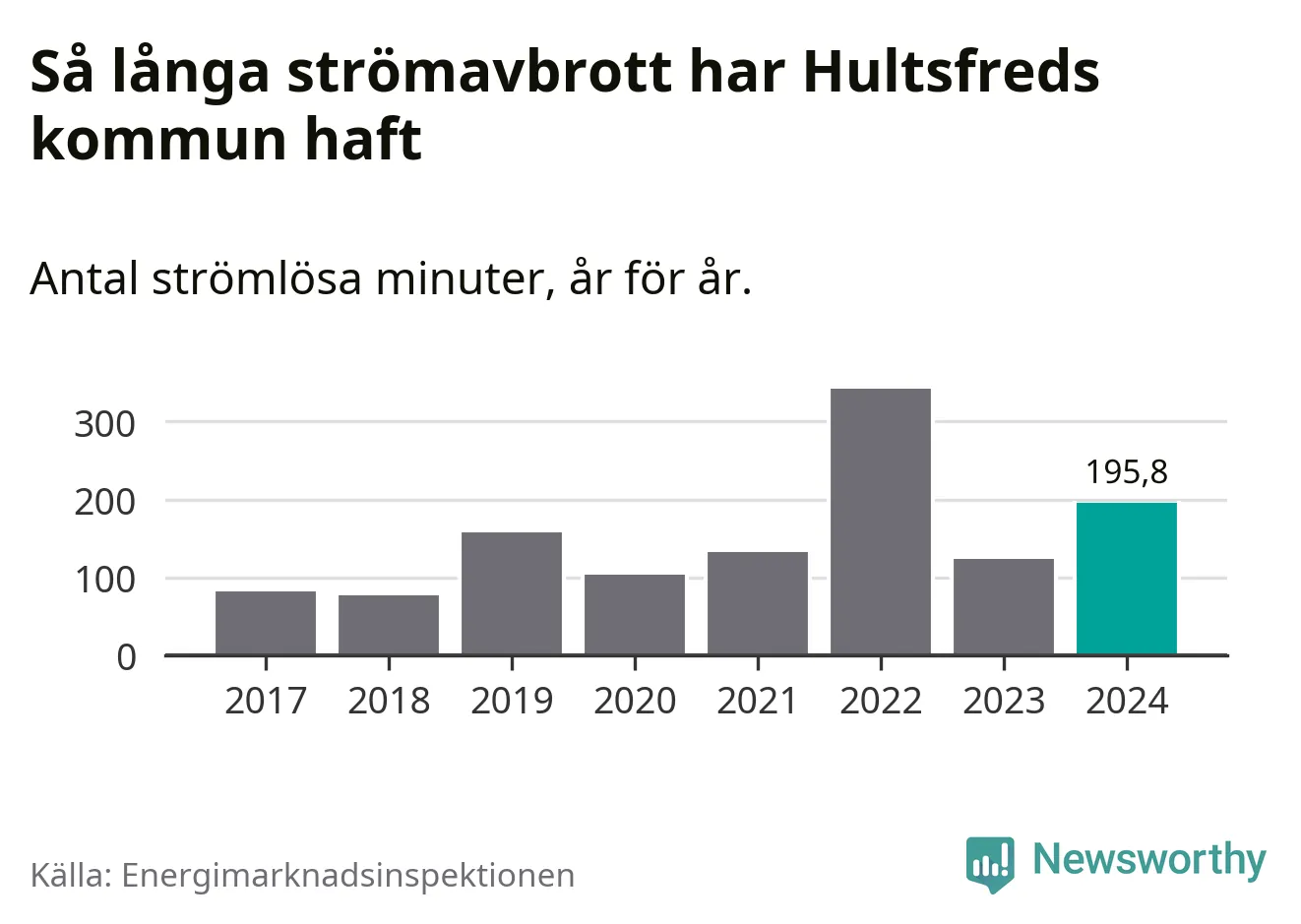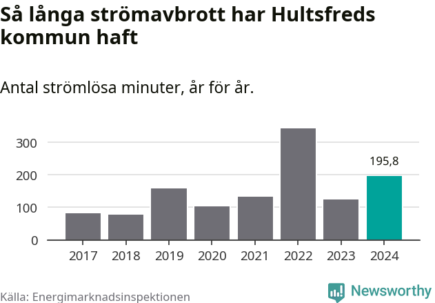 Antalet strömavbrott och total strömlös tid varierar från år till år i Hultsfreds kommun. Mest tid utan ström (i alla fall under perioden 2017–2024) fick Hultsfredsborna genomleva under 2022 – fem timmar och 42 minuter. Det är ungefär lika lång tid som det tar att se hela ”Tillbaka till framtiden”-trilogin.
