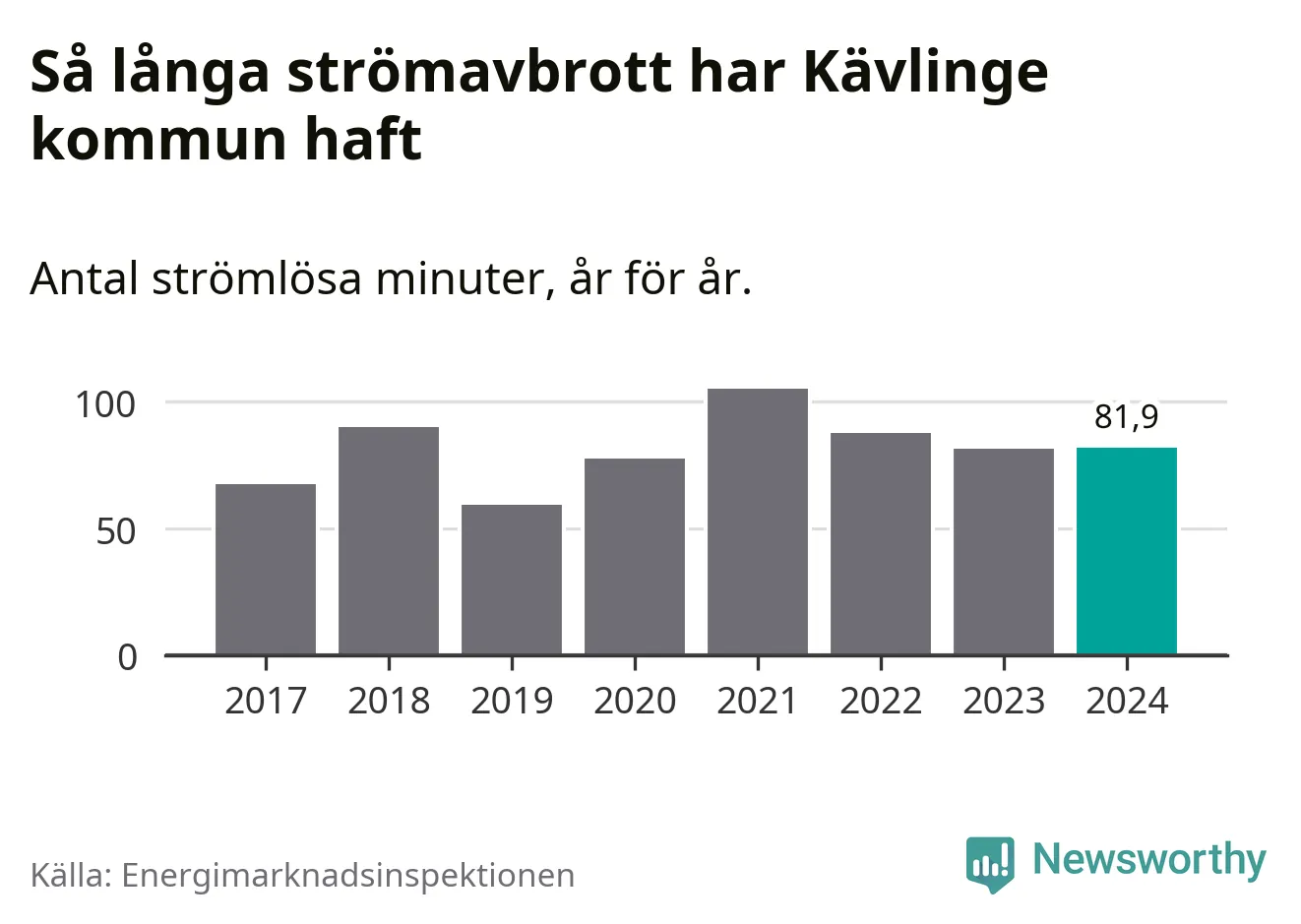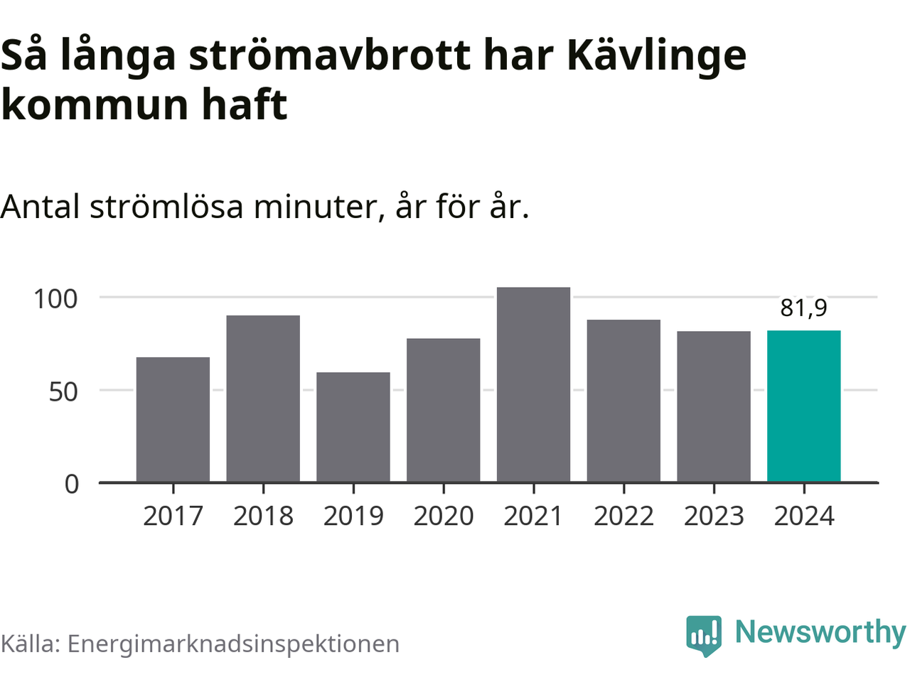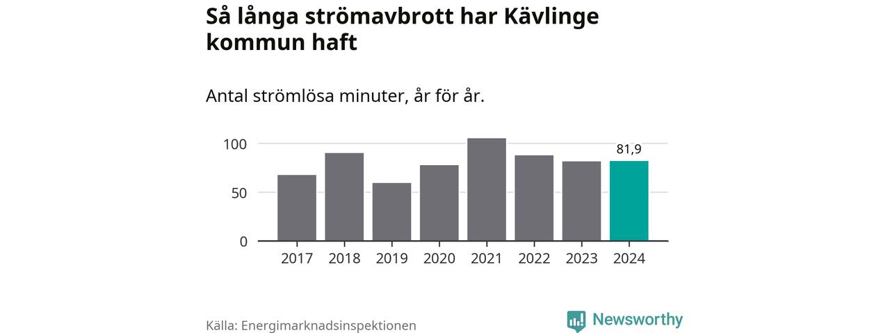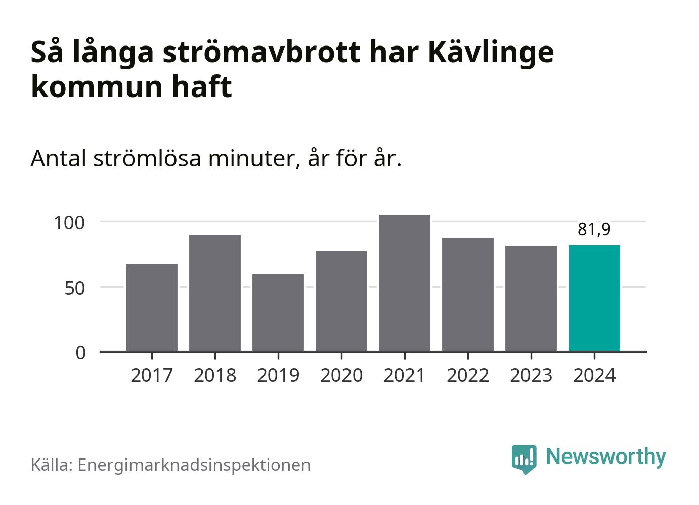Antalet strömavbrott och total strömlös tid varierar något från år till år i Kävlinge kommun. Mest tid utan ström (i alla fall under perioden 2017–2024) fick Kävlingeborna genomleva under 2021 – en timme och 45 minuter. Det är 24 minuter längre än under ett normalår.