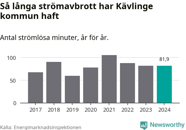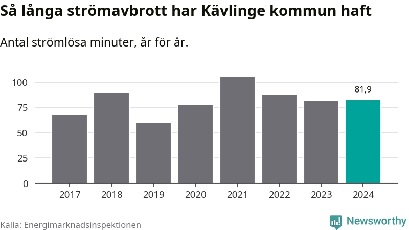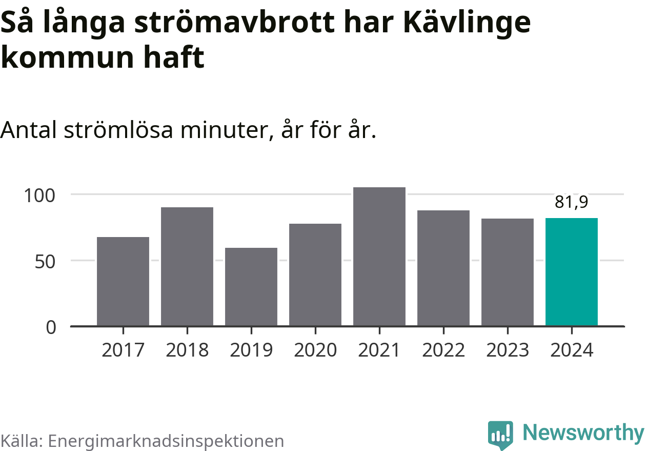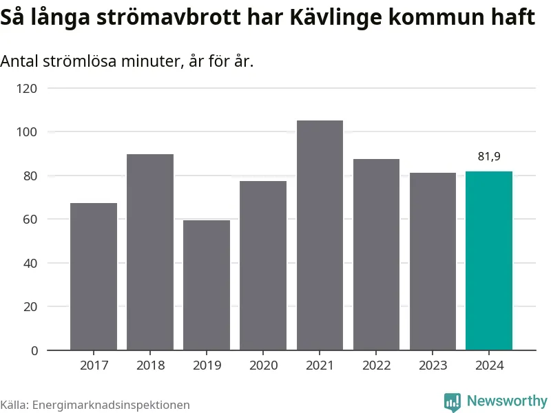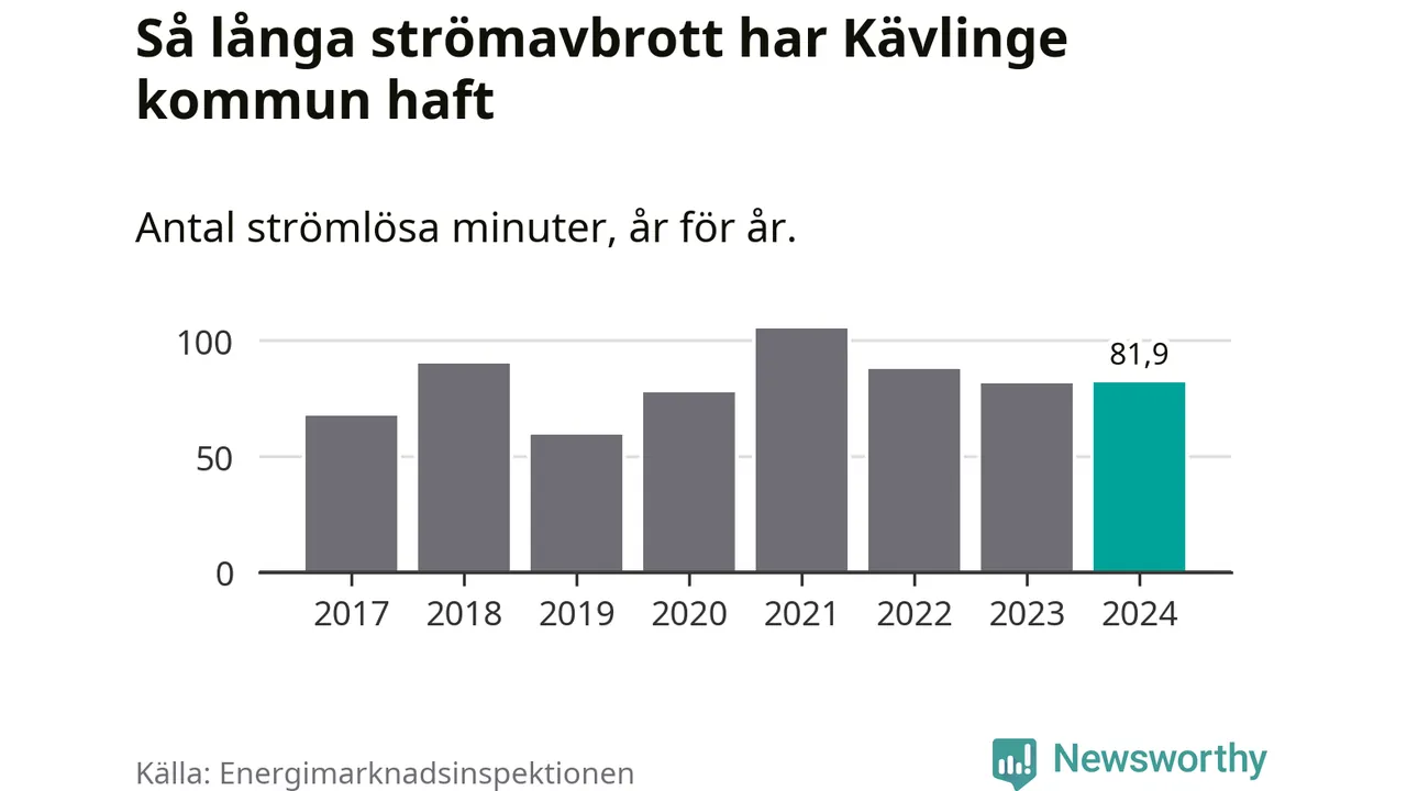 Antalet strömavbrott och total strömlös tid varierar något från år till år i Kävlinge kommun. Mest tid utan ström (i alla fall under perioden 2017–2024) fick Kävlingeborna genomleva under 2021 – en timme och 45 minuter. Det är 24 minuter längre än under ett normalår.