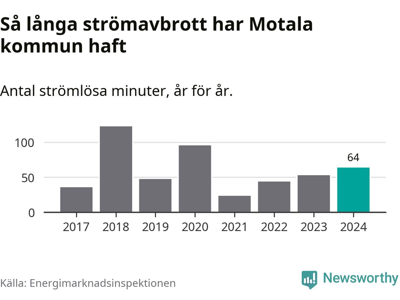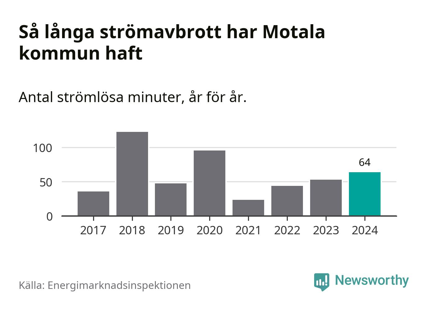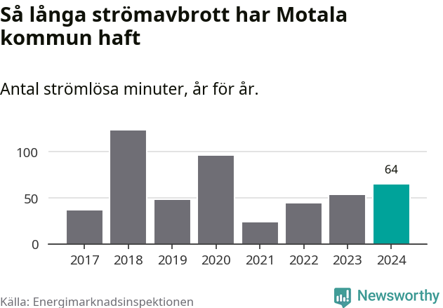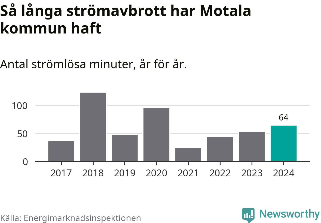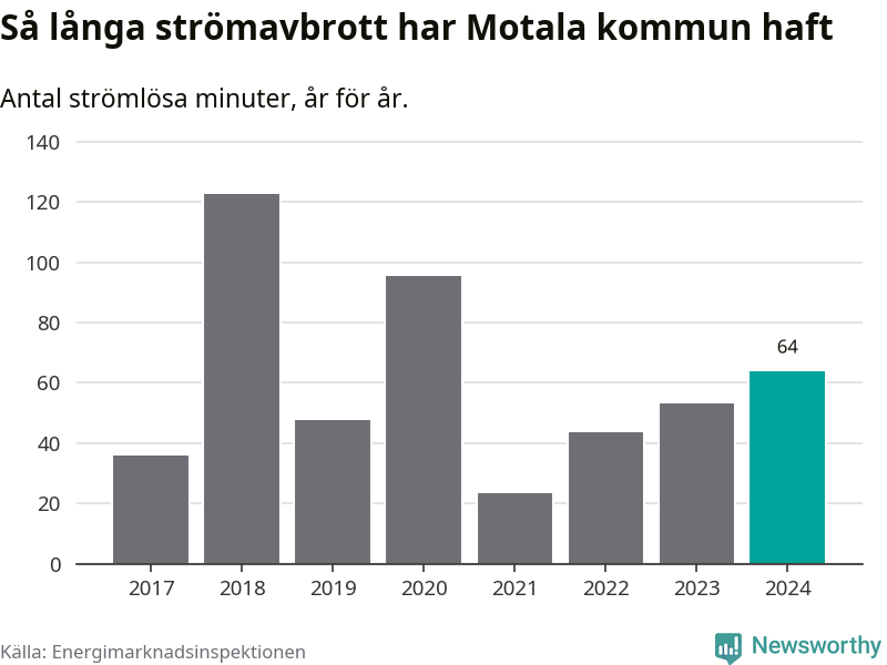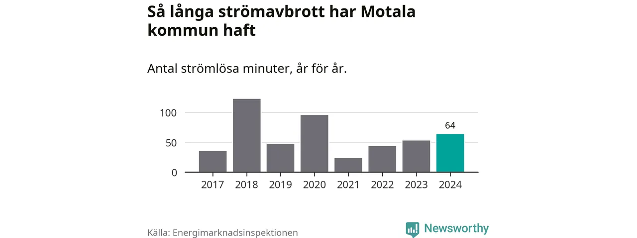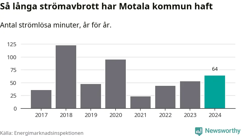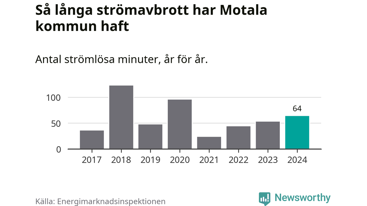 Antalet strömavbrott och total strömlös tid varierar från år till år i Motala kommun. Mest tid utan ström (i alla fall under perioden 2017–2024) fick Motalaborna genomleva under 2018 – två timmar och tre minuter. Det är en timme och tolv minuter längre än under ett normalår.