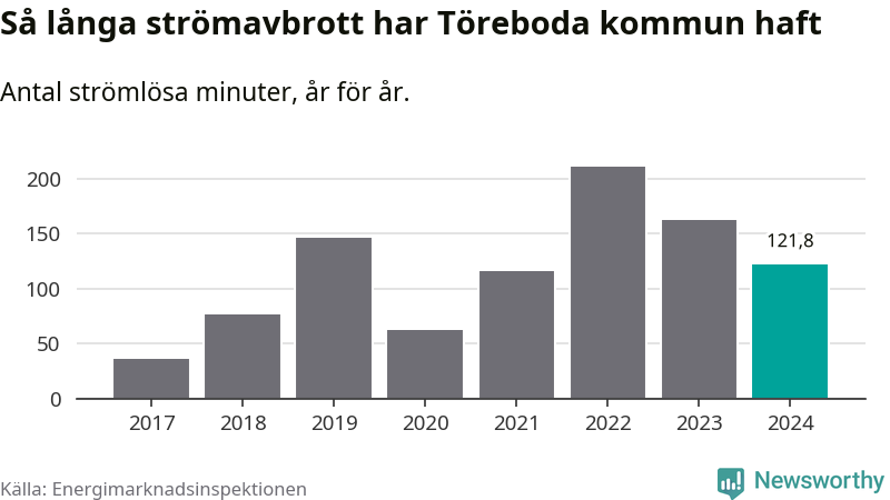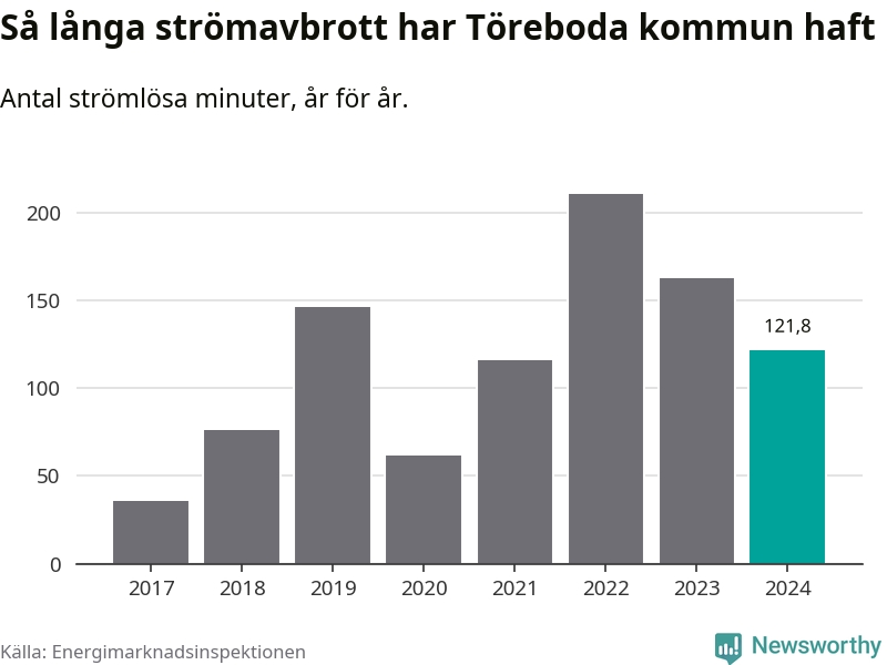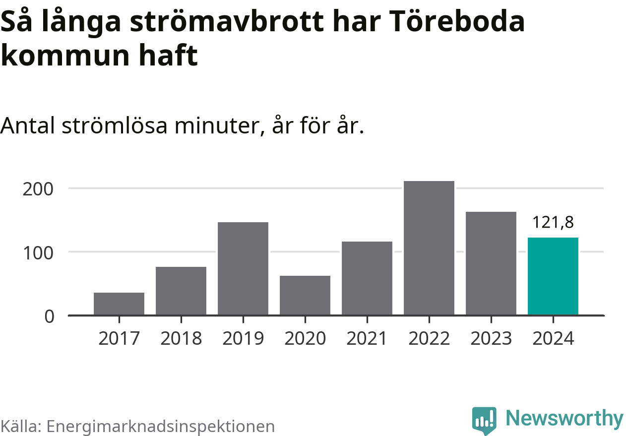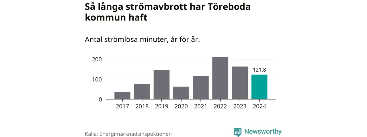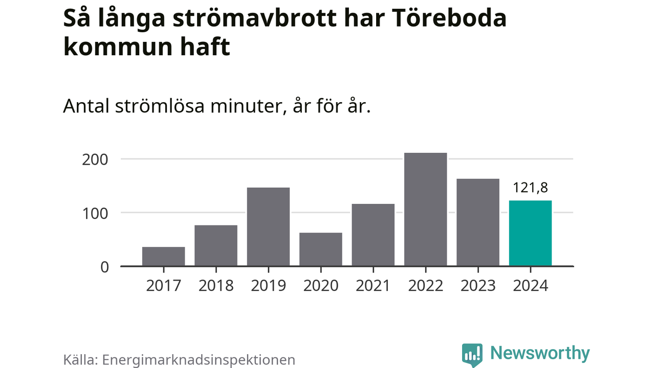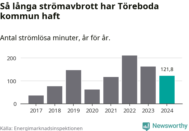 Antalet strömavbrott och total strömlös tid varierar något från år till år i Töreboda kommun. Mest tid utan ström (i alla fall under perioden 2017–2024) fick Törebodaborna genomleva under 2022 – tre timmar och 31 minuter. Det är en timme och 32 minuter längre än under ett normalår.