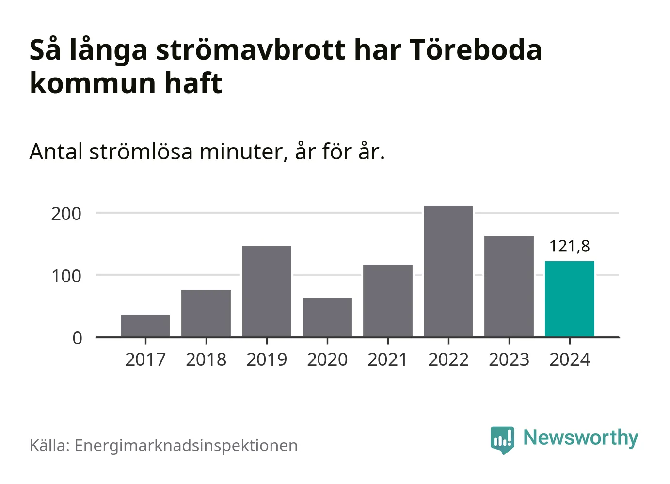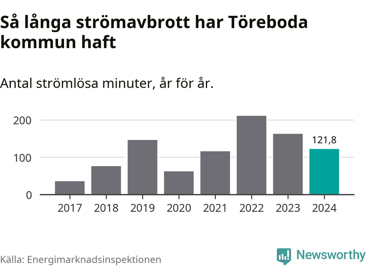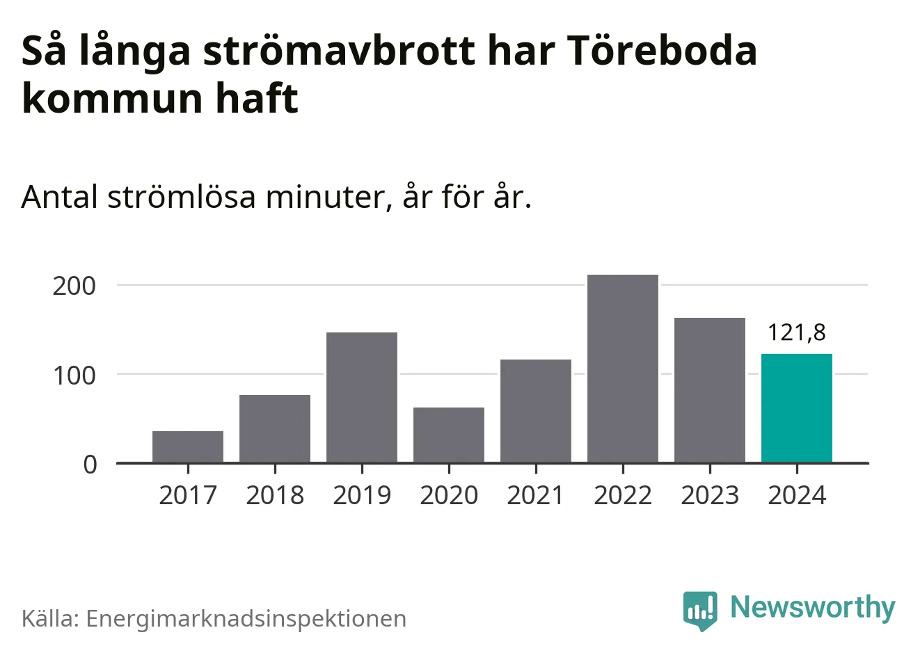 Antalet strömavbrott och total strömlös tid varierar något från år till år i Töreboda kommun. Mest tid utan ström (i alla fall under perioden 2017–2024) fick Törebodaborna genomleva under 2022 – tre timmar och 31 minuter. Det är en timme och 32 minuter längre än under ett normalår.