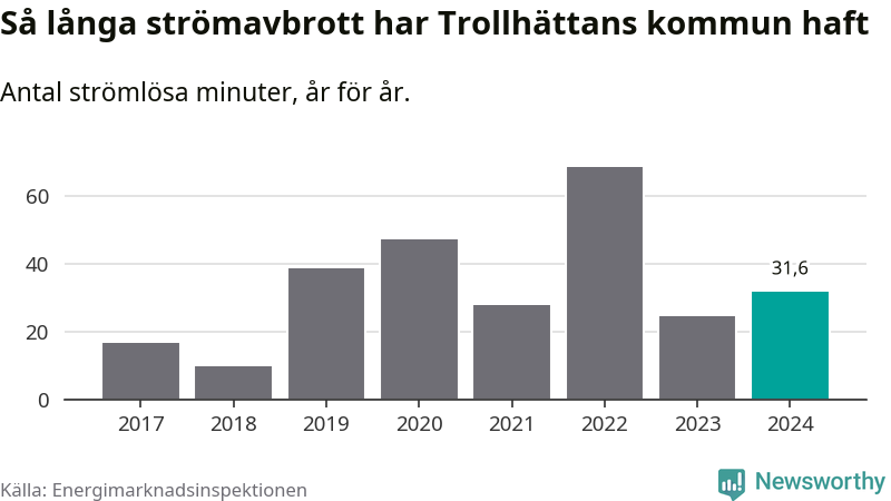 Antalet strömavbrott och total strömlös tid varierar något från år till år i Trollhättans kommun. Mest tid utan ström (i alla fall under perioden 2017–2024) fick Trollhätteborna genomleva under 2022 – en timme och åtta minuter. Det är 39 minuter längre än under ett normalår.