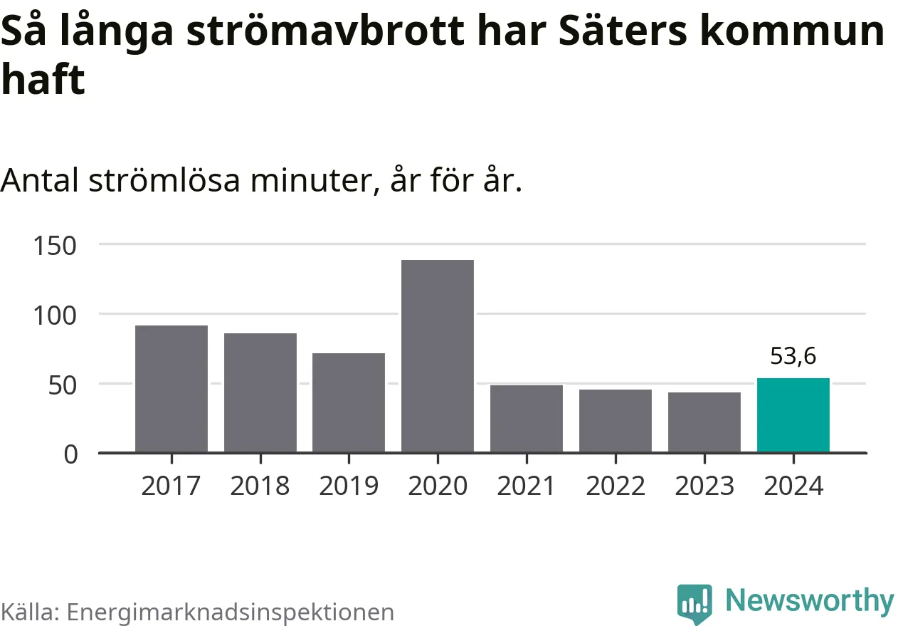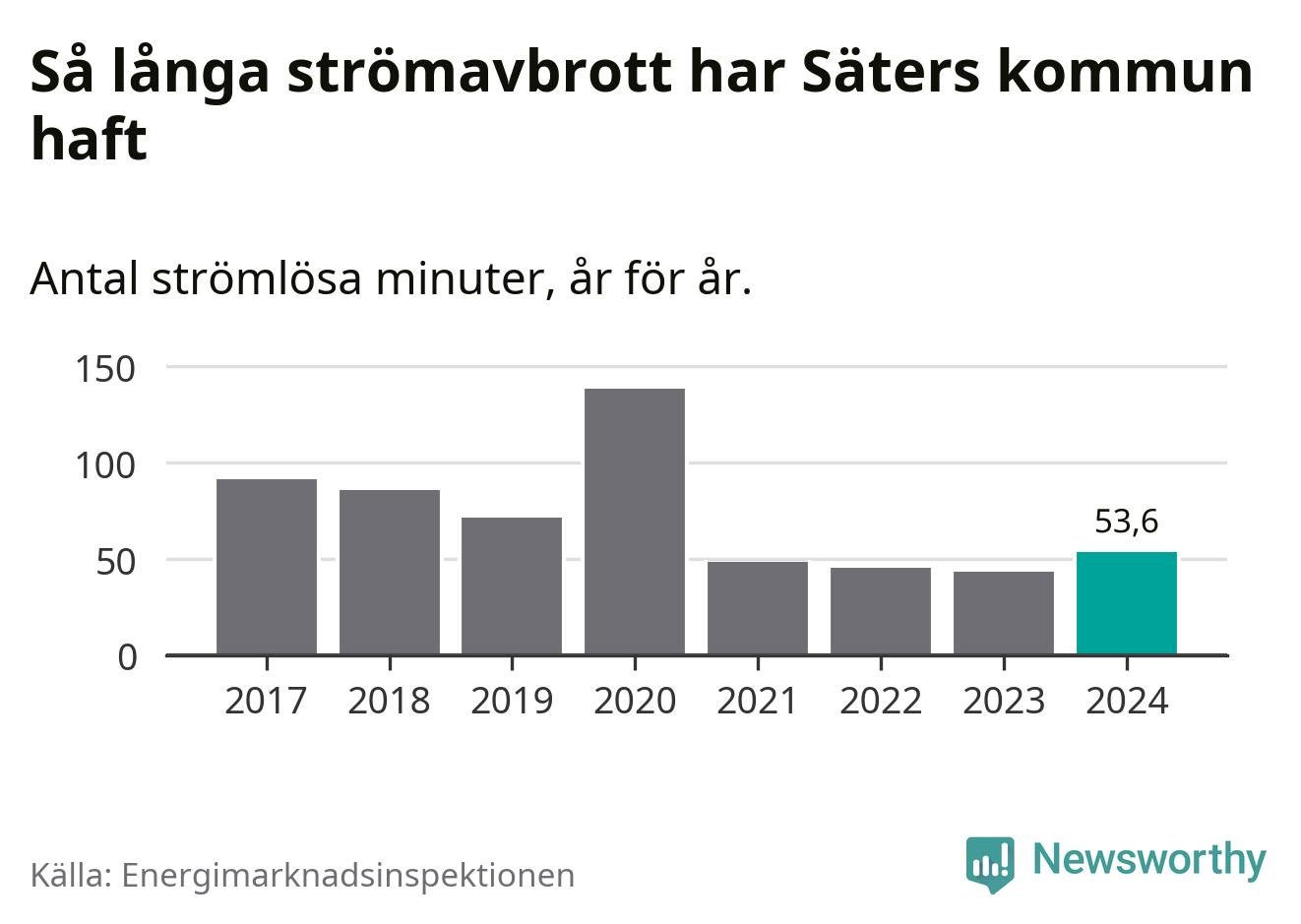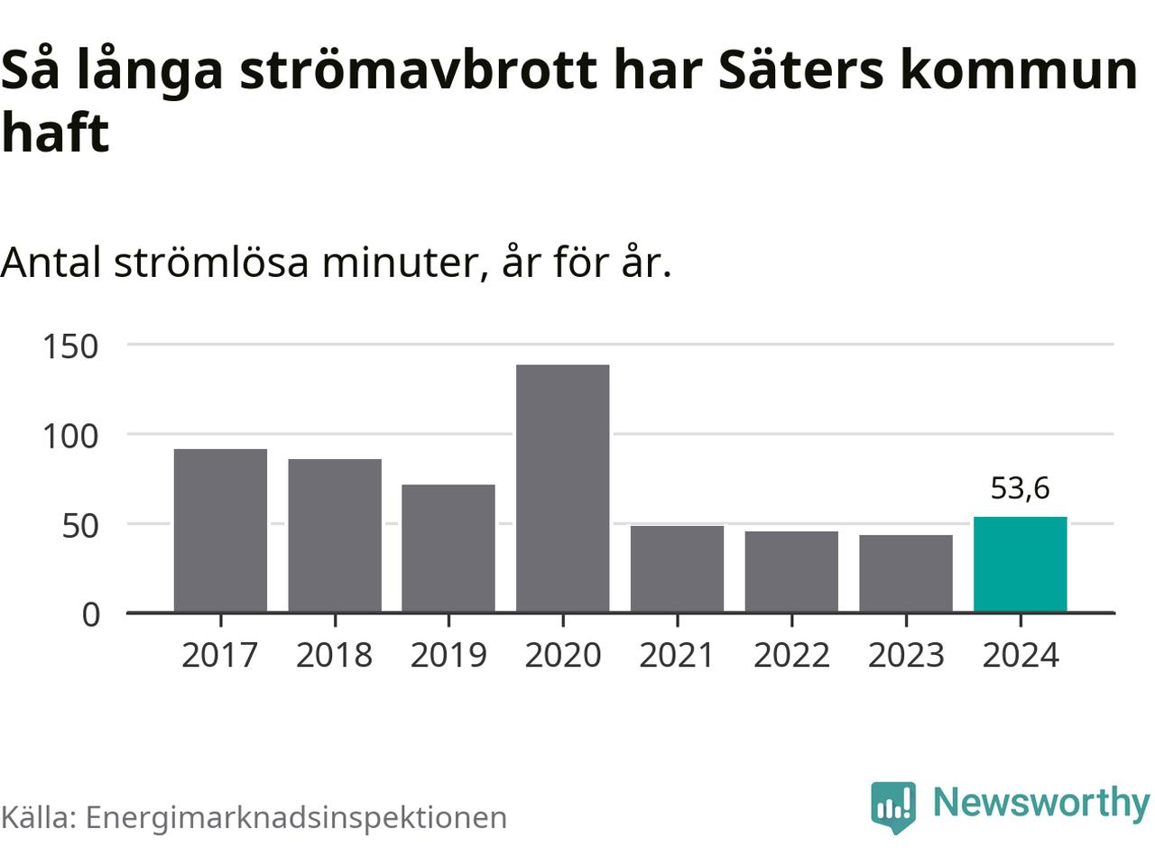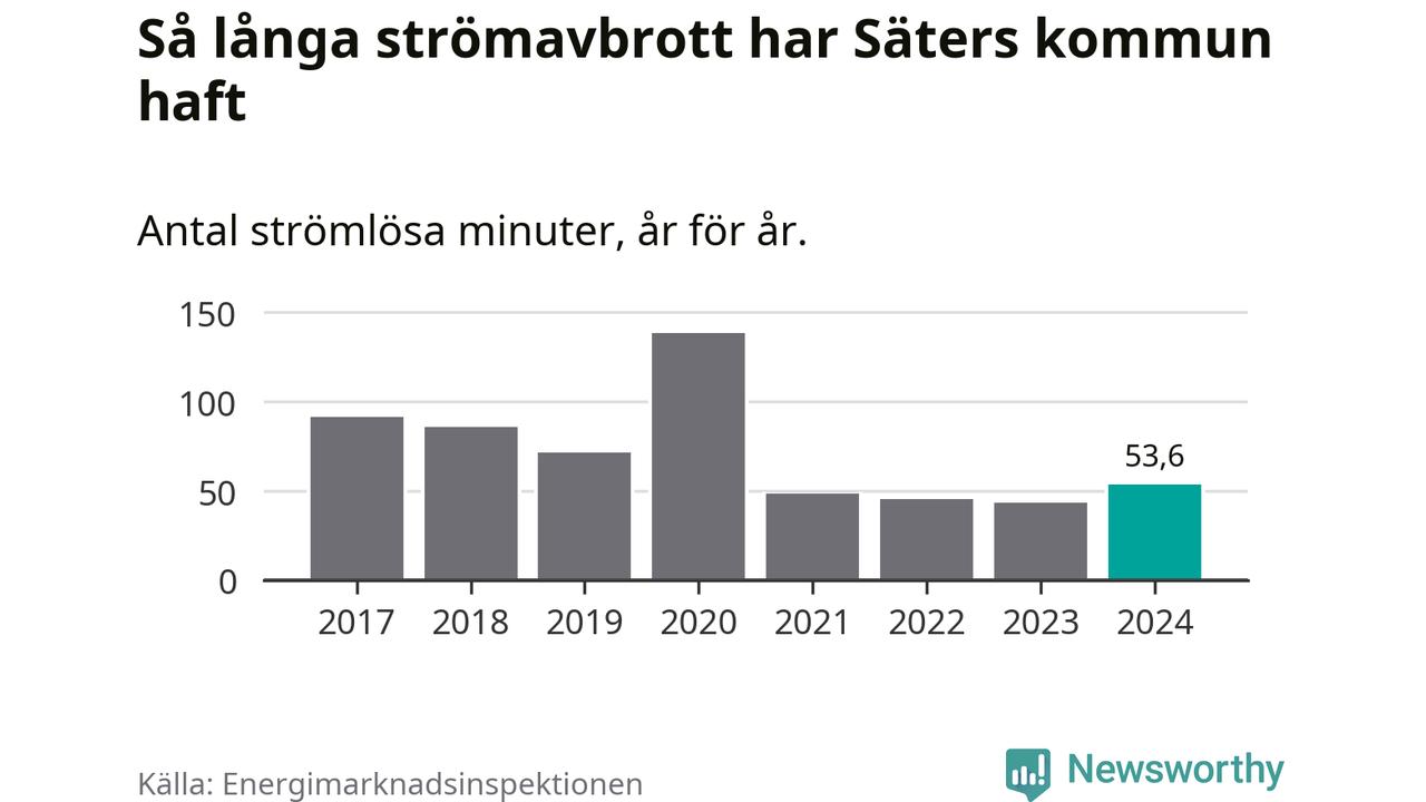 Antalet strömavbrott och total strömlös tid varierar från år till år i Säters kommun. Mest tid utan ström (i alla fall under perioden 2017–2024) fick Säterborna genomleva under 2020 – två timmar och 18 minuter. Det är en timme och 16 minuter längre än under ett normalår.