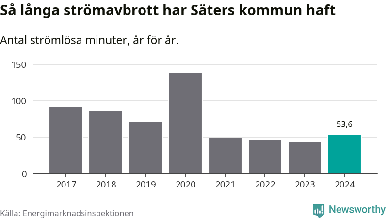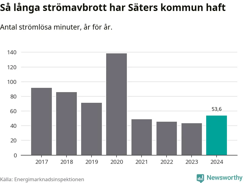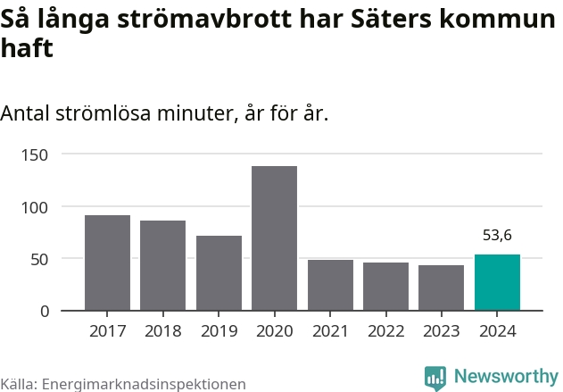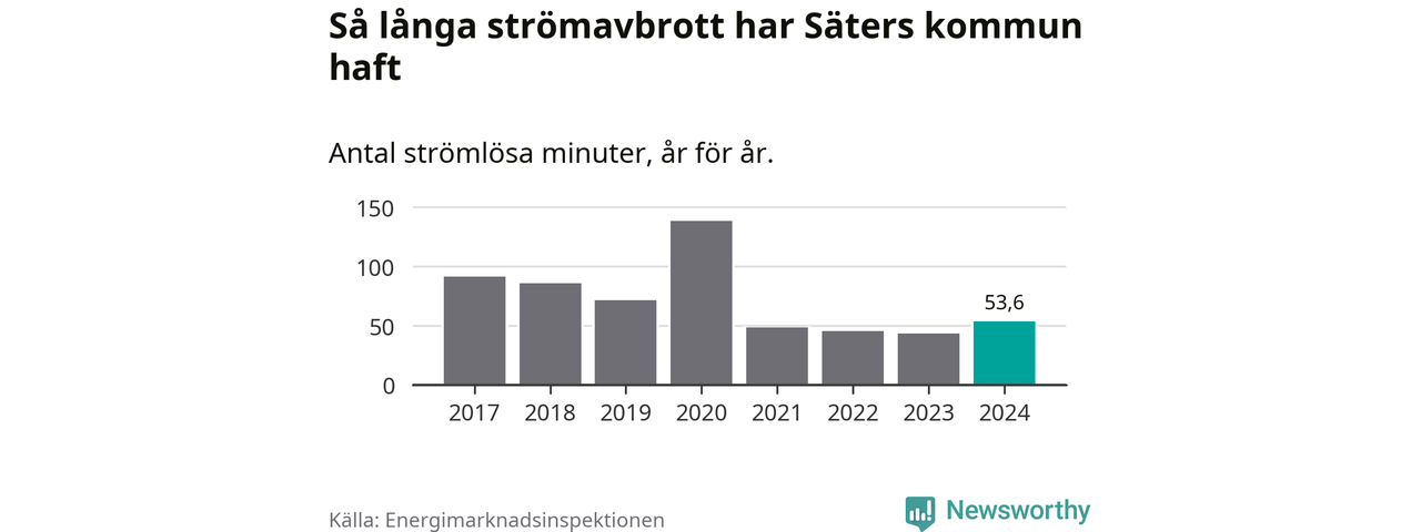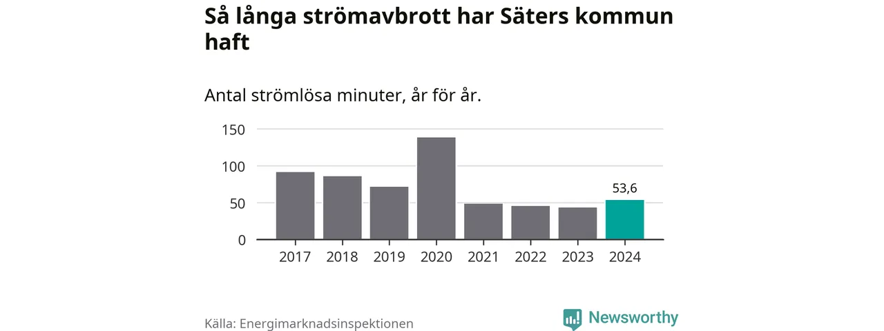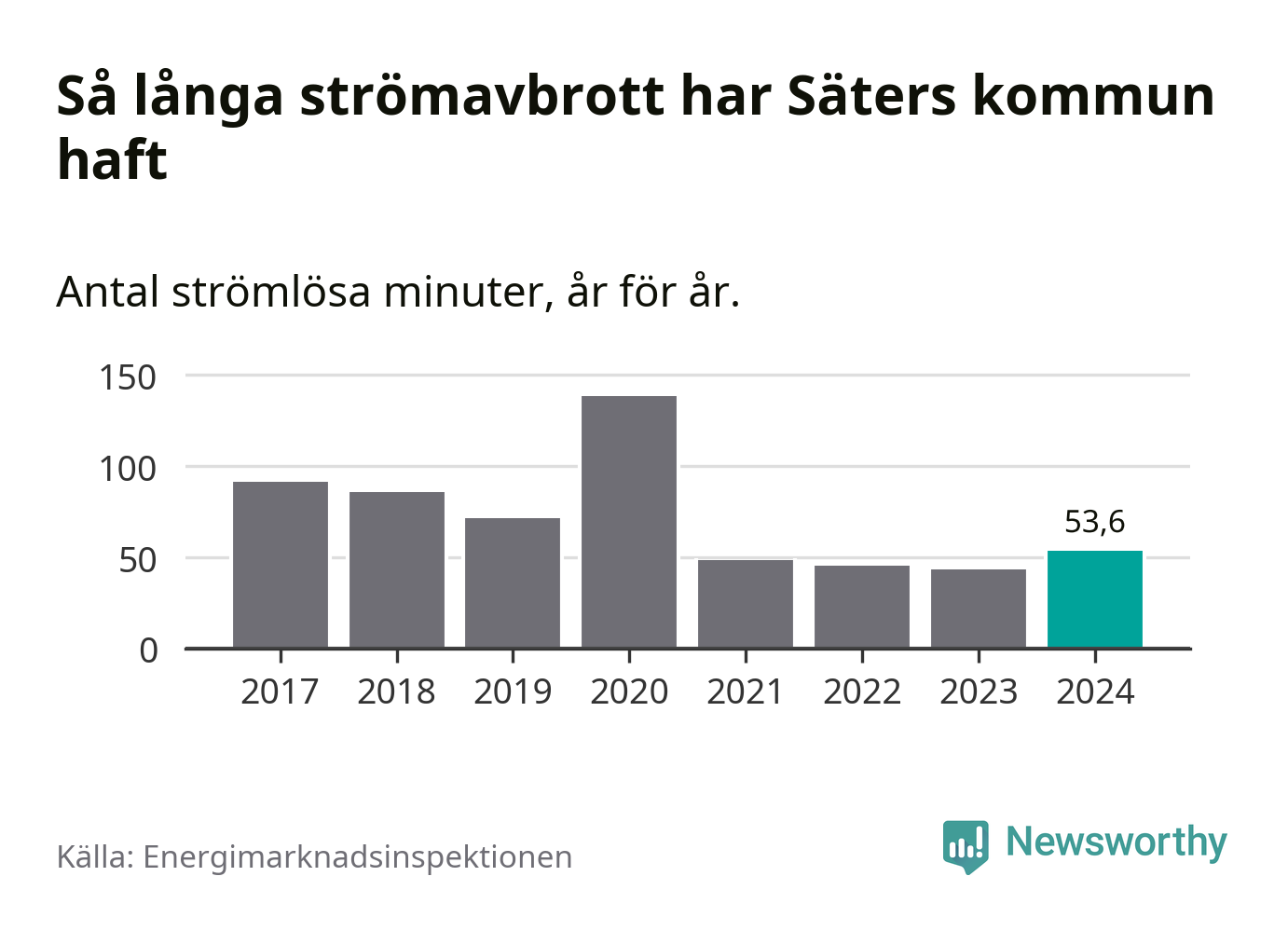 Antalet strömavbrott och total strömlös tid varierar från år till år i Säters kommun. Mest tid utan ström (i alla fall under perioden 2017–2024) fick Säterborna genomleva under 2020 – två timmar och 18 minuter. Det är en timme och 16 minuter längre än under ett normalår.