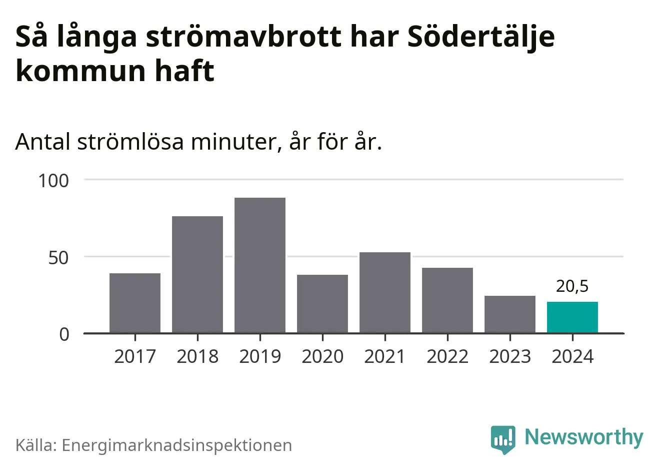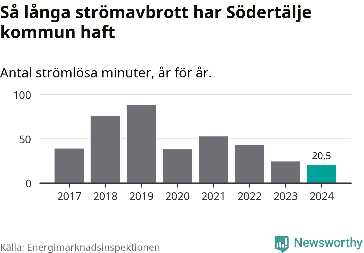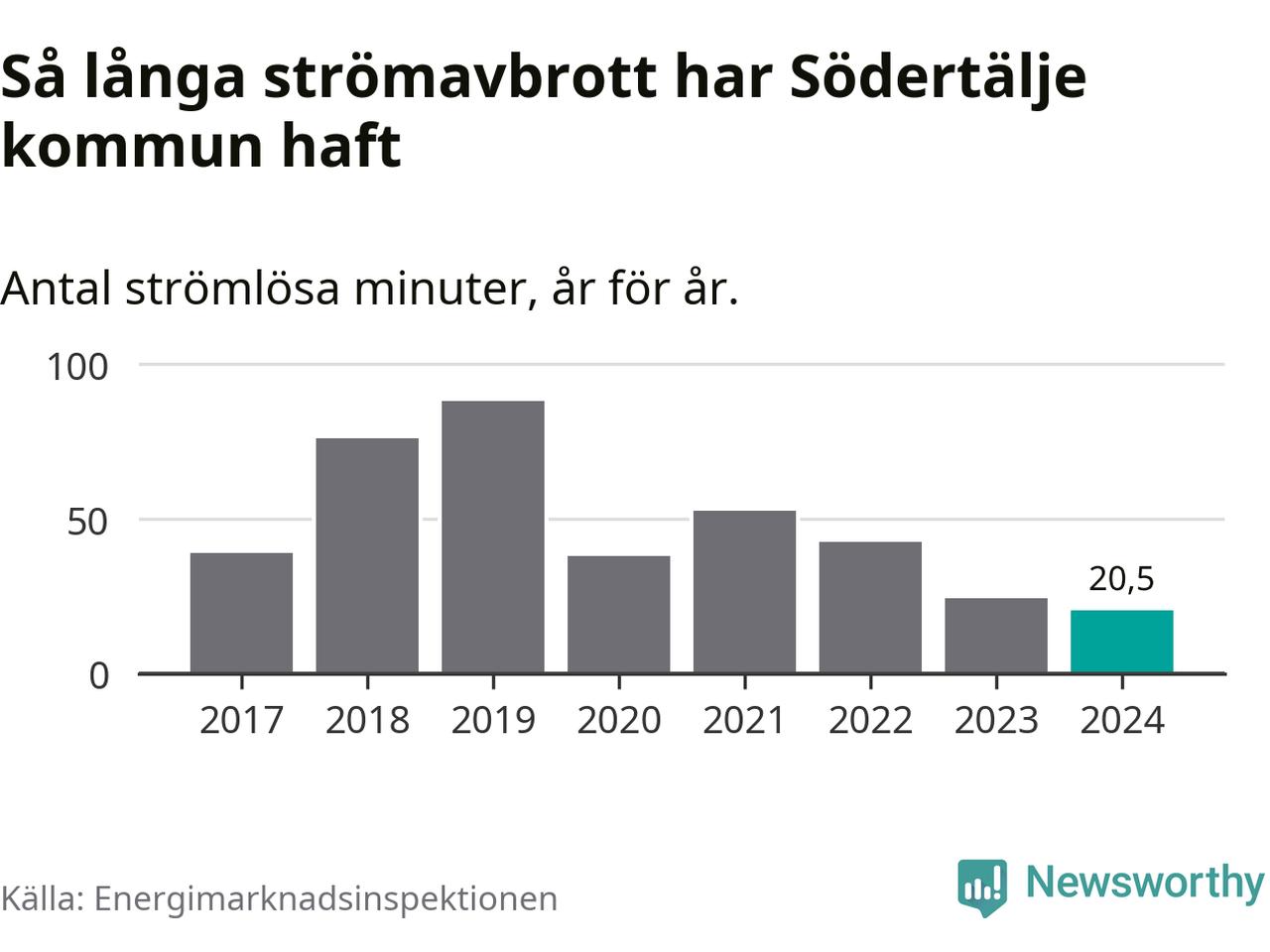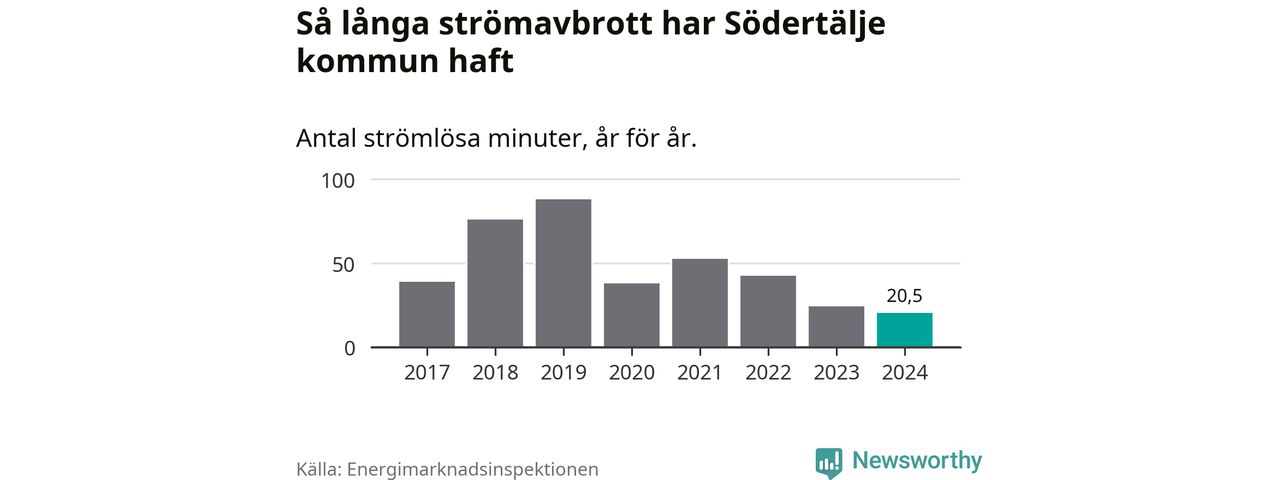Antalet strömavbrott och total strömlös tid varierar något från år till år i Södertälje kommun. Mest tid utan ström (i alla fall under perioden 2017–2024) fick Södertäljeborna genomleva under 2019 – en timme och 28 minuter. Det är 47 minuter längre än under ett normalår.