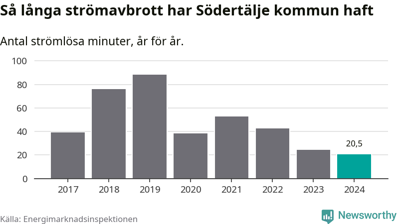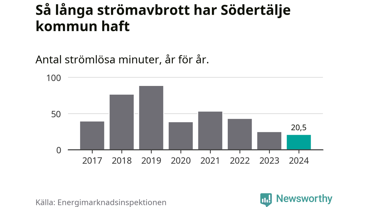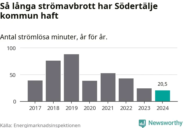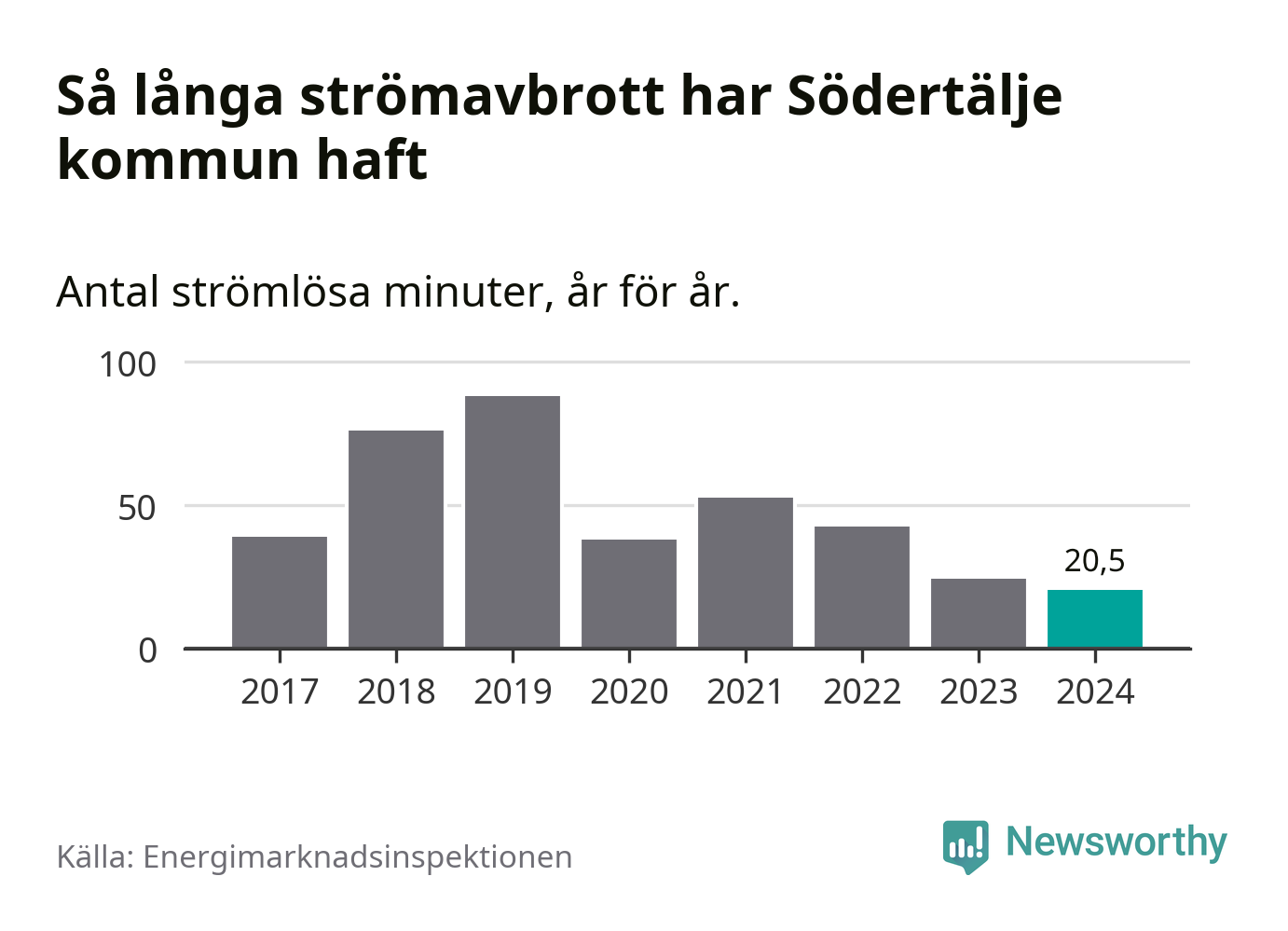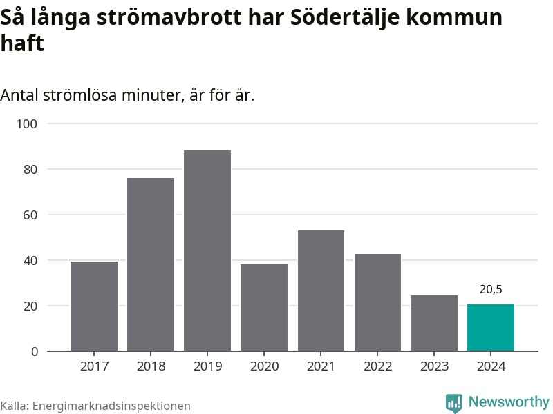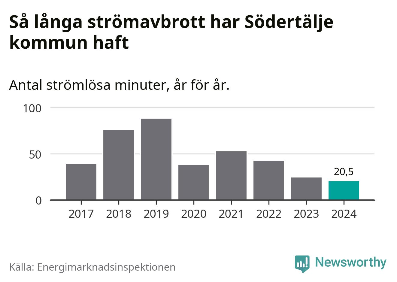 Antalet strömavbrott och total strömlös tid varierar något från år till år i Södertälje kommun. Mest tid utan ström (i alla fall under perioden 2017–2024) fick Södertäljeborna genomleva under 2019 – en timme och 28 minuter. Det är 47 minuter längre än under ett normalår.