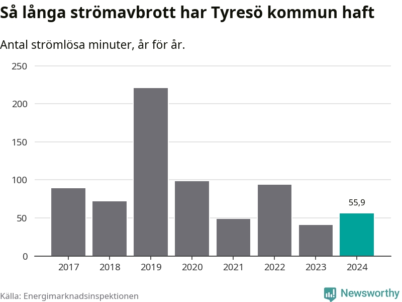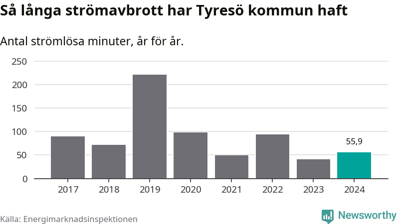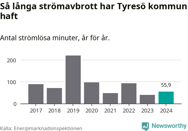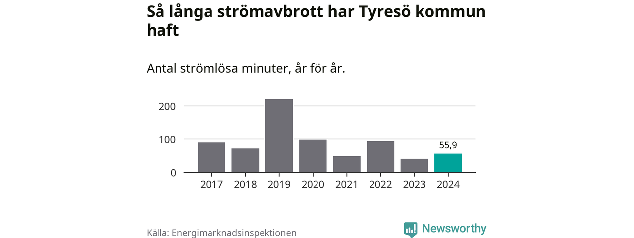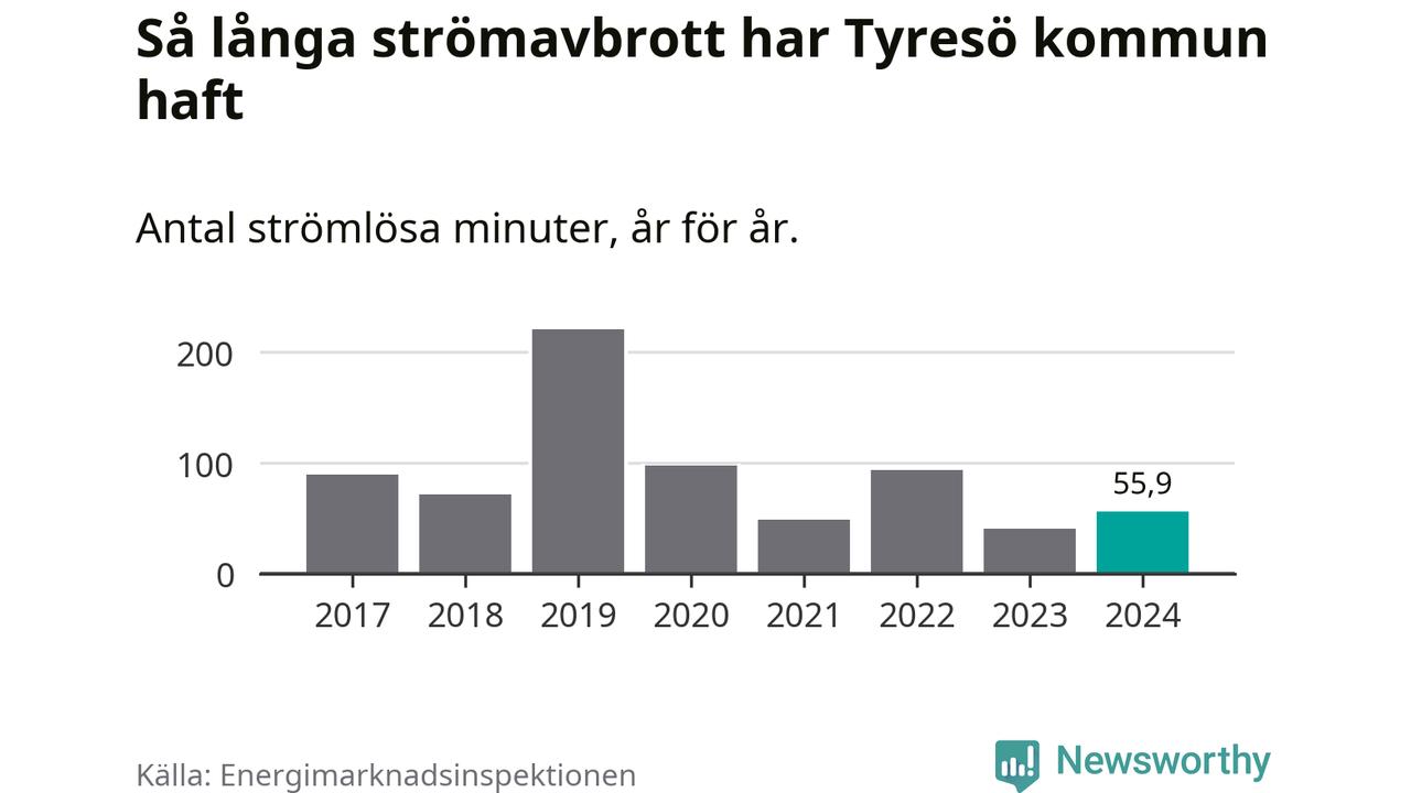 Antalet strömavbrott och total strömlös tid varierar från år till år i Tyresö kommun. Mest tid utan ström (i alla fall under perioden 2017–2024) fick Tyresöborna genomleva under 2019 – tre timmar och 41 minuter. Det är två timmar och 20 minuter längre än under ett normalår.