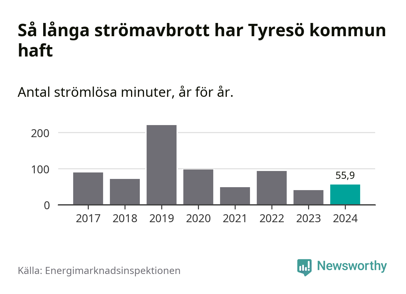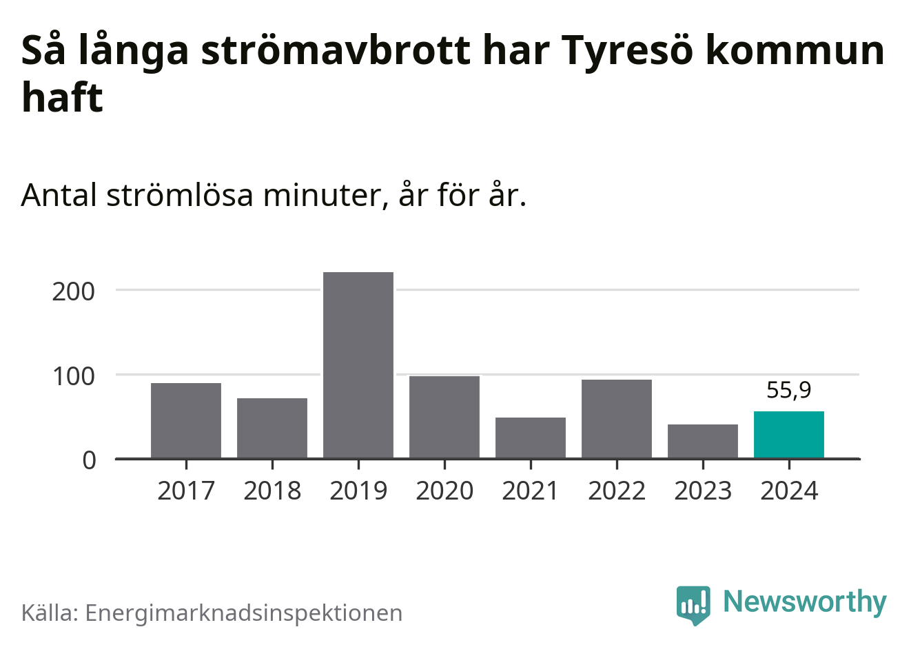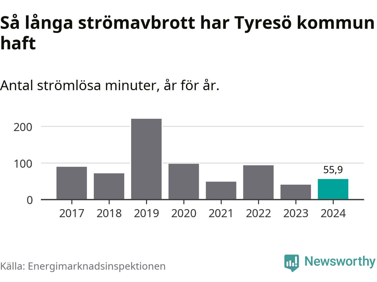 Antalet strömavbrott och total strömlös tid varierar från år till år i Tyresö kommun. Mest tid utan ström (i alla fall under perioden 2017–2024) fick Tyresöborna genomleva under 2019 – tre timmar och 41 minuter. Det är två timmar och 20 minuter längre än under ett normalår.