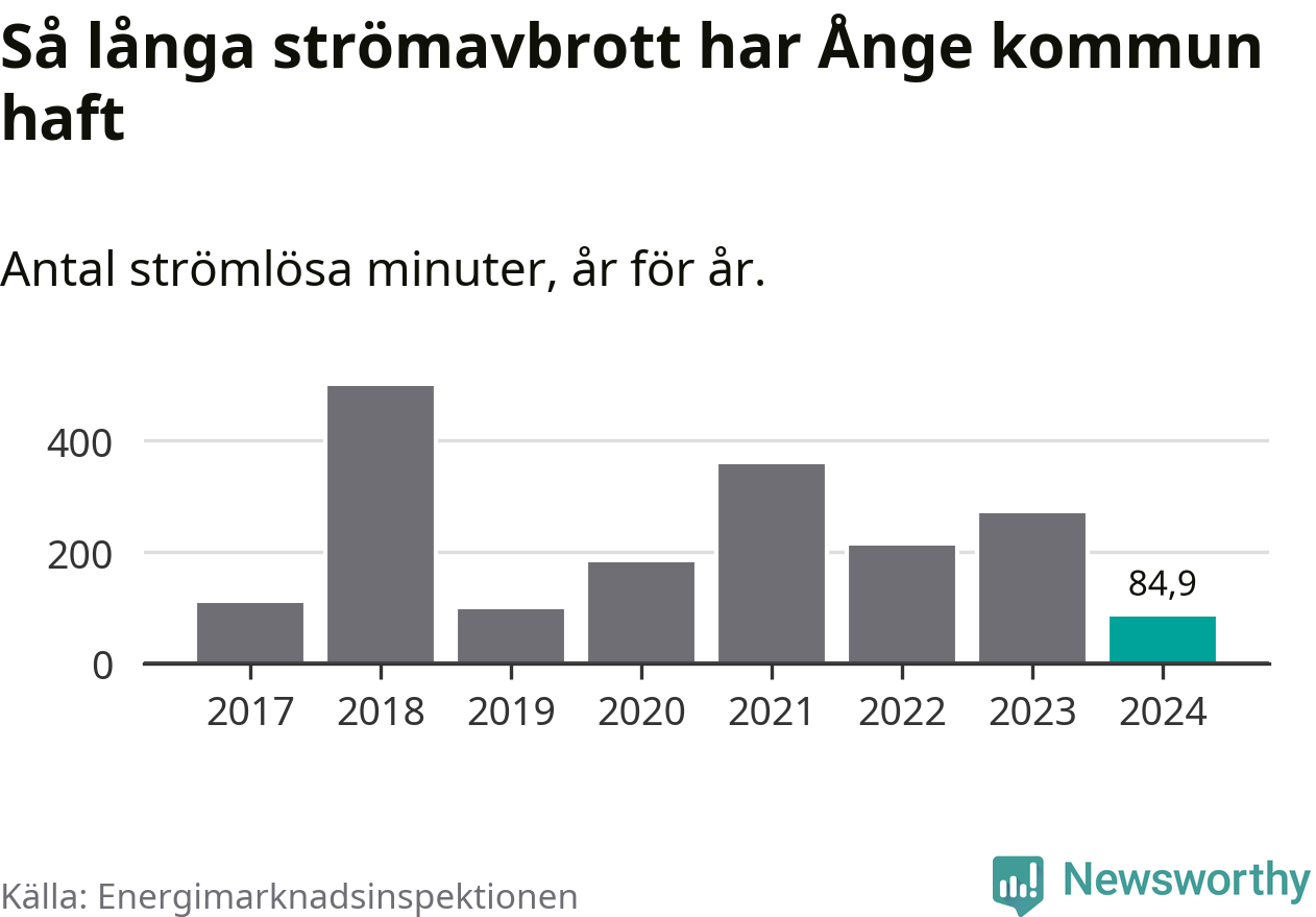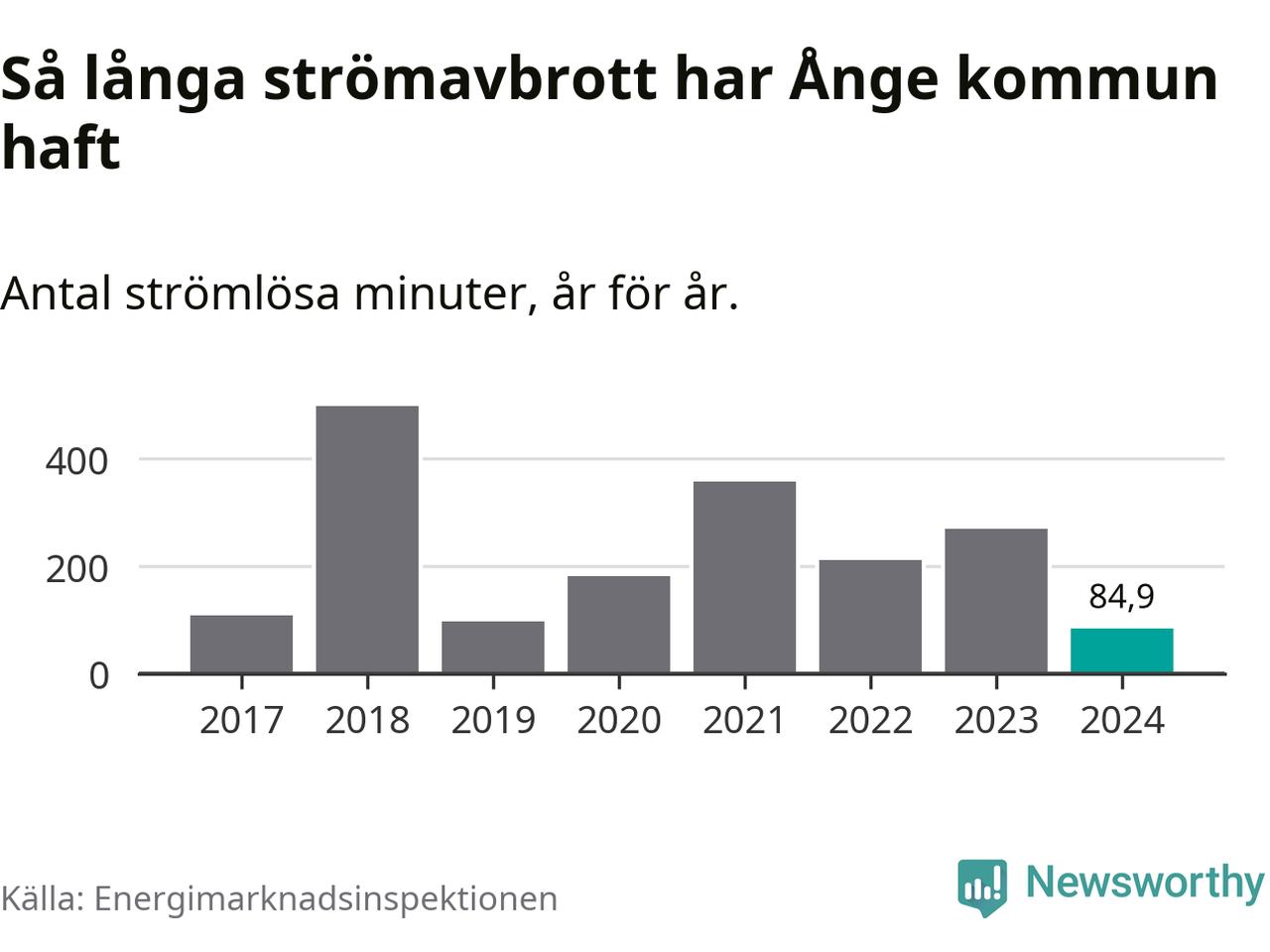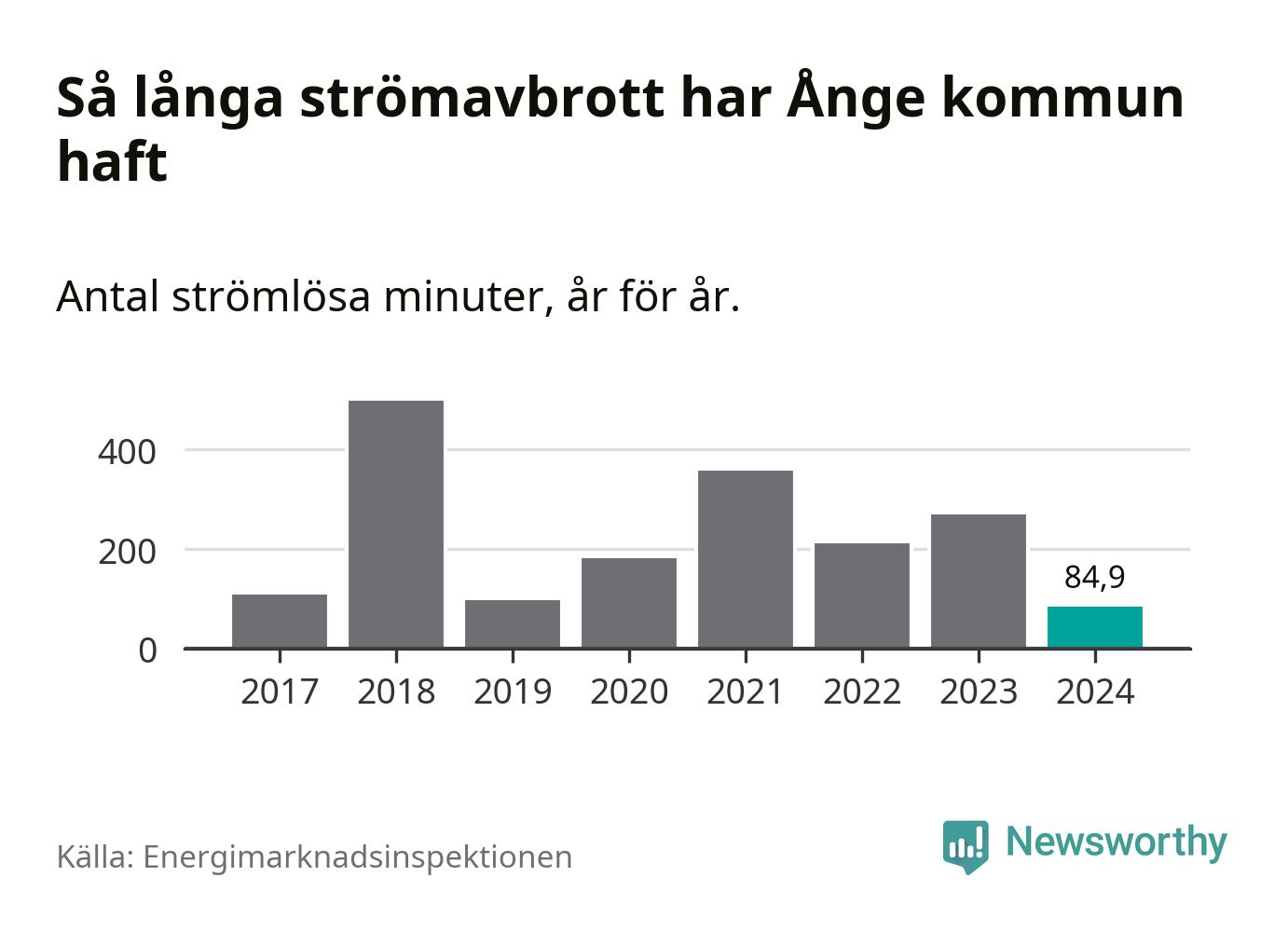 Antalet strömavbrott och total strömlös tid varierar från år till år i Ånge kommun. Mest tid utan ström (i alla fall under perioden 2017–2024) fick Ångeborna genomleva under 2018 – åtta timmar och 18 minuter. Det är fem timmar och ett minuter längre än under ett normalår.