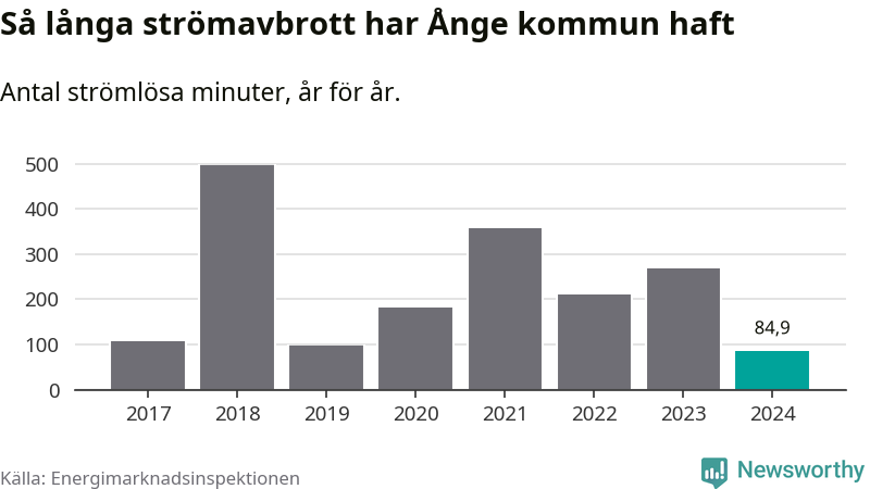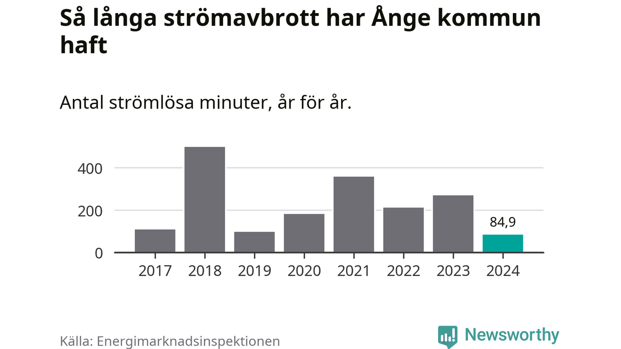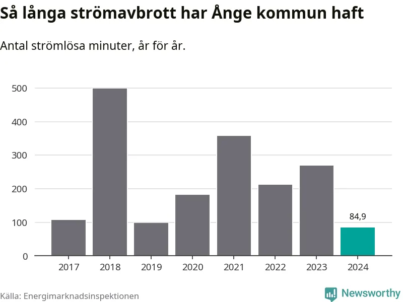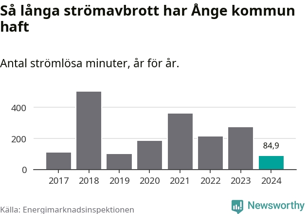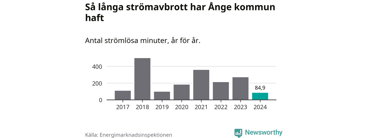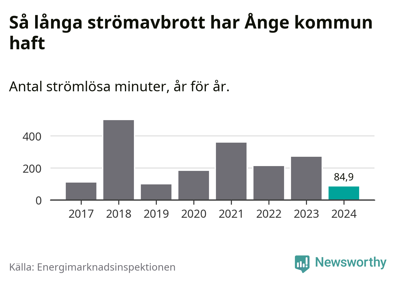 Antalet strömavbrott och total strömlös tid varierar från år till år i Ånge kommun. Mest tid utan ström (i alla fall under perioden 2017–2024) fick Ångeborna genomleva under 2018 – åtta timmar och 18 minuter. Det är fem timmar och ett minuter längre än under ett normalår.