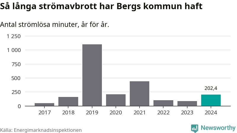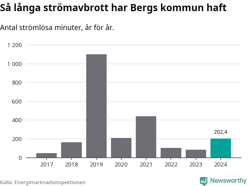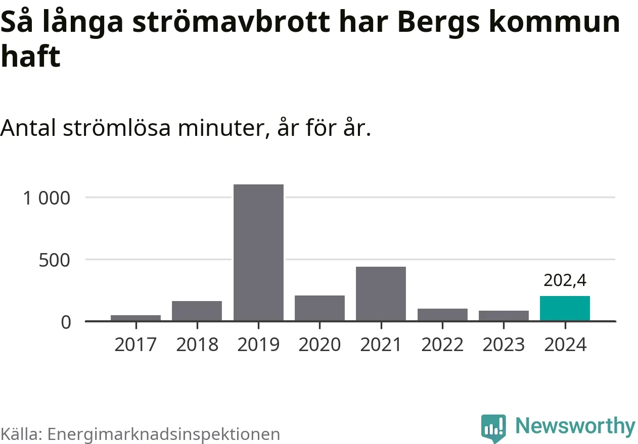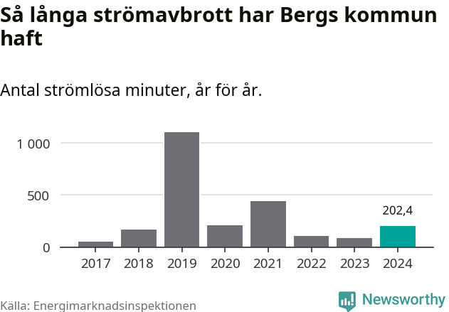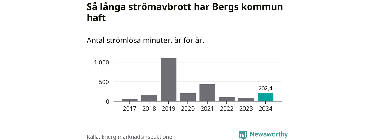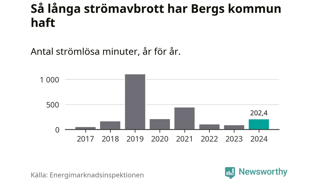 Antalet strömavbrott och total strömlös tid varierar från år till år i Bergs kommun. Mest tid utan ström (i alla fall under perioden 2017–2024) fick Bergsborna genomleva under 2019 – 18 timmar och 21 minuter. Det är 15 timmar och 18 minuter längre än under ett normalår.
