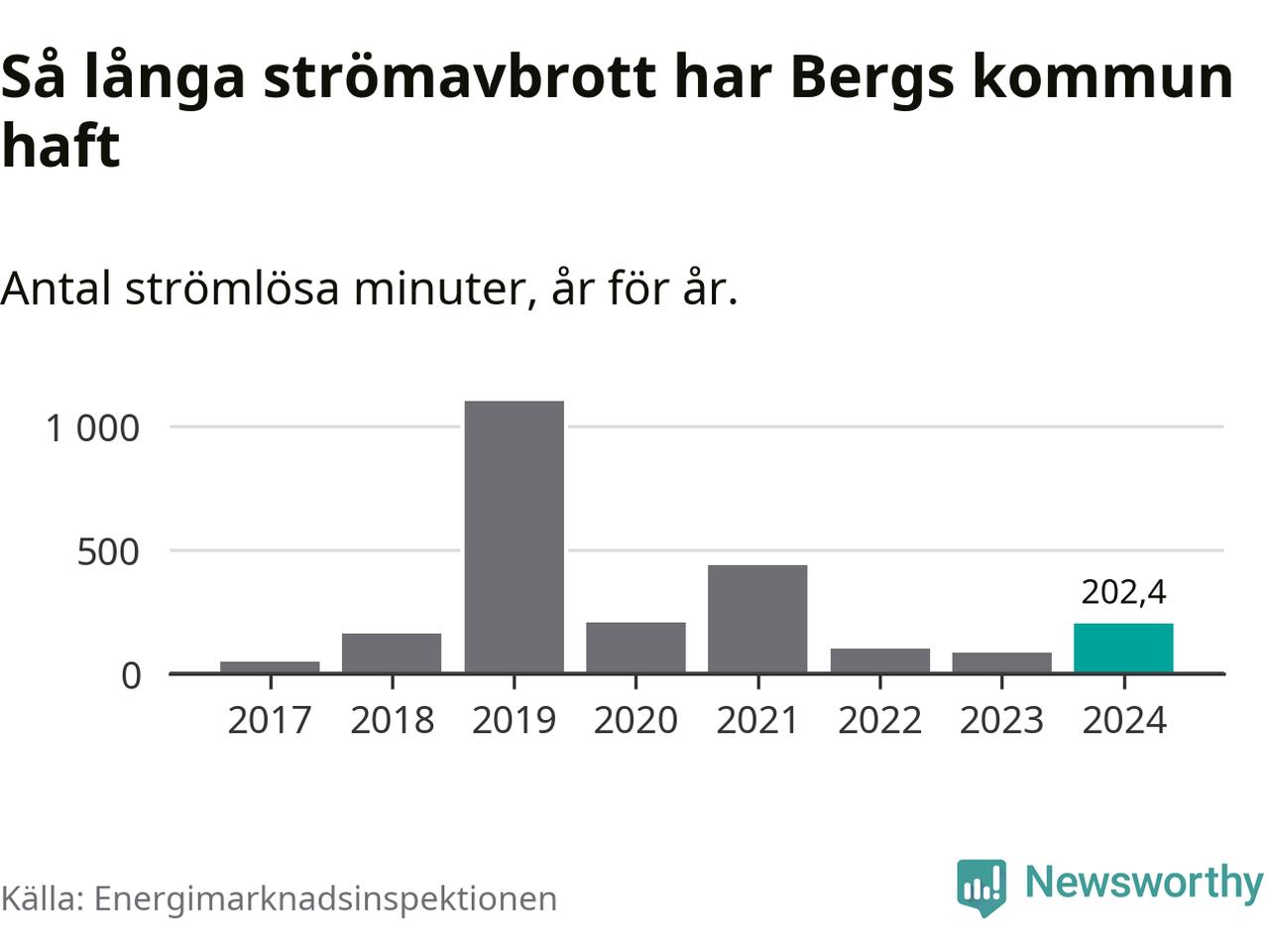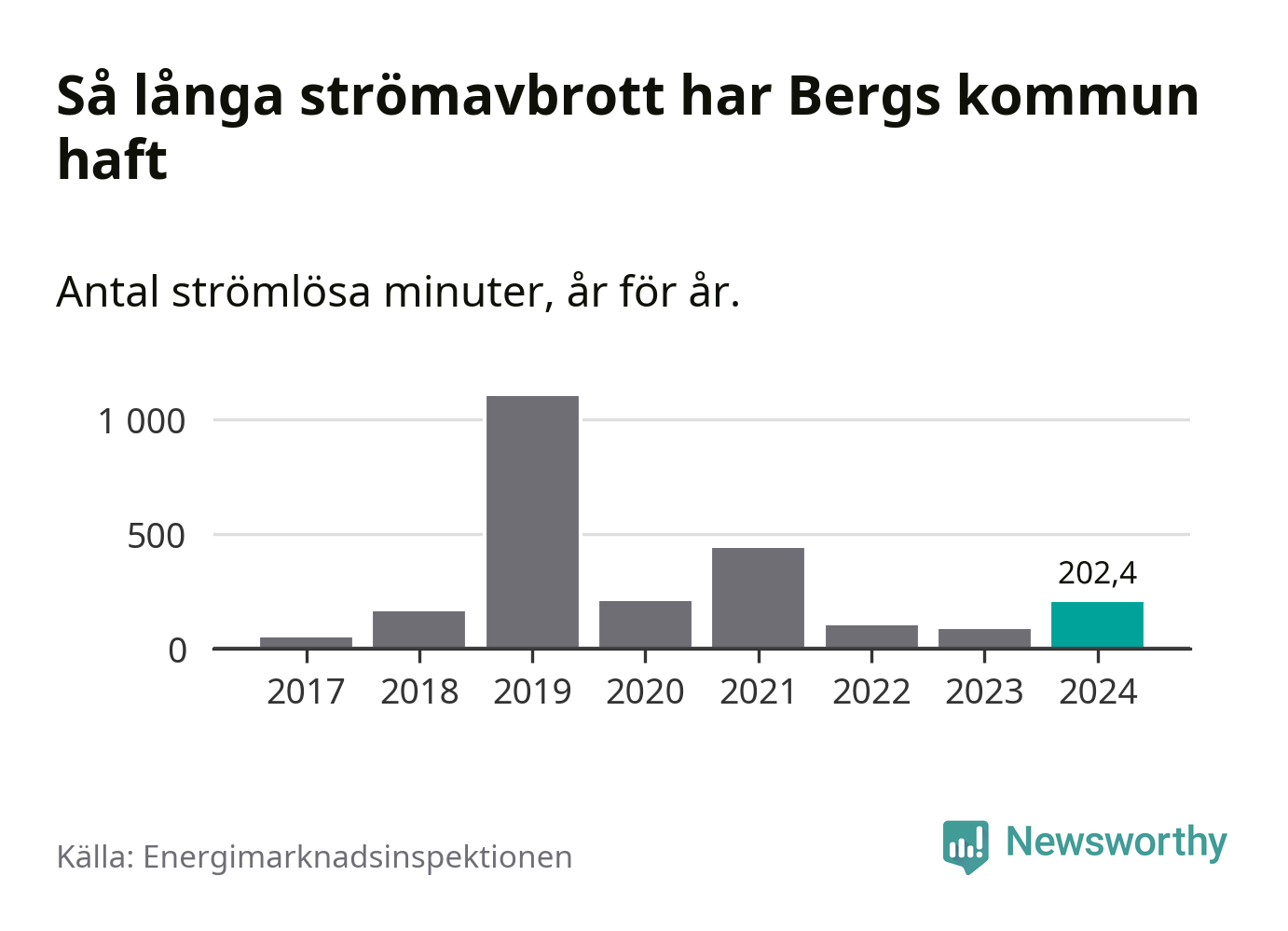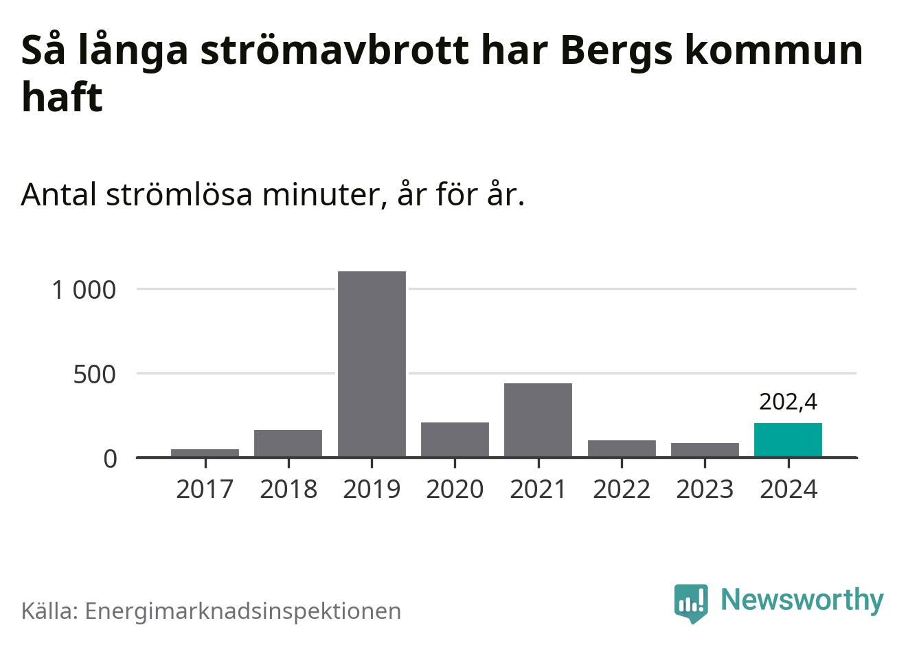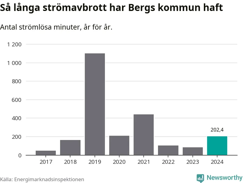Antalet strömavbrott och total strömlös tid varierar från år till år i Bergs kommun. Mest tid utan ström (i alla fall under perioden 2017–2024) fick Bergsborna genomleva under 2019 – 18 timmar och 21 minuter. Det är 15 timmar och 18 minuter längre än under ett normalår.