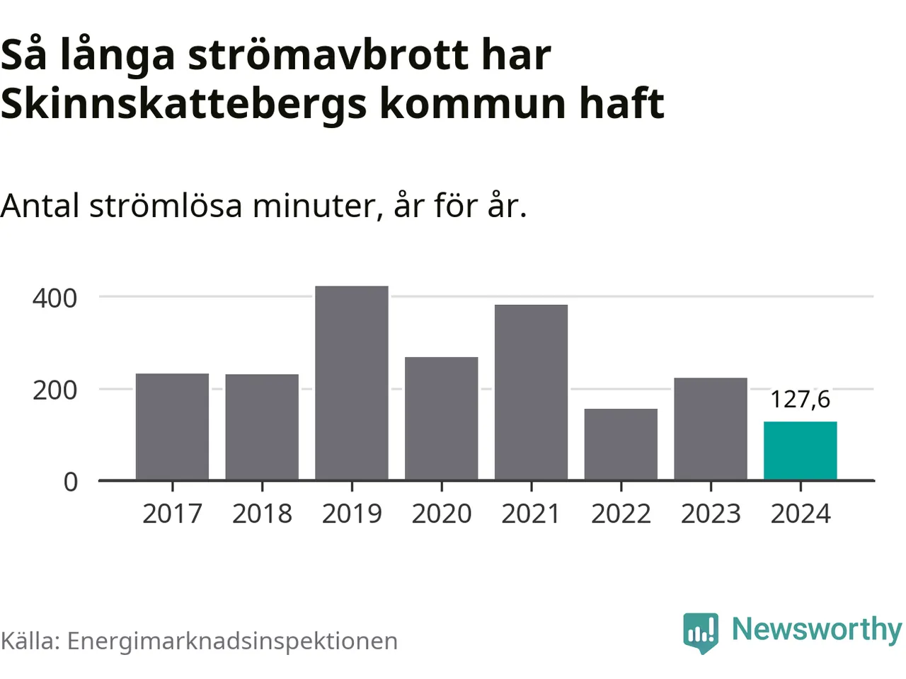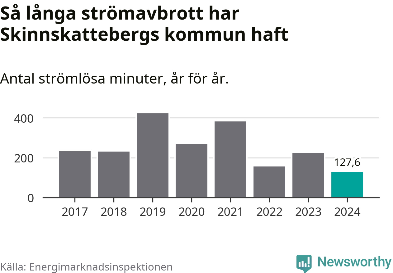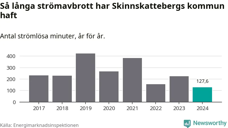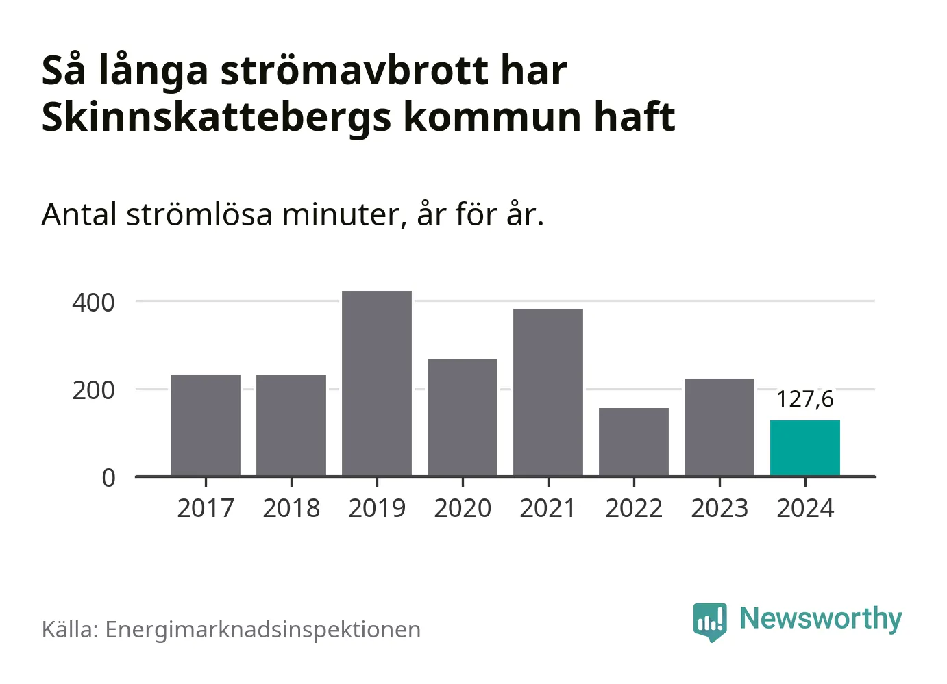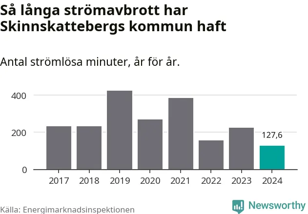 Antalet strömavbrott och total strömlös tid varierar något från år till år i Skinnskattebergs kommun. Mest tid utan ström (i alla fall under perioden 2017–2024) fick Skinnskattebergsborna genomleva under 2019 – sju timmar och tre minuter. Det är tre timmar och elva minuter längre än under ett normalår.